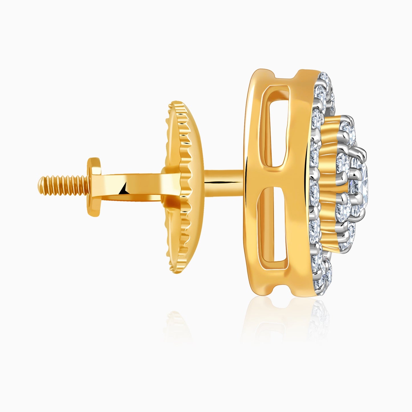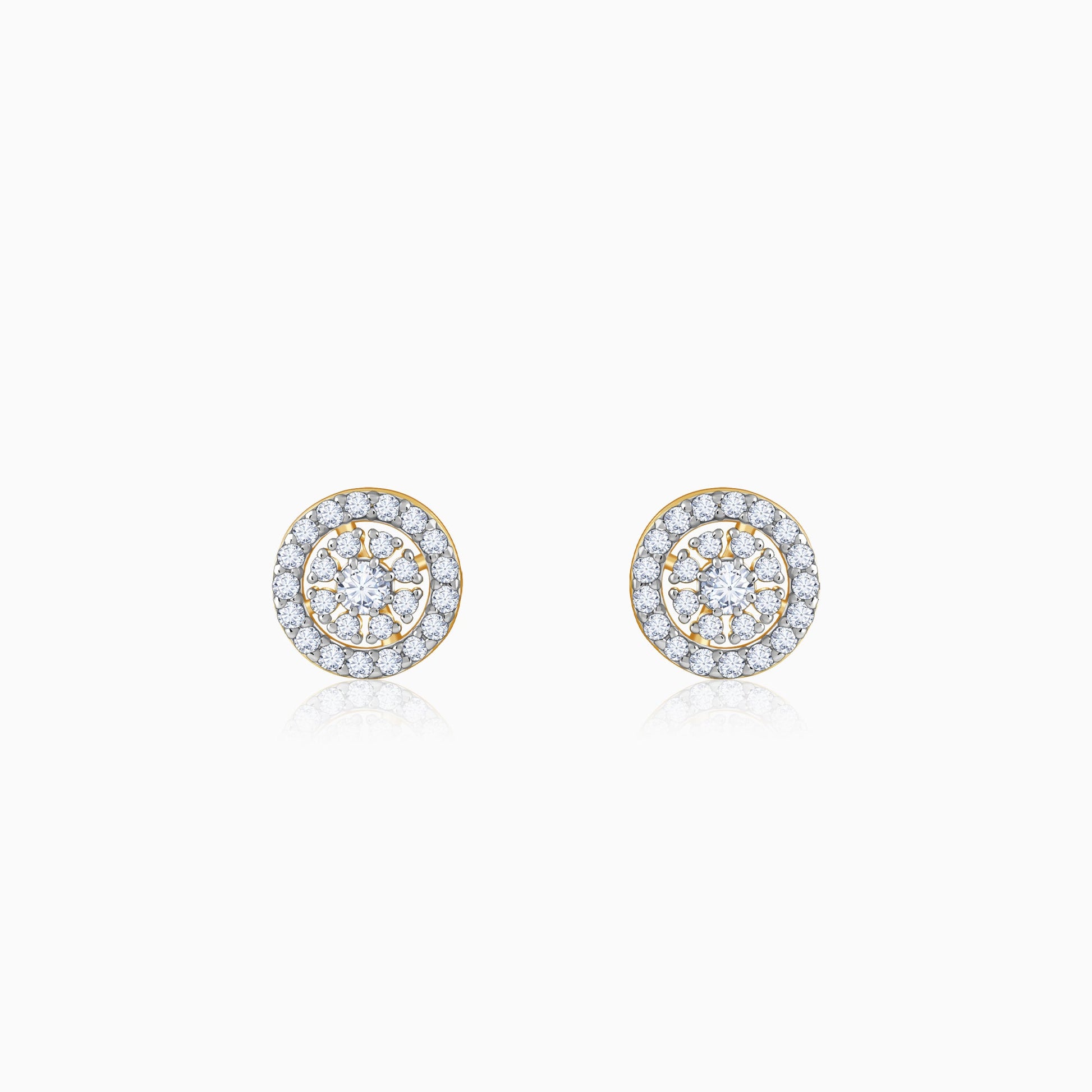These gold earring for women features a dazzling double halo design with lab grown diamonds encircling a radiant starburst centre.