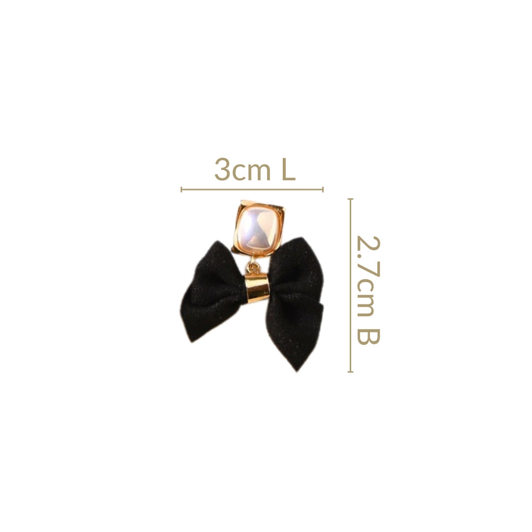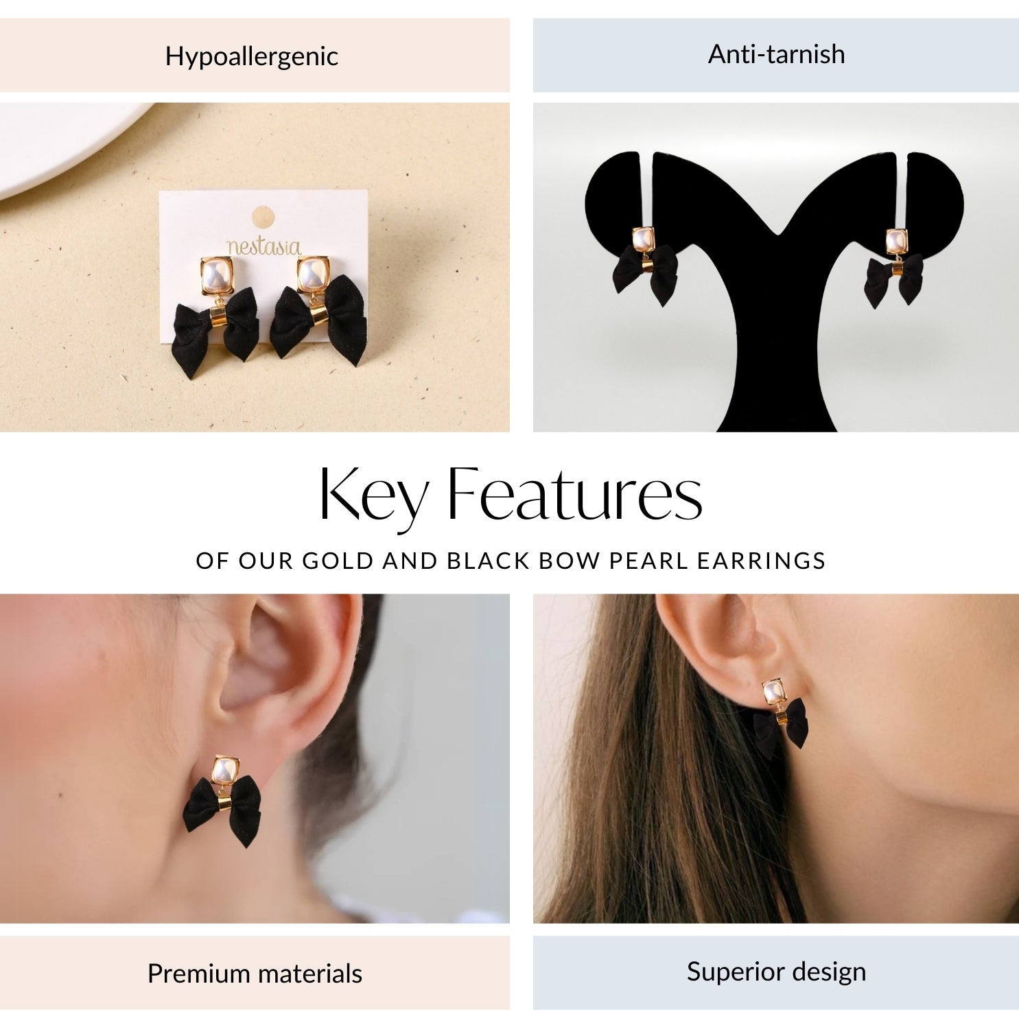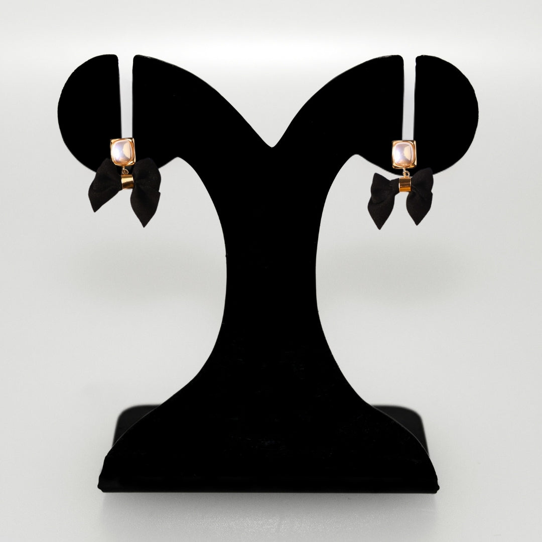 Add a touch of elegance with a playful twist to your accessory collection. These bow earrings feature a lustrous faux pearl framed in gold for a timeless appeal. Complementing the pearl is a soft black polyester bow, bringing a chic and contemporary vibe to the design.
