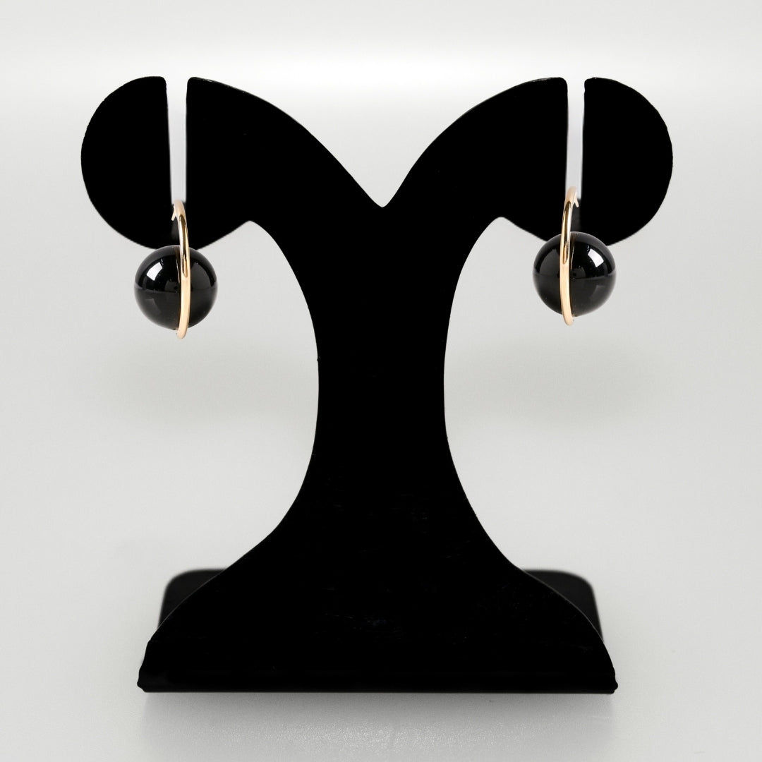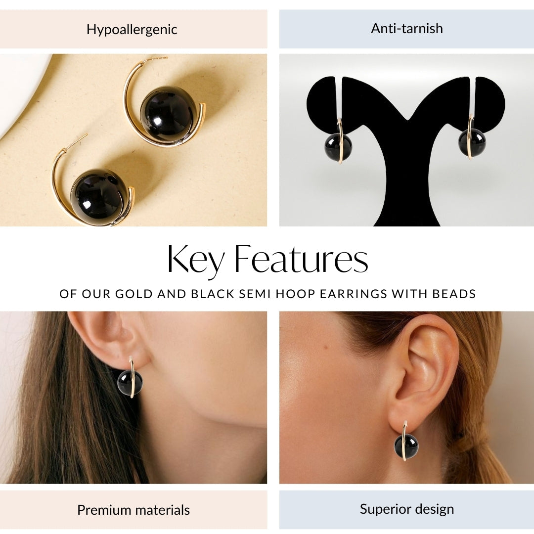 Make a bold statement with these semi-hoop earrings, crafted from sleek golden metal. A striking black PVC orb rests gracefully on the hoop, adding a modern and edgy touch. Simple yet eye-catching, these earrings are the perfect balance of elegance and contemporary style.