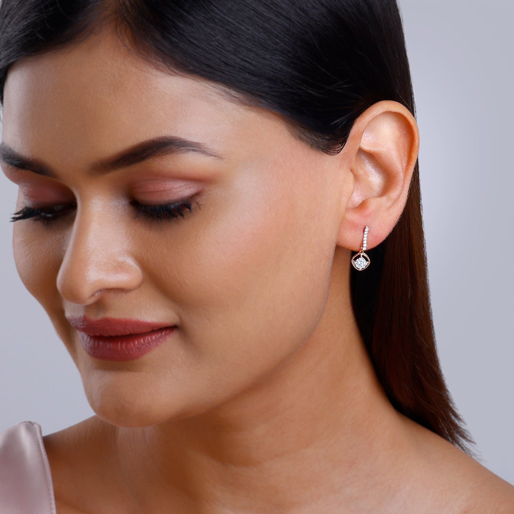 These pure rose gold earrings have a square studded with lab-grown diamonds.