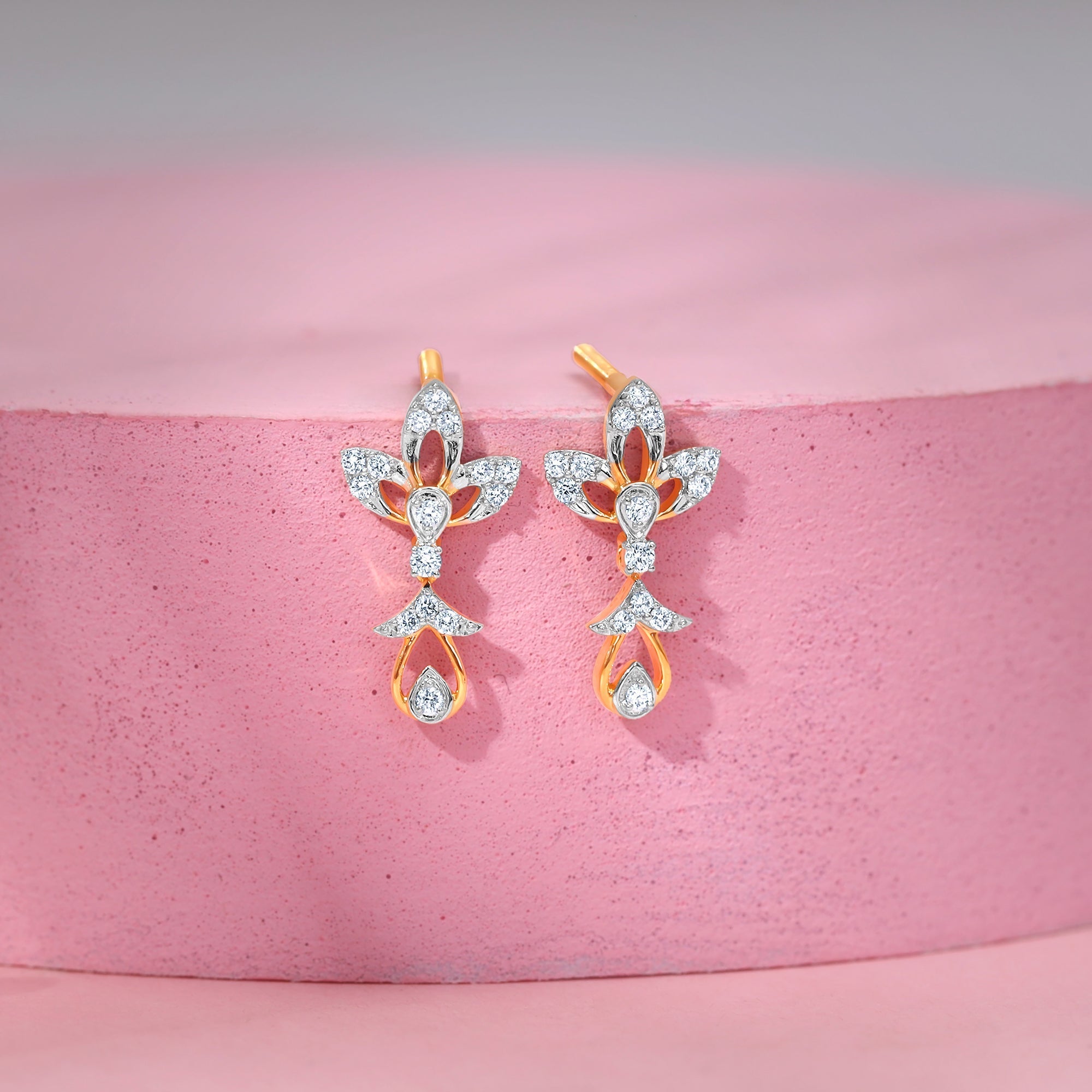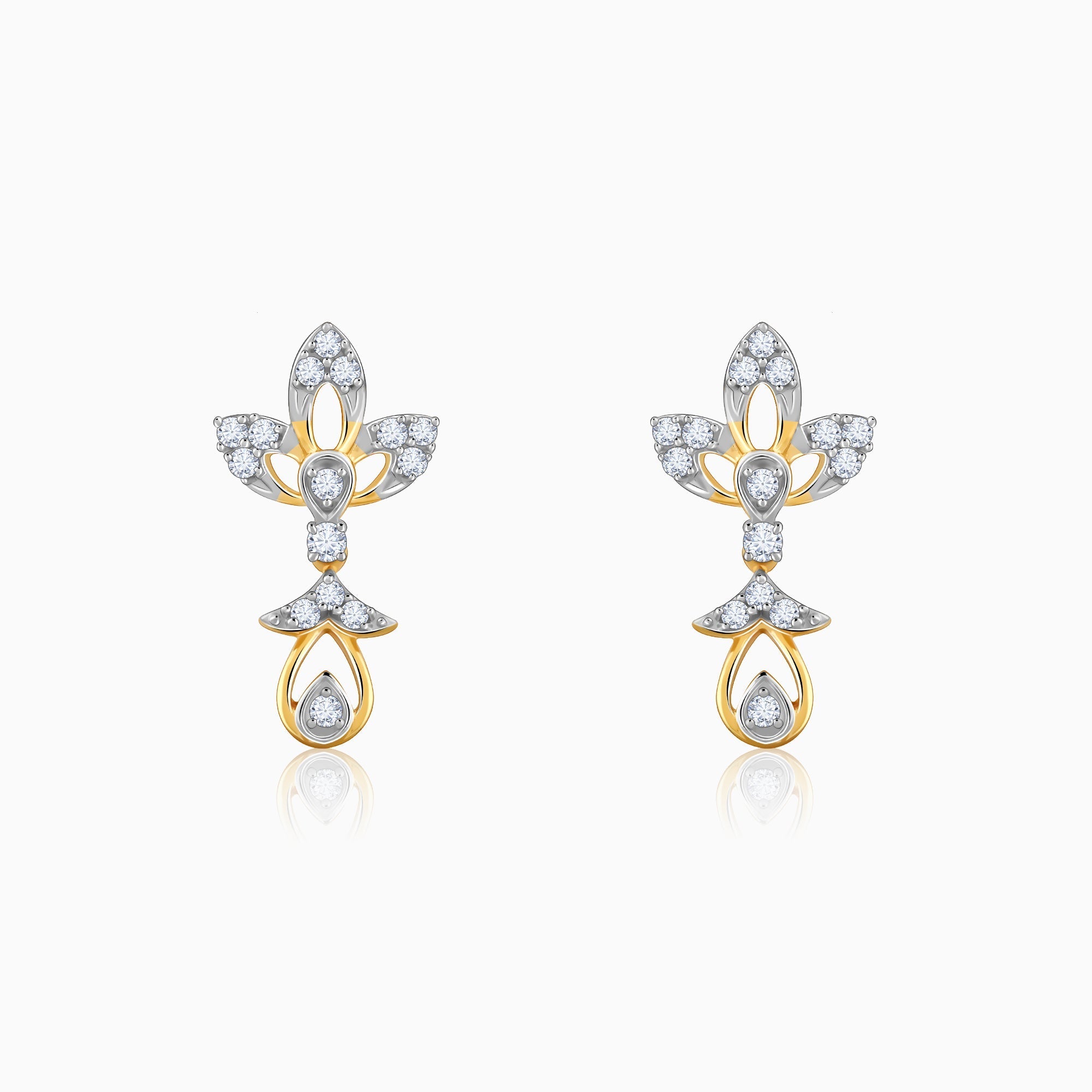 These pure gold earrings feature an asymmetrical, flowing flower design with a dangling drop motif set with sparkling lab grown diamonds.