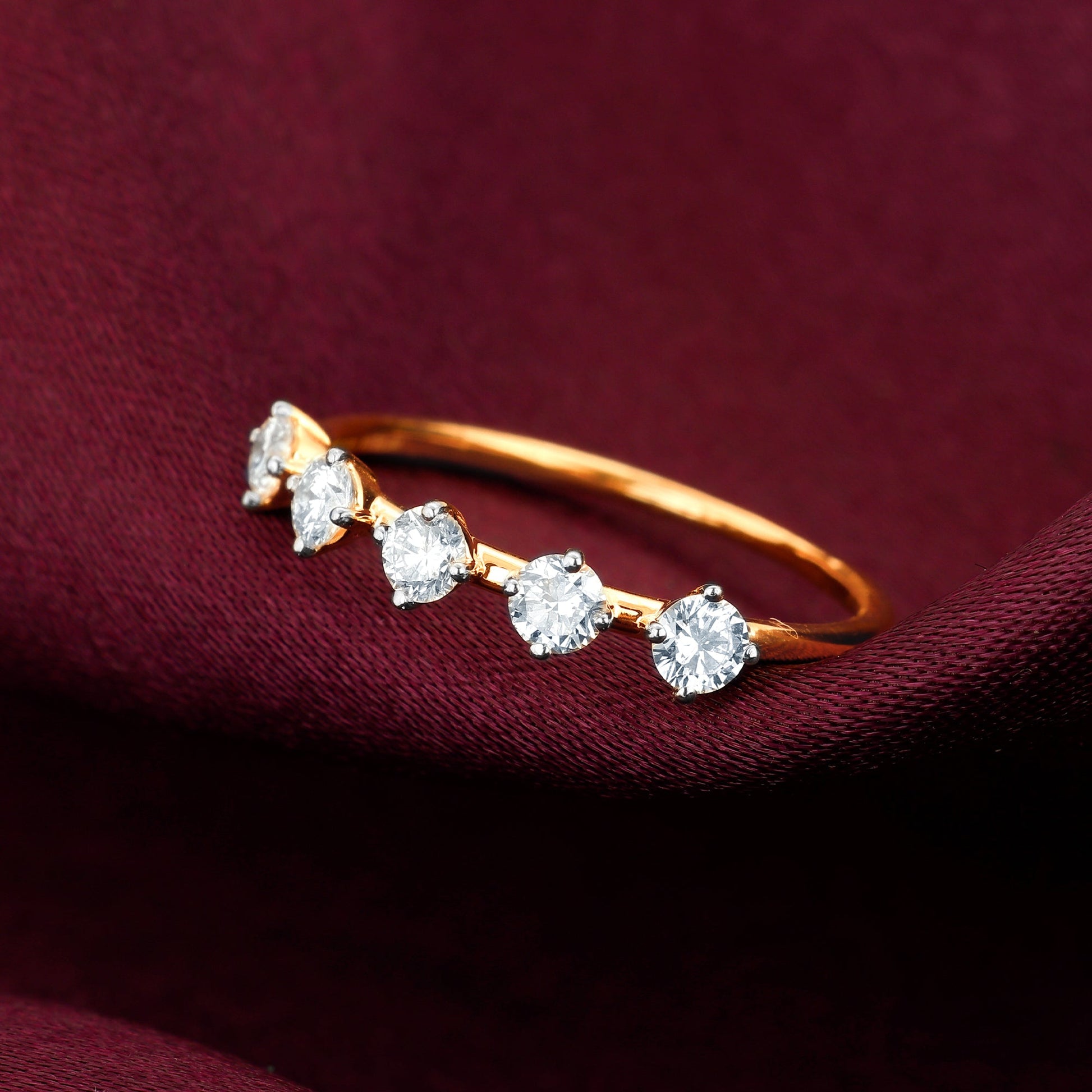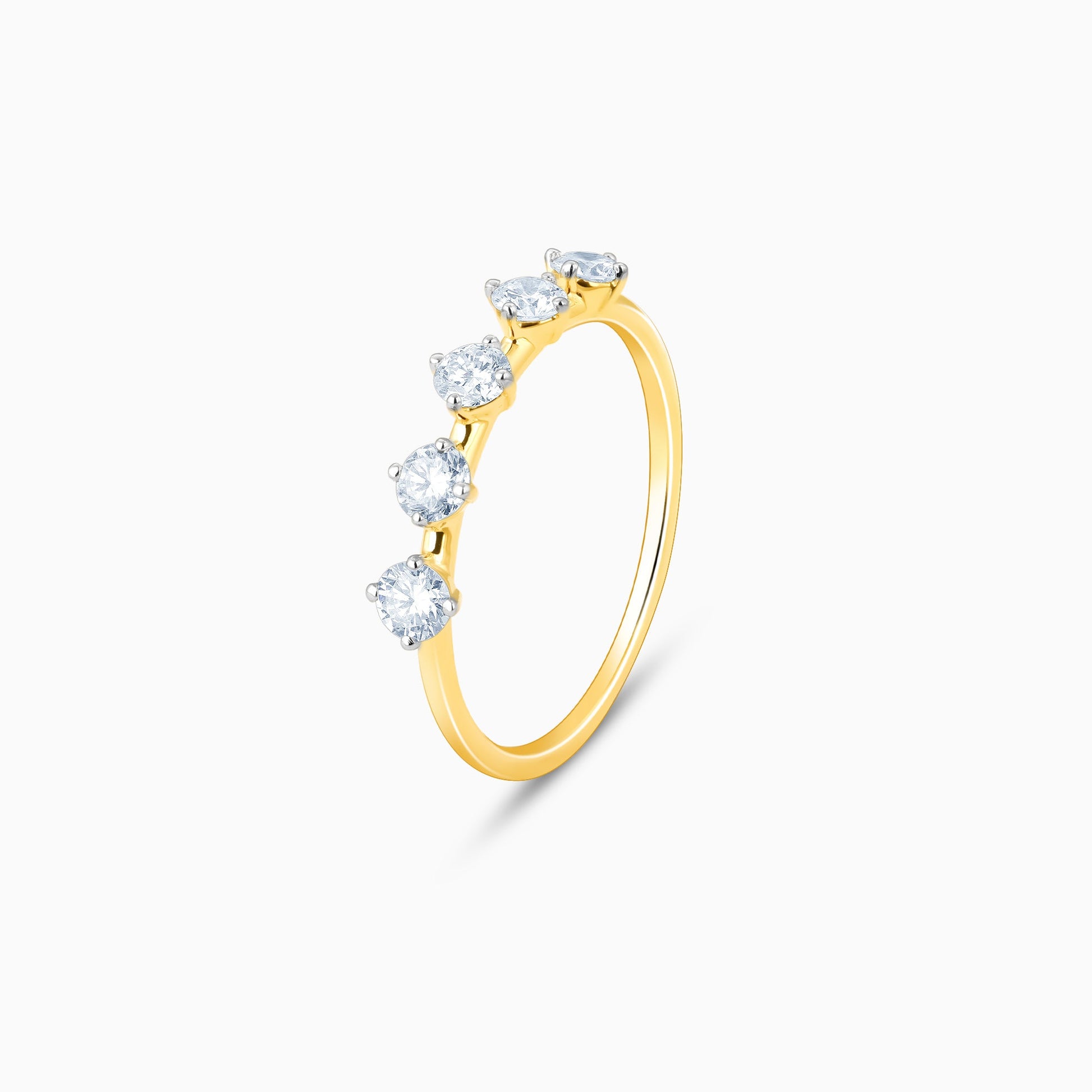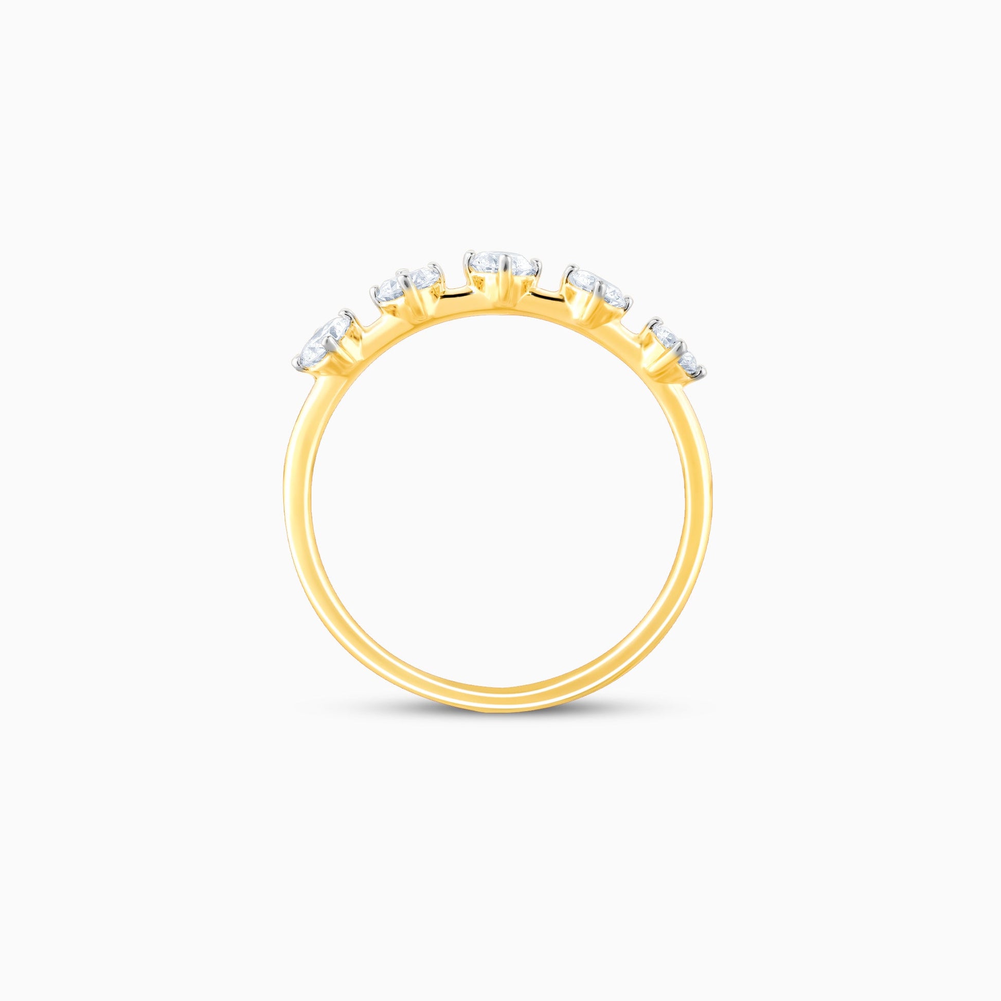 This gold ring has a gorgeous design with five lab-grown diamonds spaced out in the front.