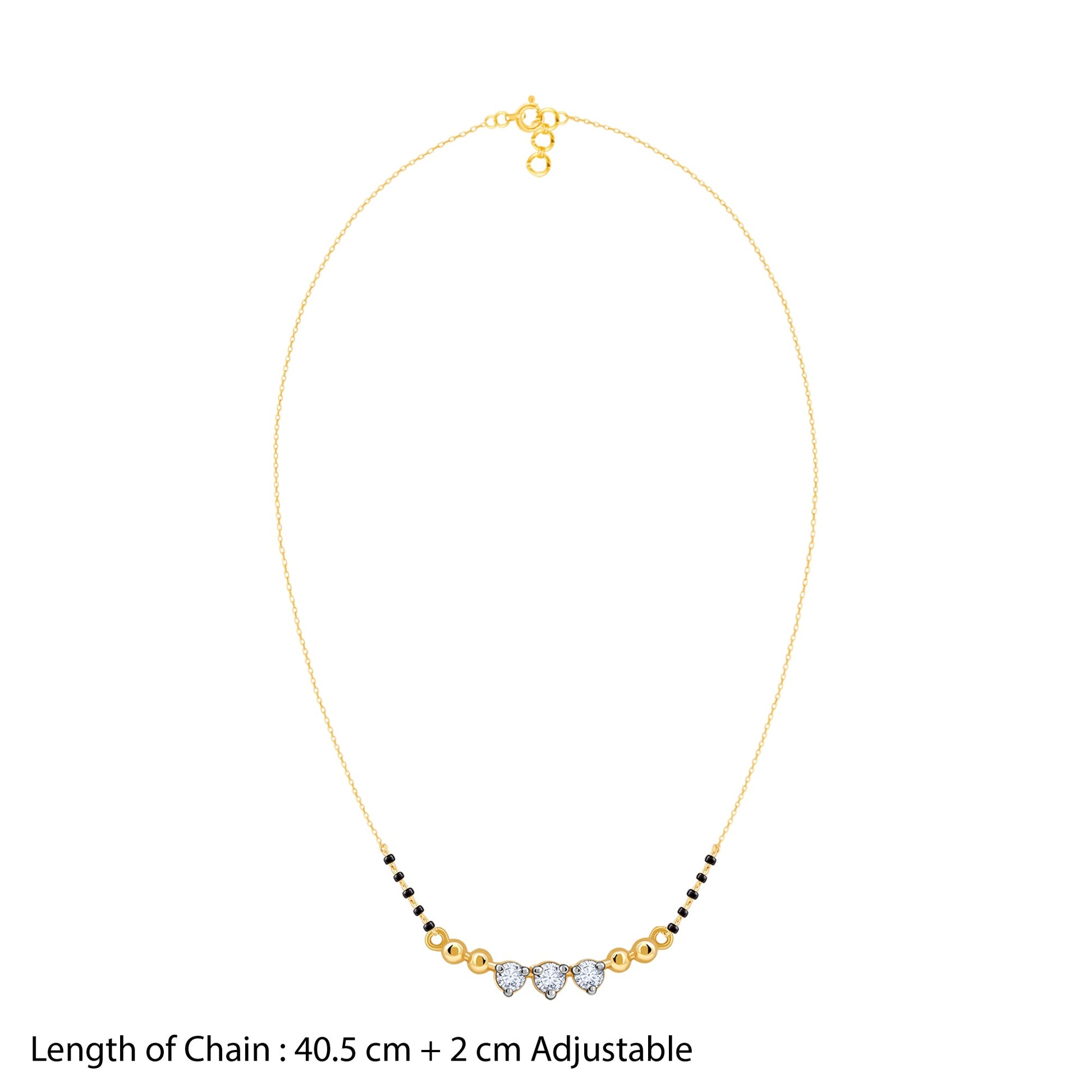 This pure gold mangalsutra for women features traditional black beads interspersed along the chain, leading to a central pendant with three heart-shaped lab grown diamonds.