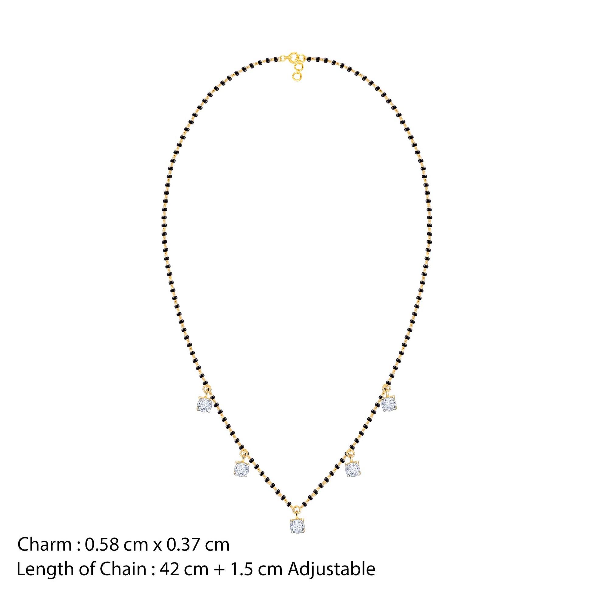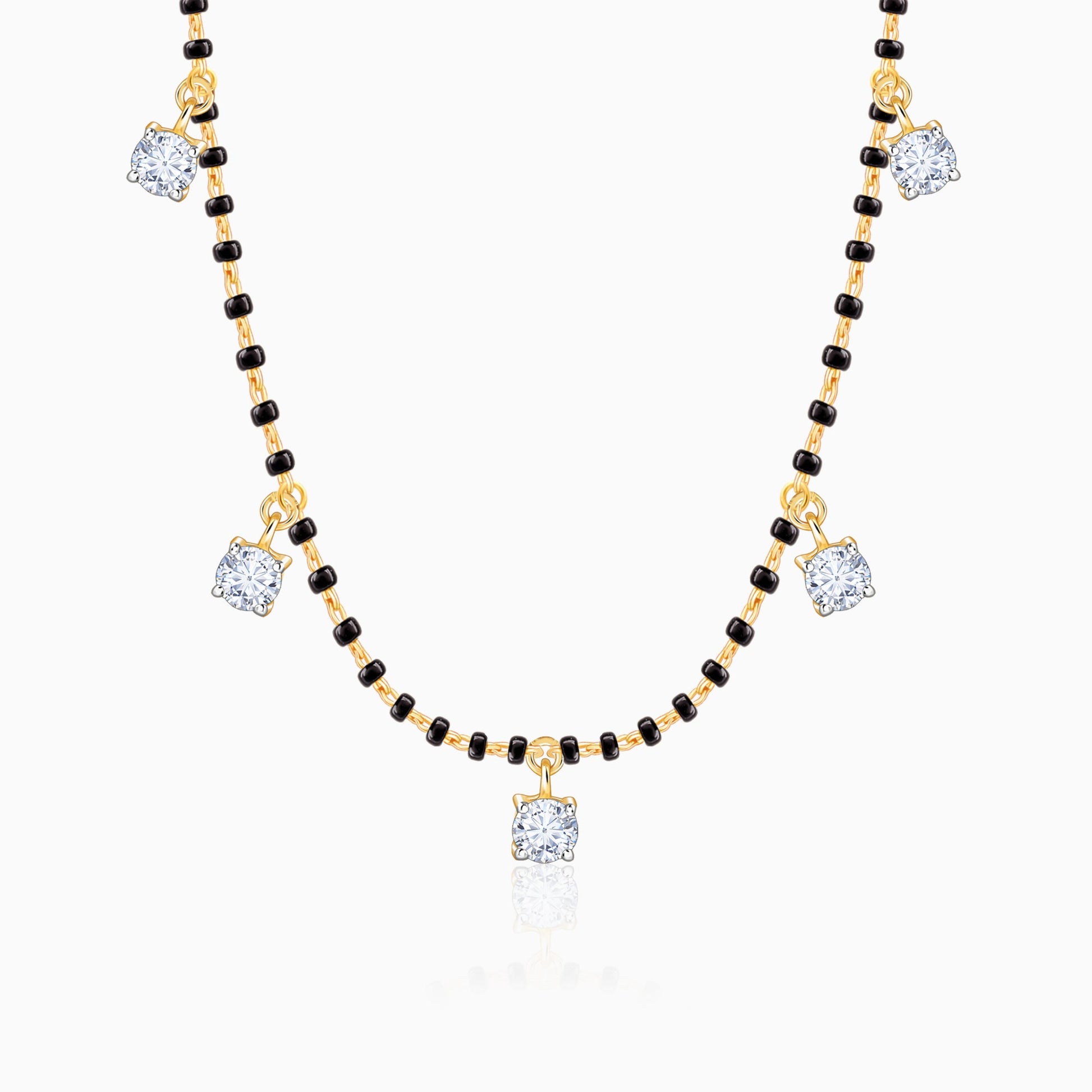 This pure gold mangalsutra for women features black beads along the chain, accented with evenly spaced dangling lab grown diamonds.