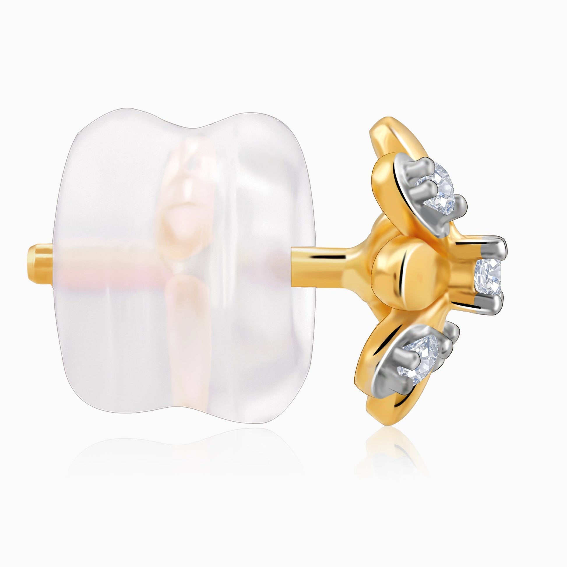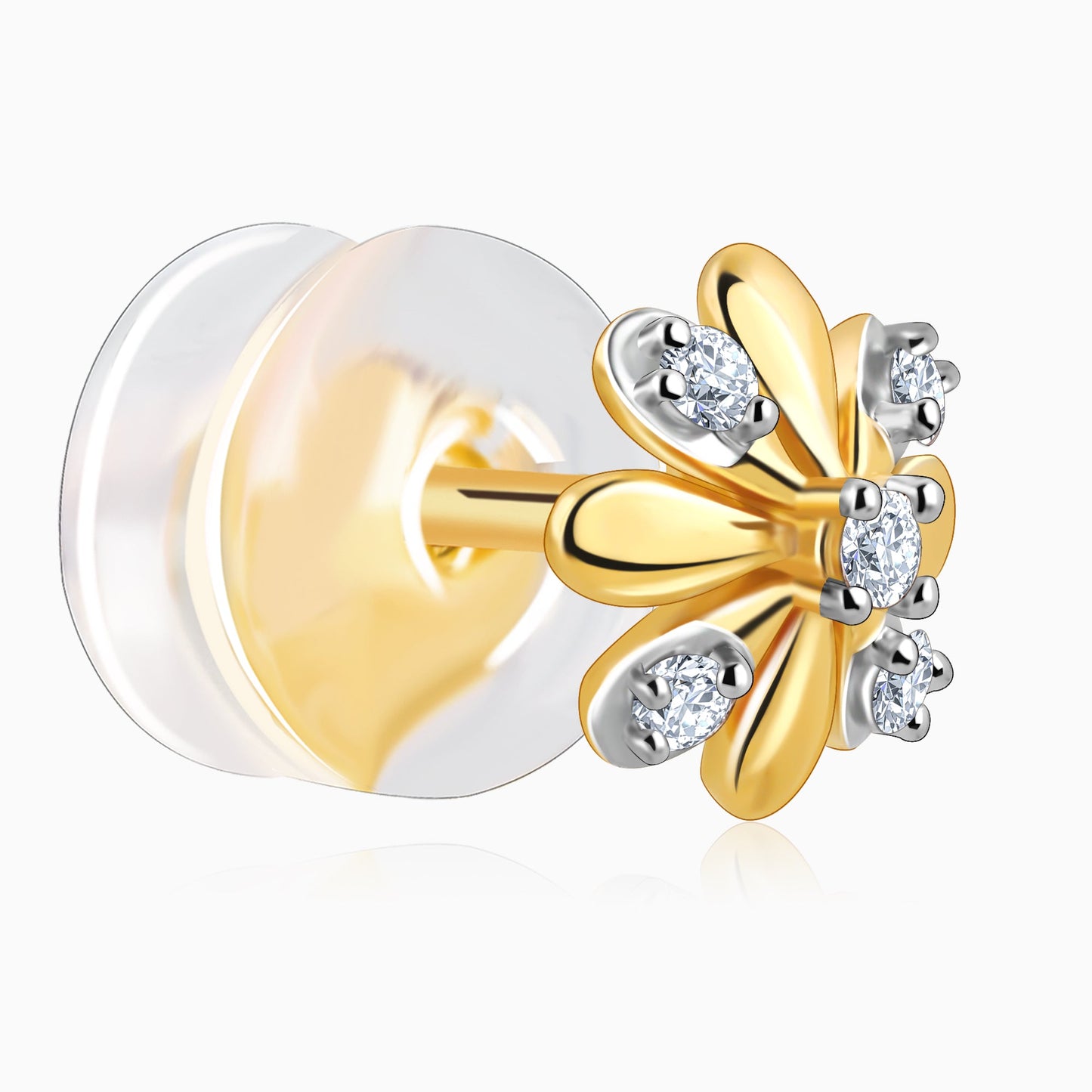 These gold stud earrings feature a floral design, studded with lab-grown diamonds in their alternate petals.