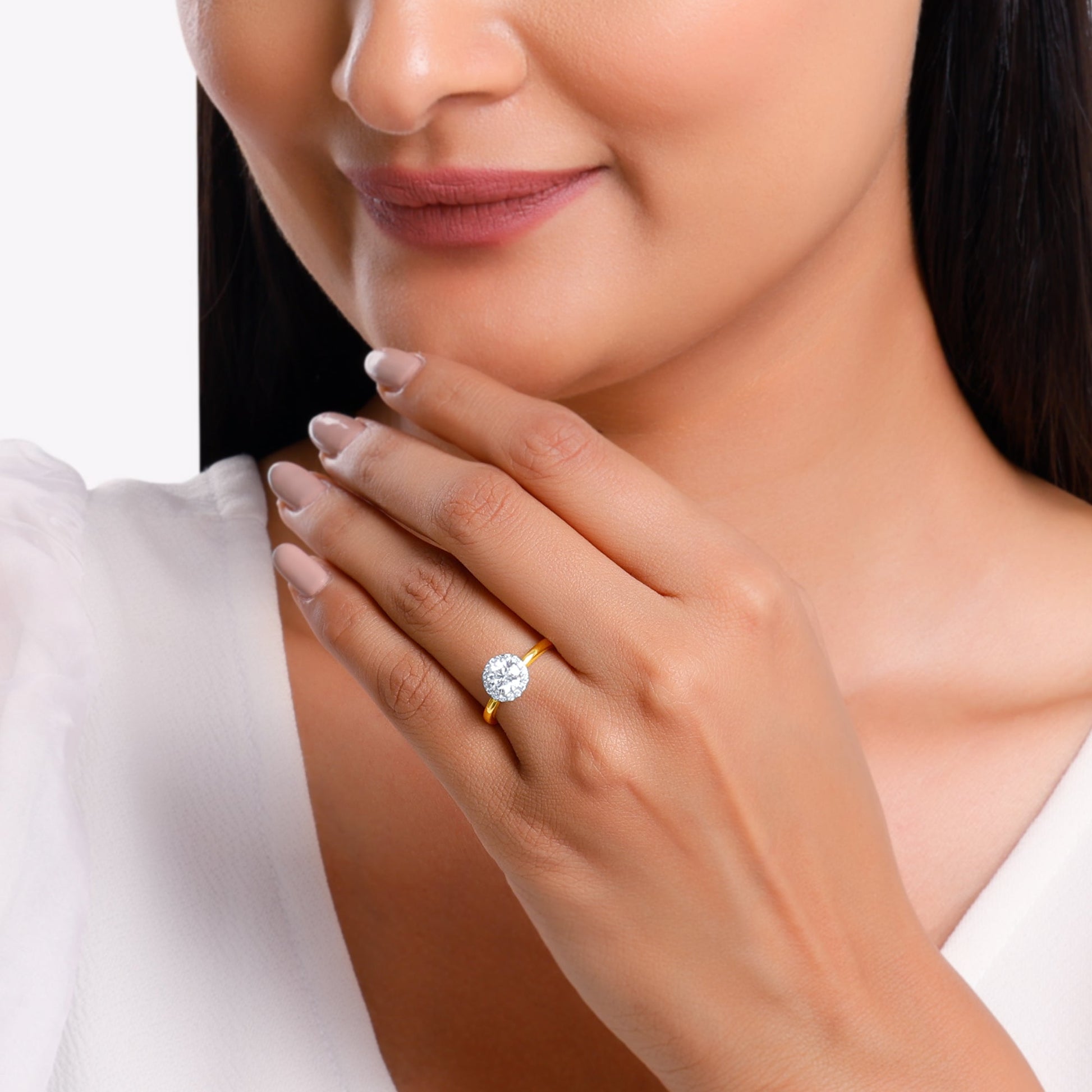 This pure gold ring for women features a large lab grown diamond at its centre, surrounded by a halo of smaller lab grown diamonds.