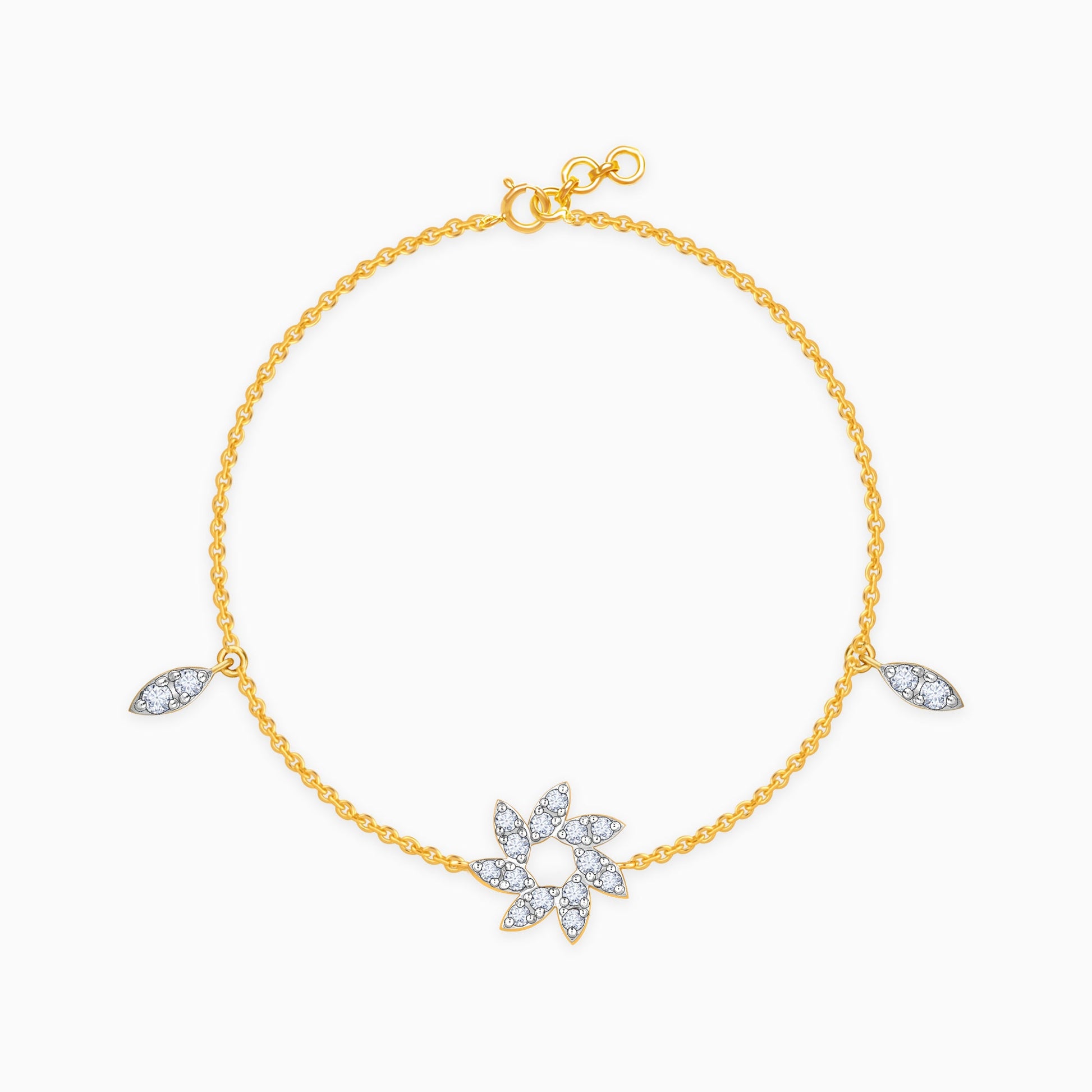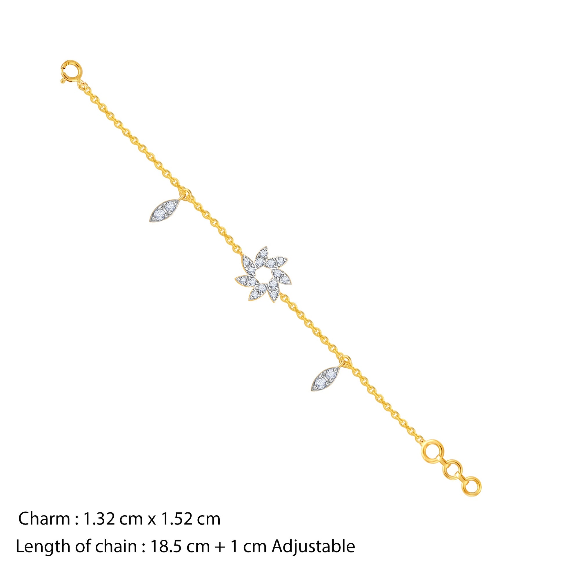 This minimal bracelet features a lab diamond-studded floral motif with two petal charms on the bracelet chain.