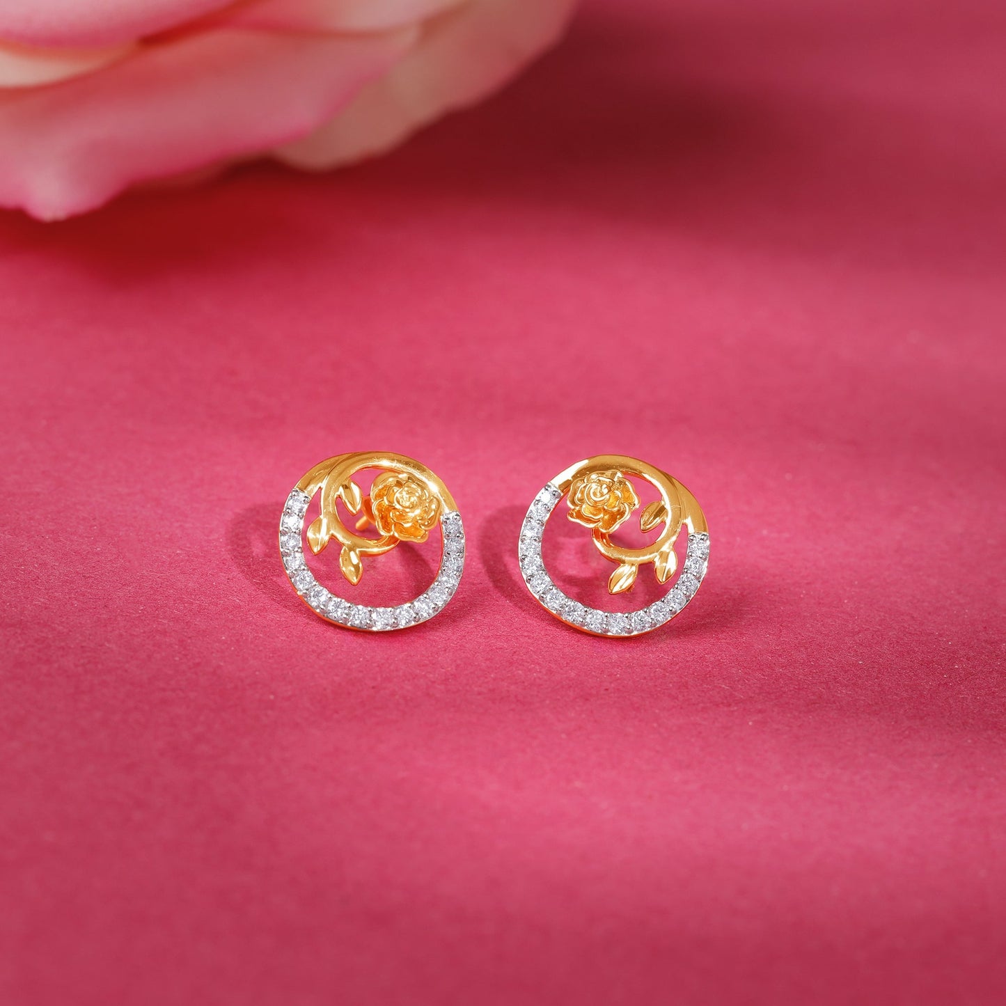 These gold earrings for women feature an open circle half adorned with lab grown diamonds. At the centre, a sculpted rose adds a touch of bold elegance.
