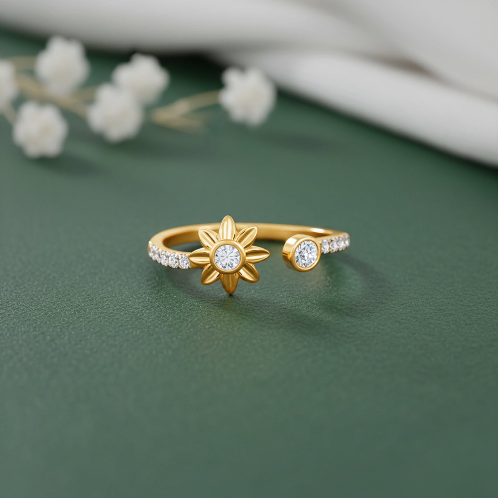 This gold ring features a flower with a lab grown diamond at its centre and a sparkling diamond at the band’s end, creating a graceful, nature-inspired design. Try the exquisite lab grown diamond jewellery from Heer By Trendy Freak today.