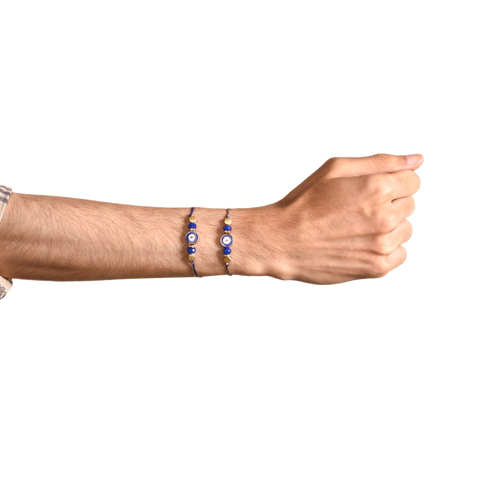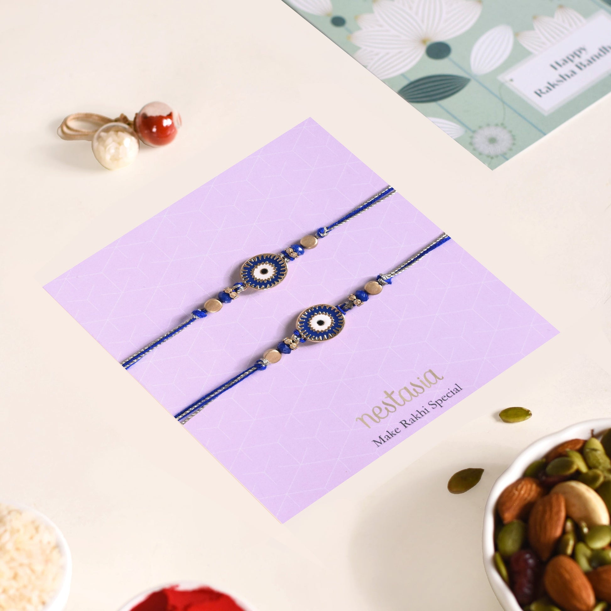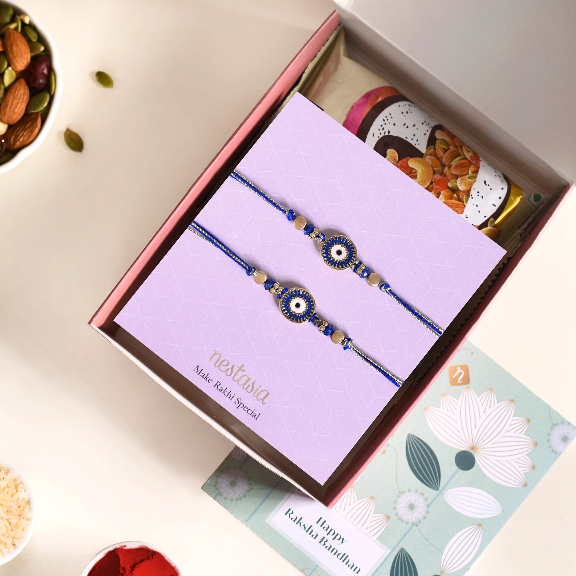 Filled with many fun, delightful surprises, the gift box features a set of 2 Rakhis, with each showcasing an arrangement of gold discs, rich navy blue beads, gold rings studded with crystals, and a captivating evil eye charm to ward off negative energy. Complemented by a reusable roli-chawal set, a packet of dry fruits, and a wish card, our Rakhi gift box is a great way to add a festive flair to the auspicious occasion.