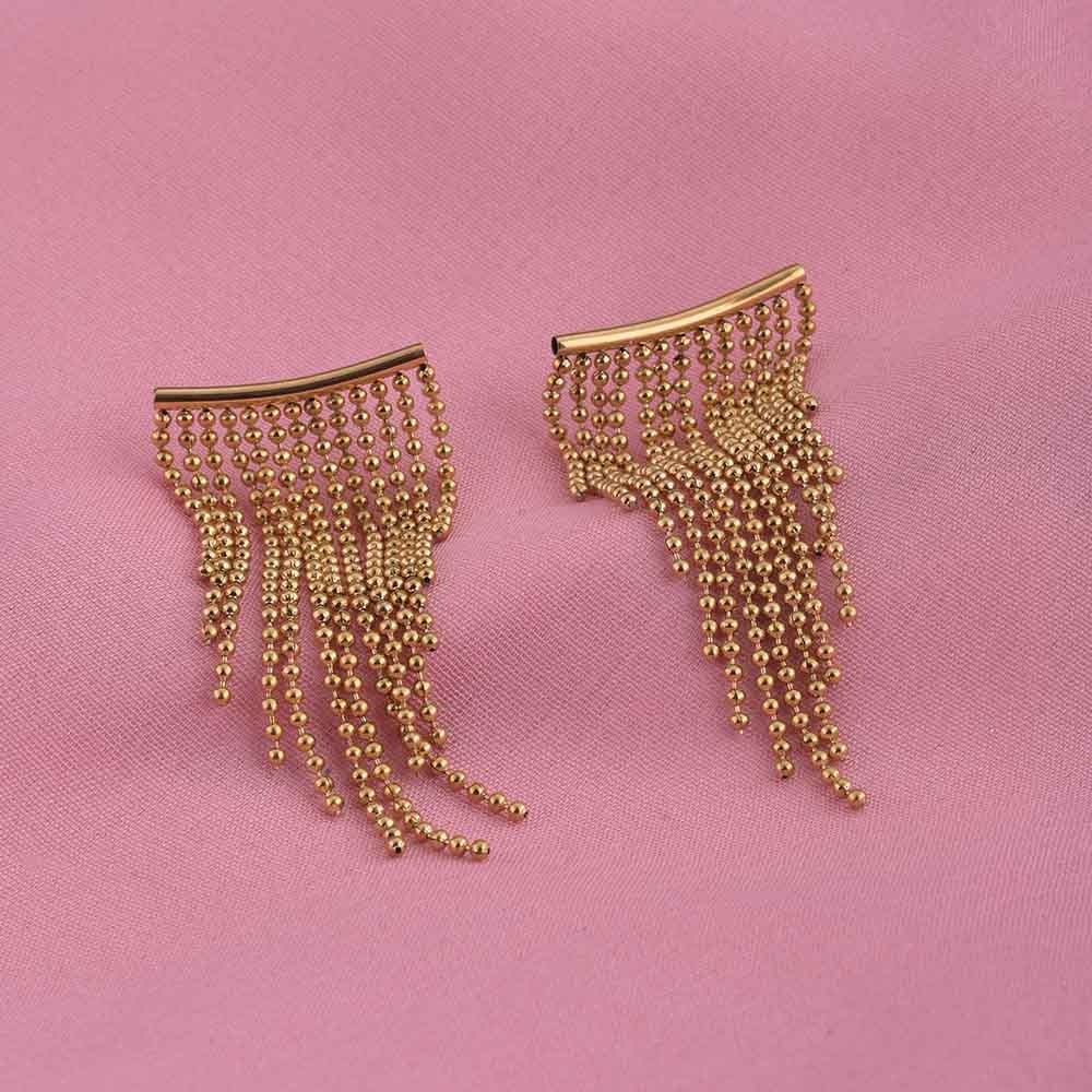 Sophisticated and dynamic, these 18k gold plated gold chain drop earrings feature fluid chains that create movement and catch the light beautifully. The sleek gold tone adds a luxurious touch to any outfit, while the waterproof and anti-tarnish finish ensures lasting shine. Perfect for both casual elegance and evening glamour, these earrings elevate your jewellery collection effortlessly.