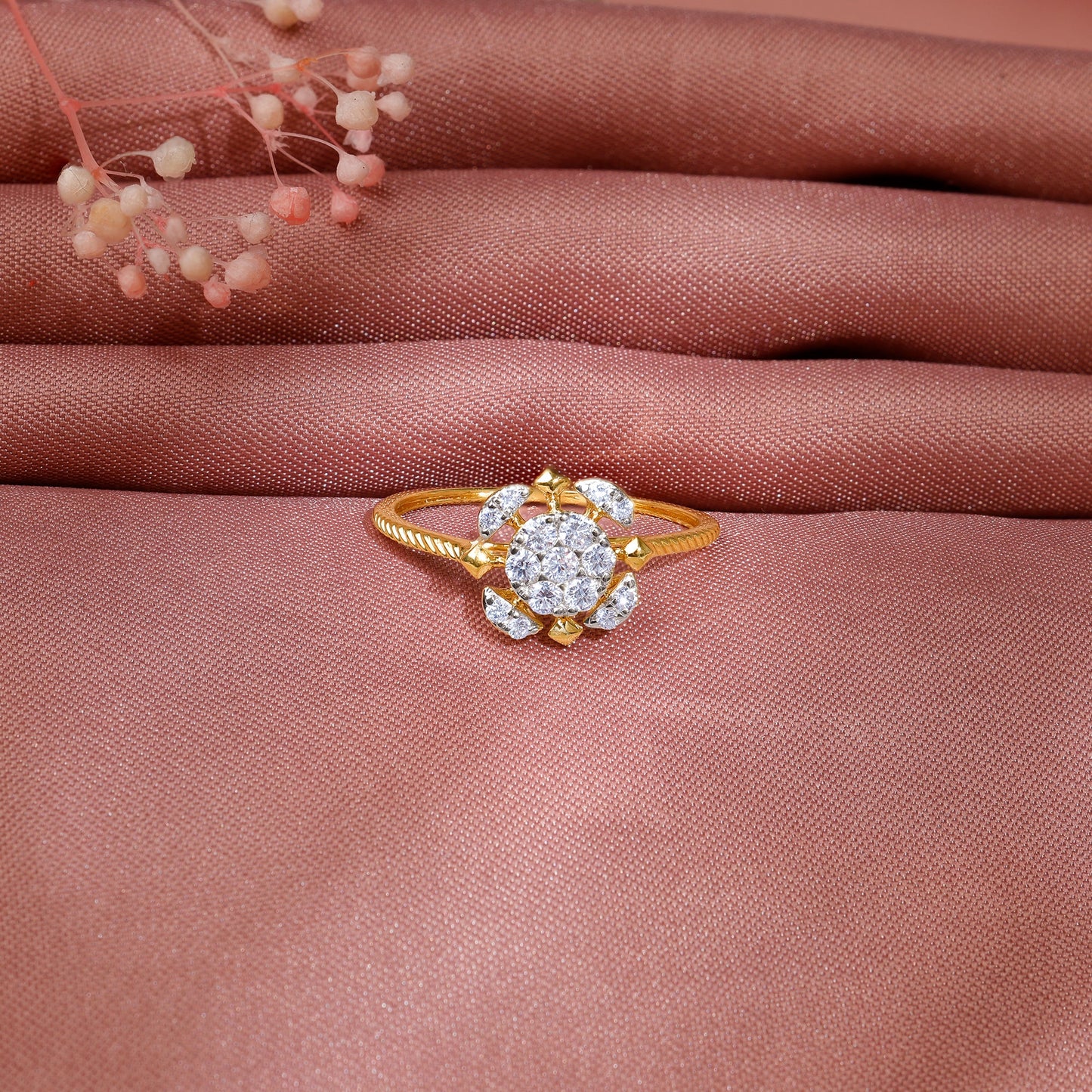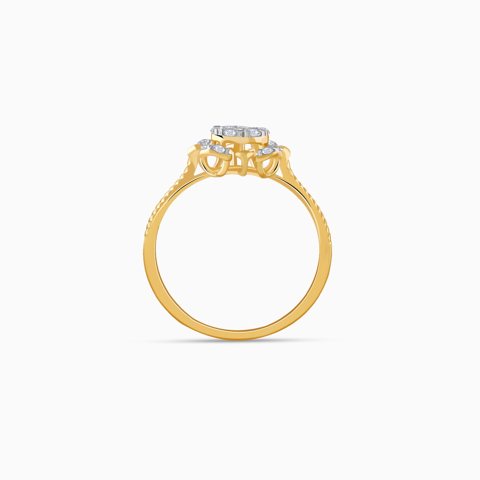 This pure gold ring for women features a central floral design studded with lab grown diamonds. It is bordered by four semi-circular lab diamond accents.