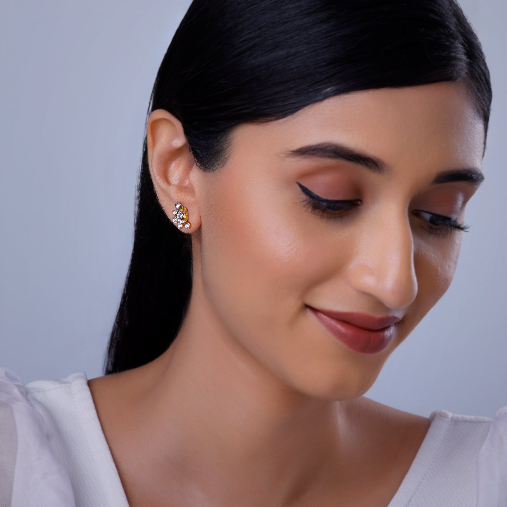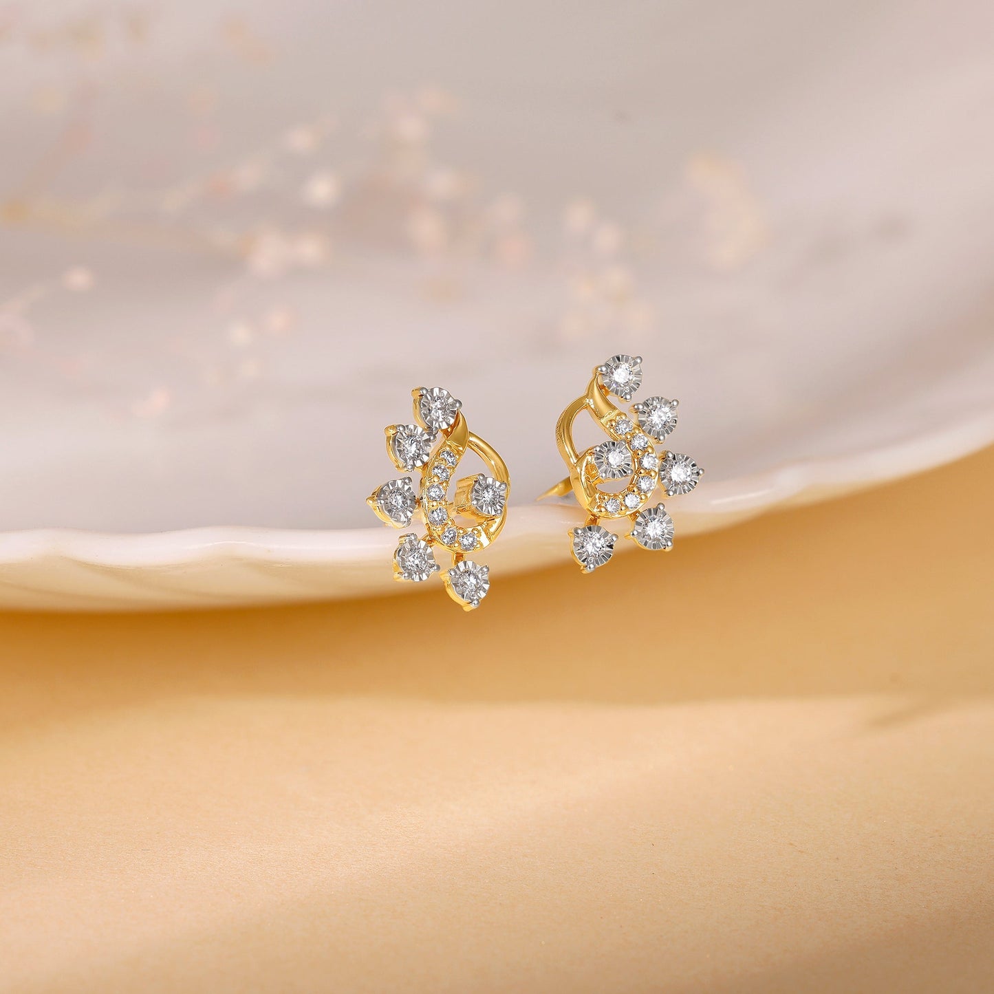 These pure gold earrings feature a cluster of diamonds set in a unique, asymmetrical floral pattern, making them modern and eye-catching.