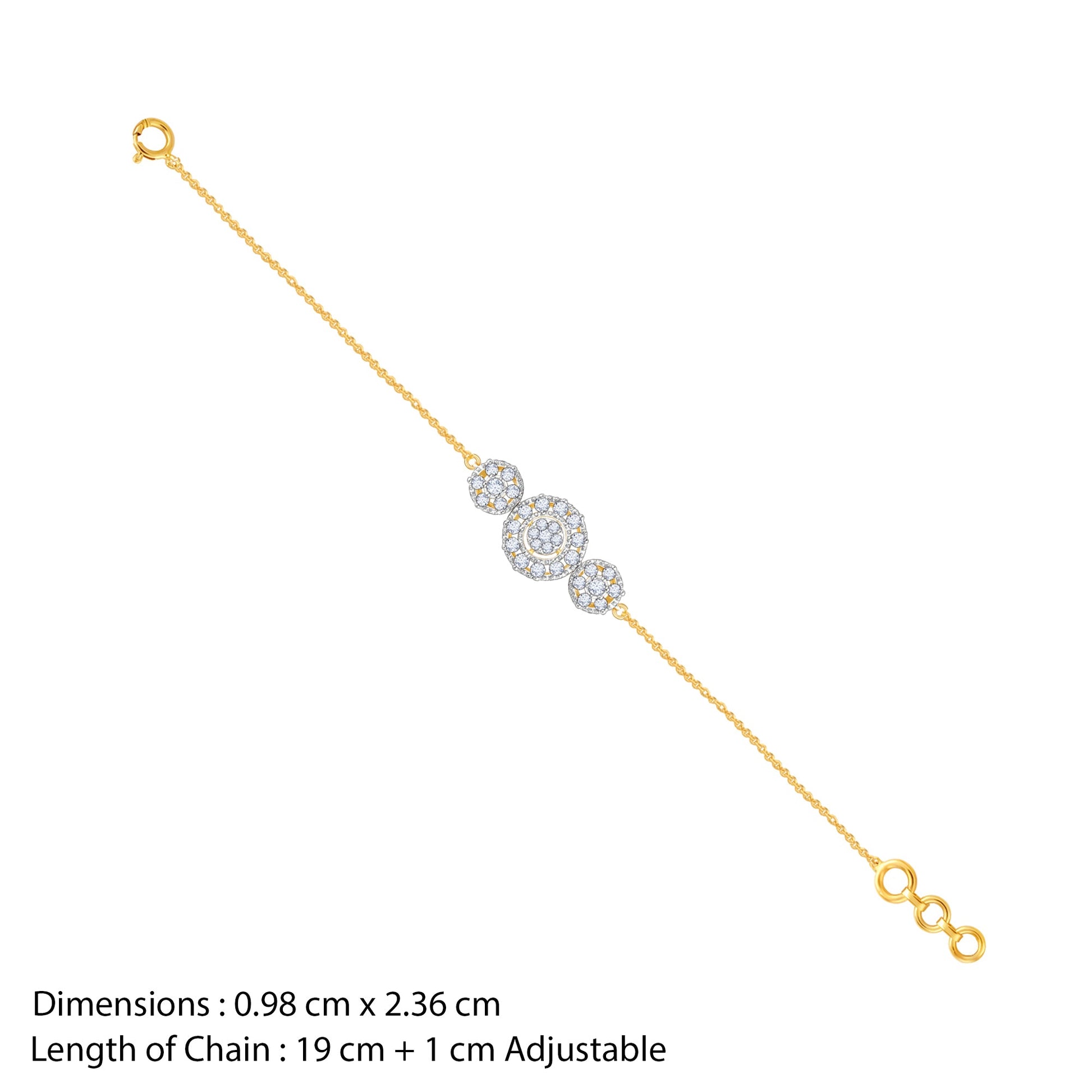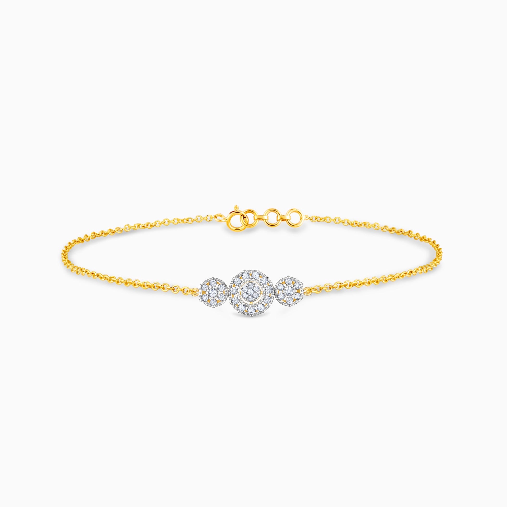 This pure gold bracelet features a circle motif at the centre, with two flower designs on both sides, studded with lab-grown diamonds.