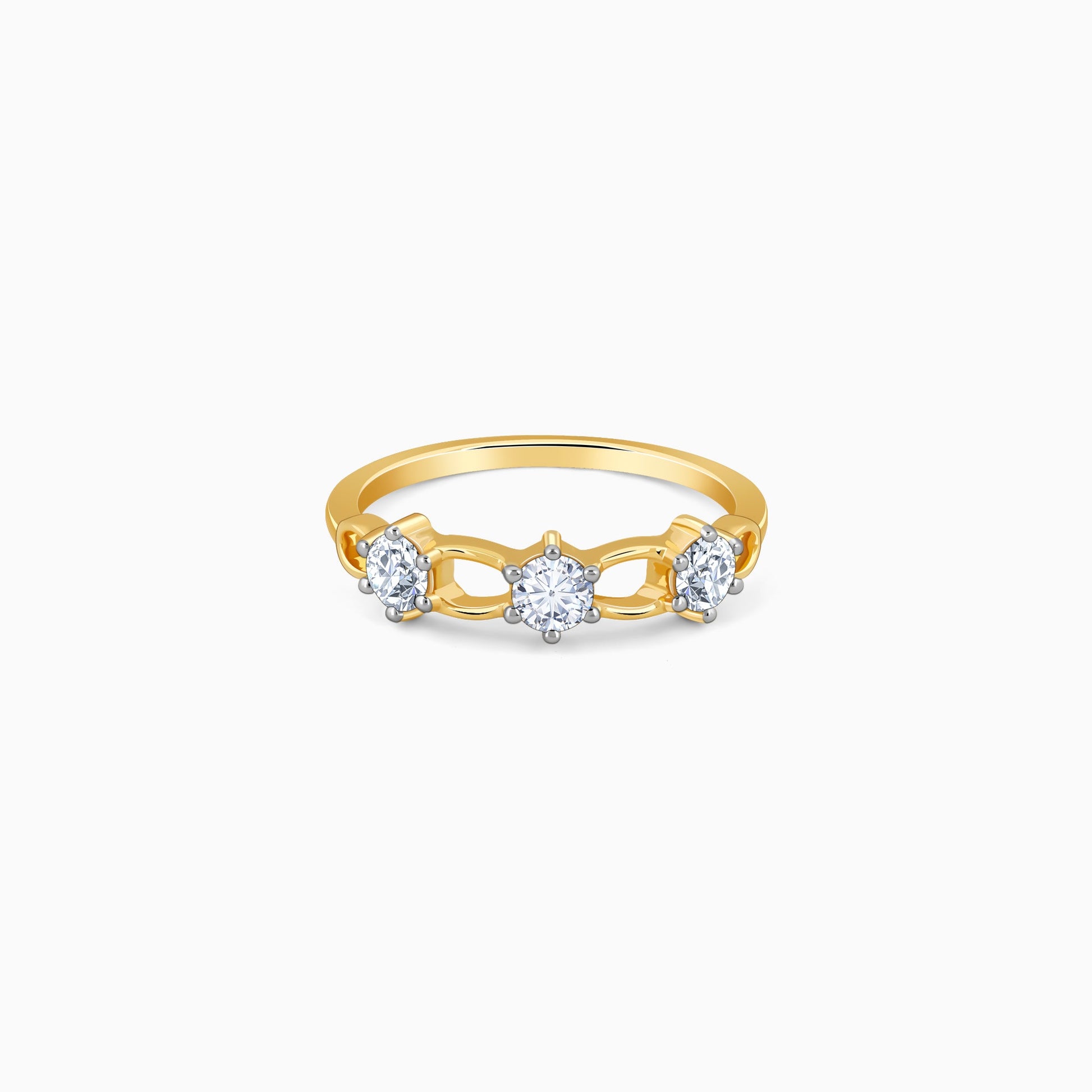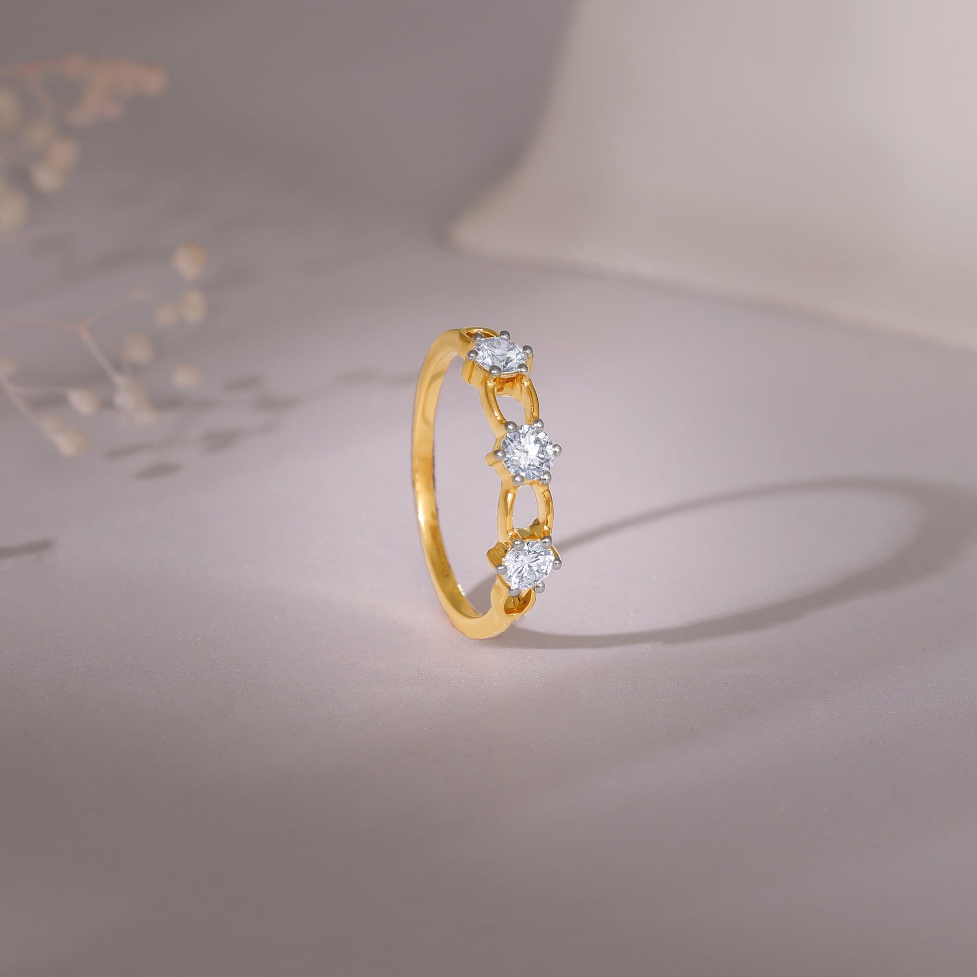This pure gold ring features three lab grown diamonds connected by prongs.