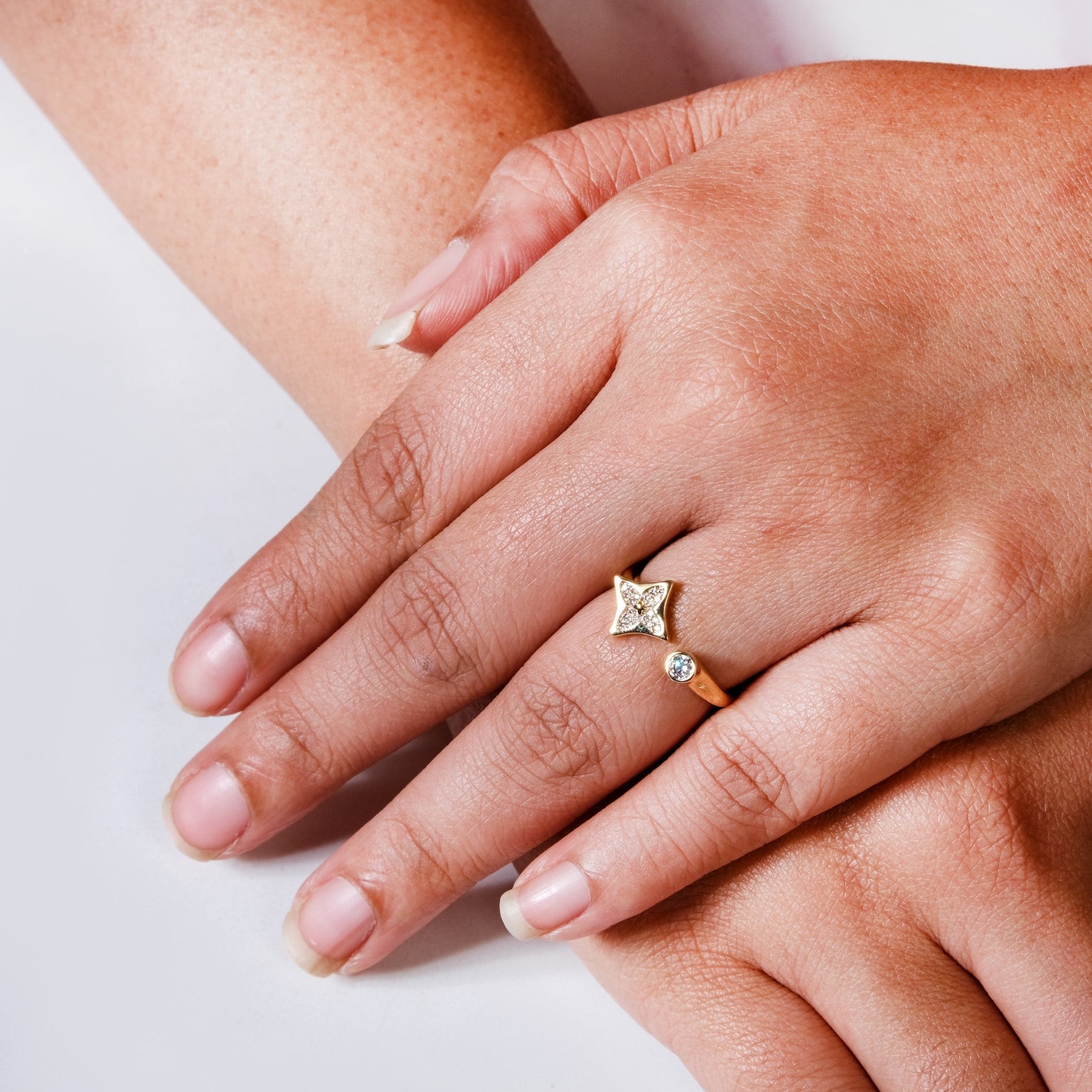 Wrap your finger in elegance with this exquisitely crafted open ring. One end of the band is adorned with a lustrous stone, securely clasped in gold metal, while the other side features a twinkling metal-cut charm, intricately studded to form a delicate flower-like silhouette. At the heart of this floral design rests a golden core, adding a surreal touch that shimmers with every movement. Versatile and graceful, this ring is a perfect blend of sophistication and modern charm.