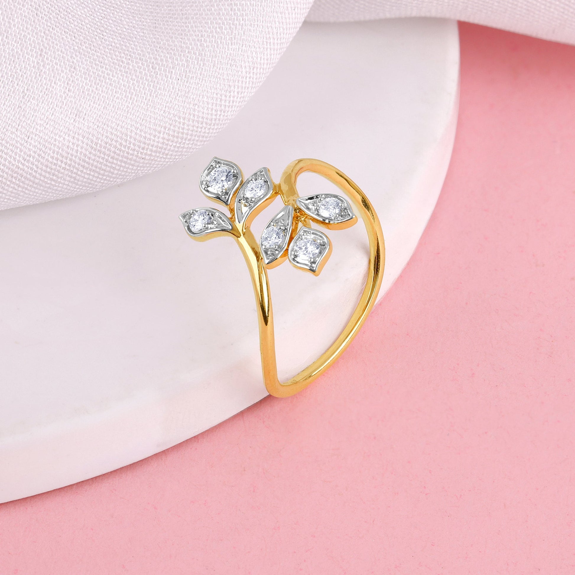 This nature inspired pure gold ring for women features a leaf shape. Each shape is studded with lab grown diamonds for a touch of organic elegance.