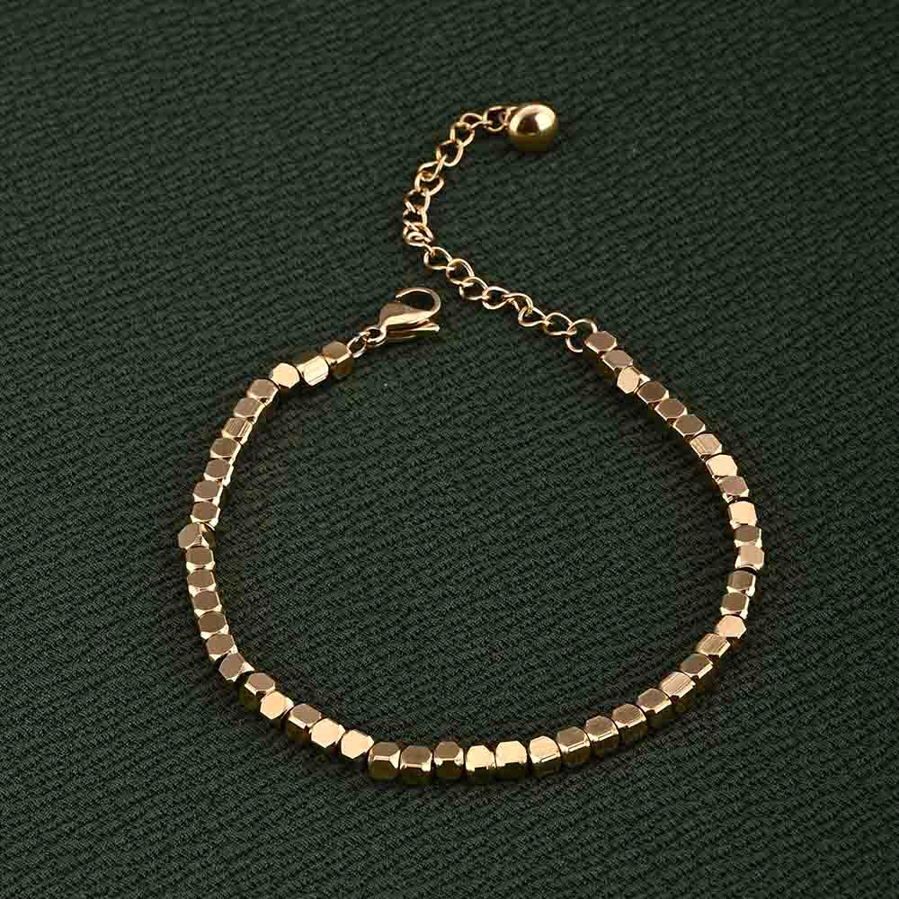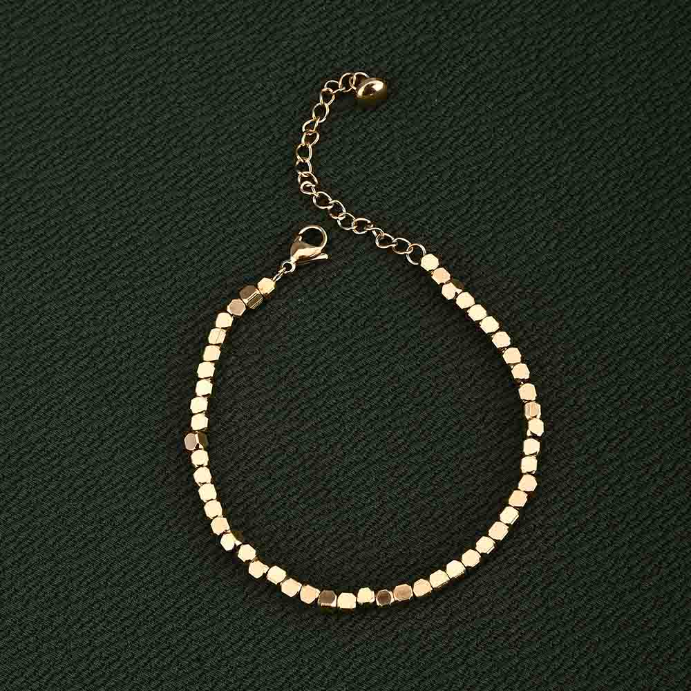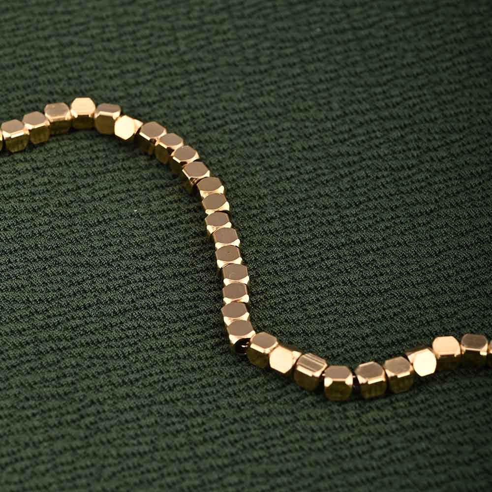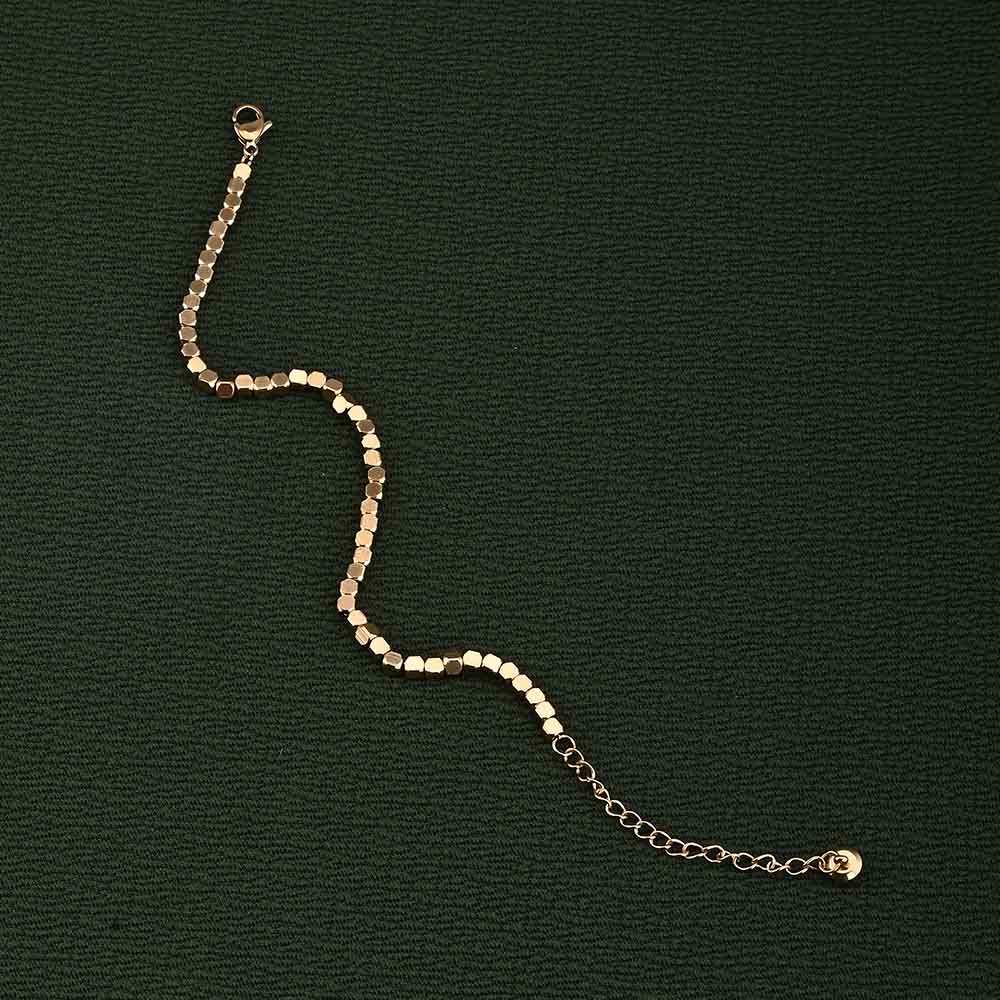 Featuring polished golden cubes along a delicate chain, this bracelet creates a unique geometric charm. Lightweight and adjustable, it combines durability with elegant minimalism. Its subtle detailing makes it versatile for both daily wear and festive occasions, offering understated beauty with a modern touch.