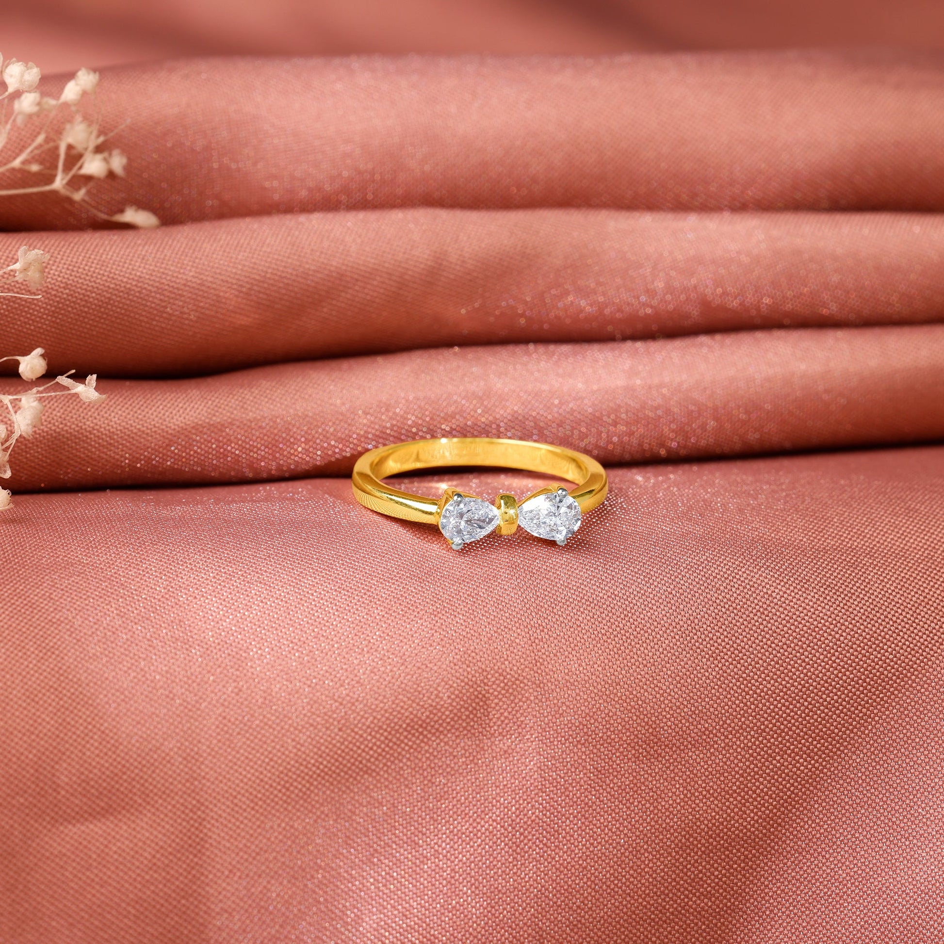 This pure gold ring features two pear-cut lab grown diamonds facing outward, joined by a polished bow-tie on a sleek yellow band.