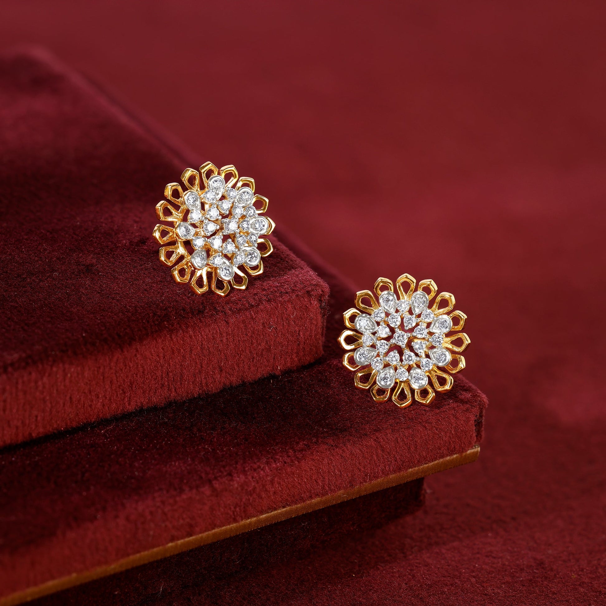 These pure rose gold hoop earrings for women feature a bold floral design, with a central cluster of sparkling diamonds framed by a starburst of openwork gold petals.