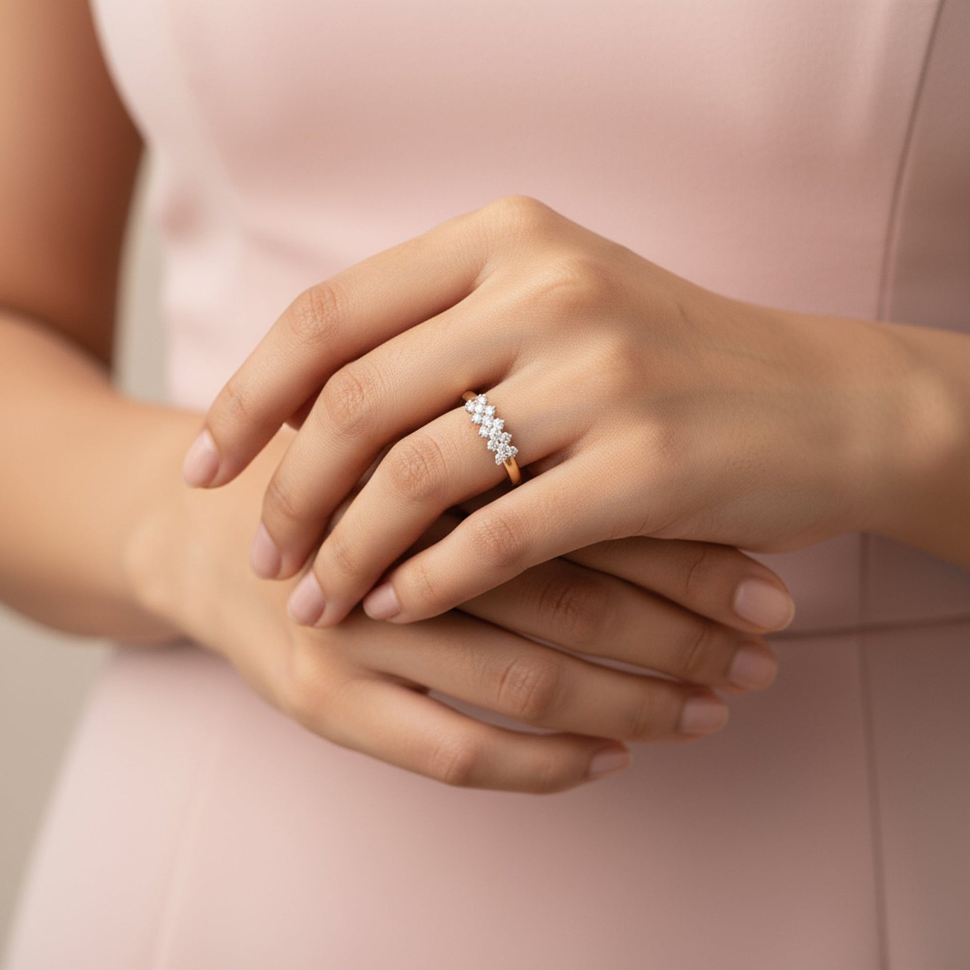 For the woman who greets each day with quiet strength. This gold ring mirrors her grace, a sleek gold band, crowned with a cluster of lab grown diamonds that shimmer like the first light of morning. She doesn't speak loudly, but her presence is unforgettable.