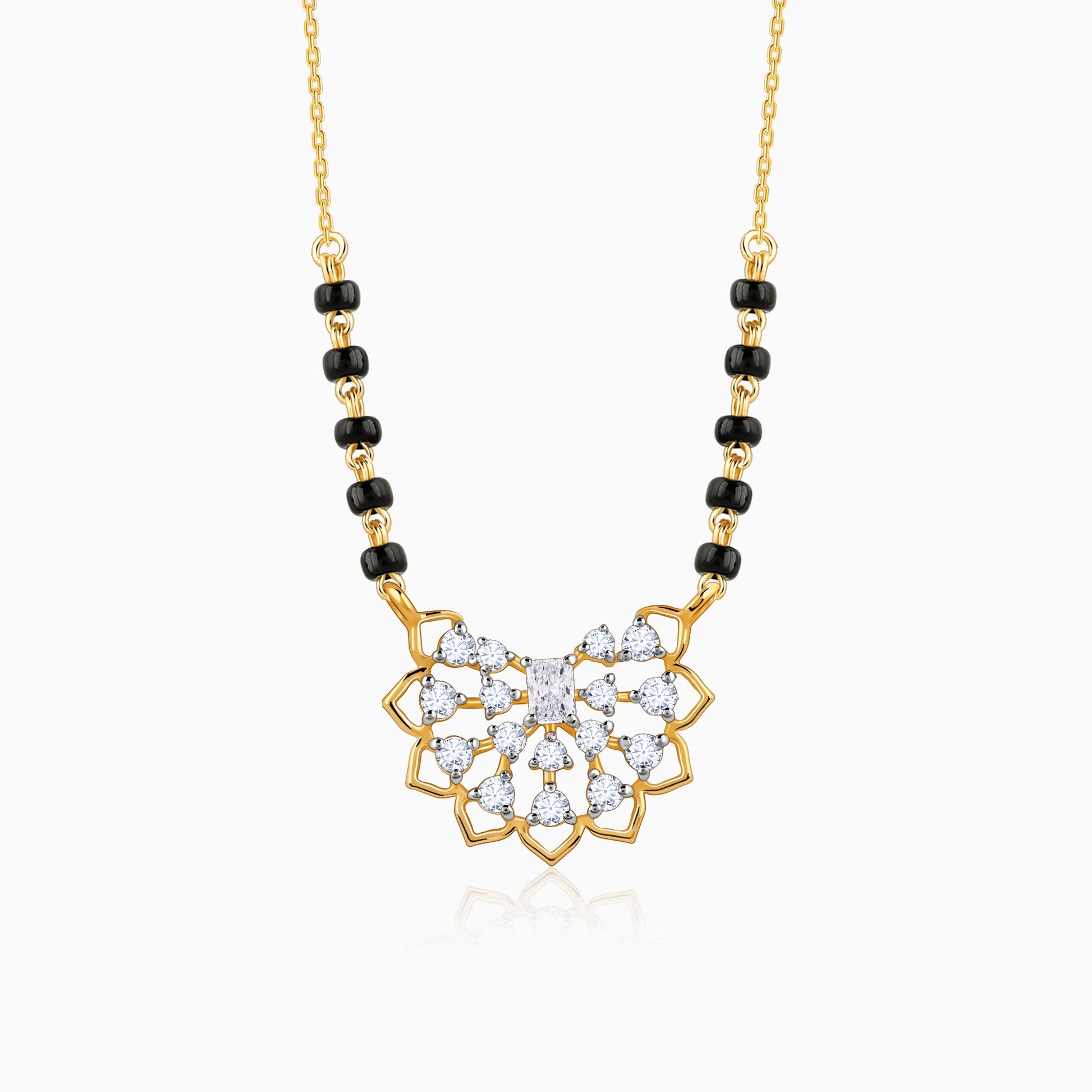 This pure gold mangalsutra for women features an intricate floral motif in half, elegantly studded with lab grown diamonds at the petals with an emerald-cut lab diamond at the centre. Five black beads are placed on each side of the chain.