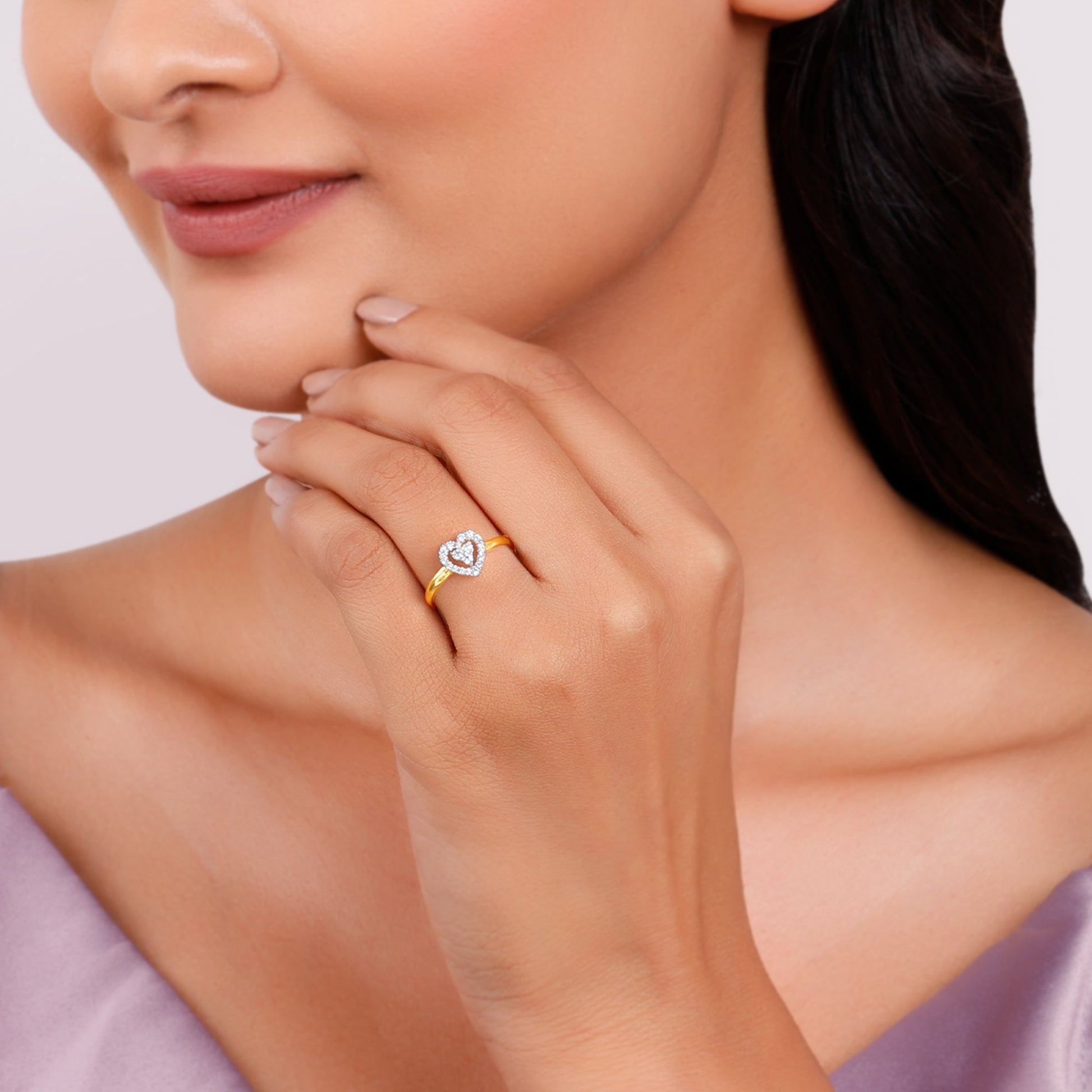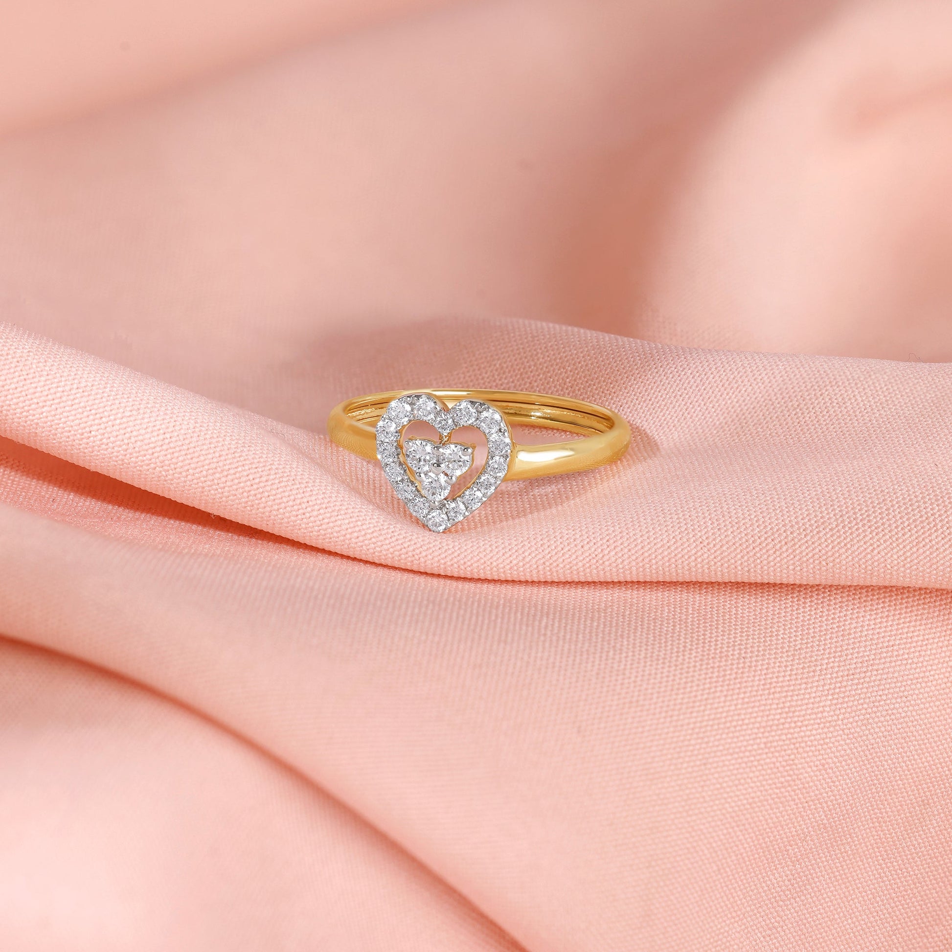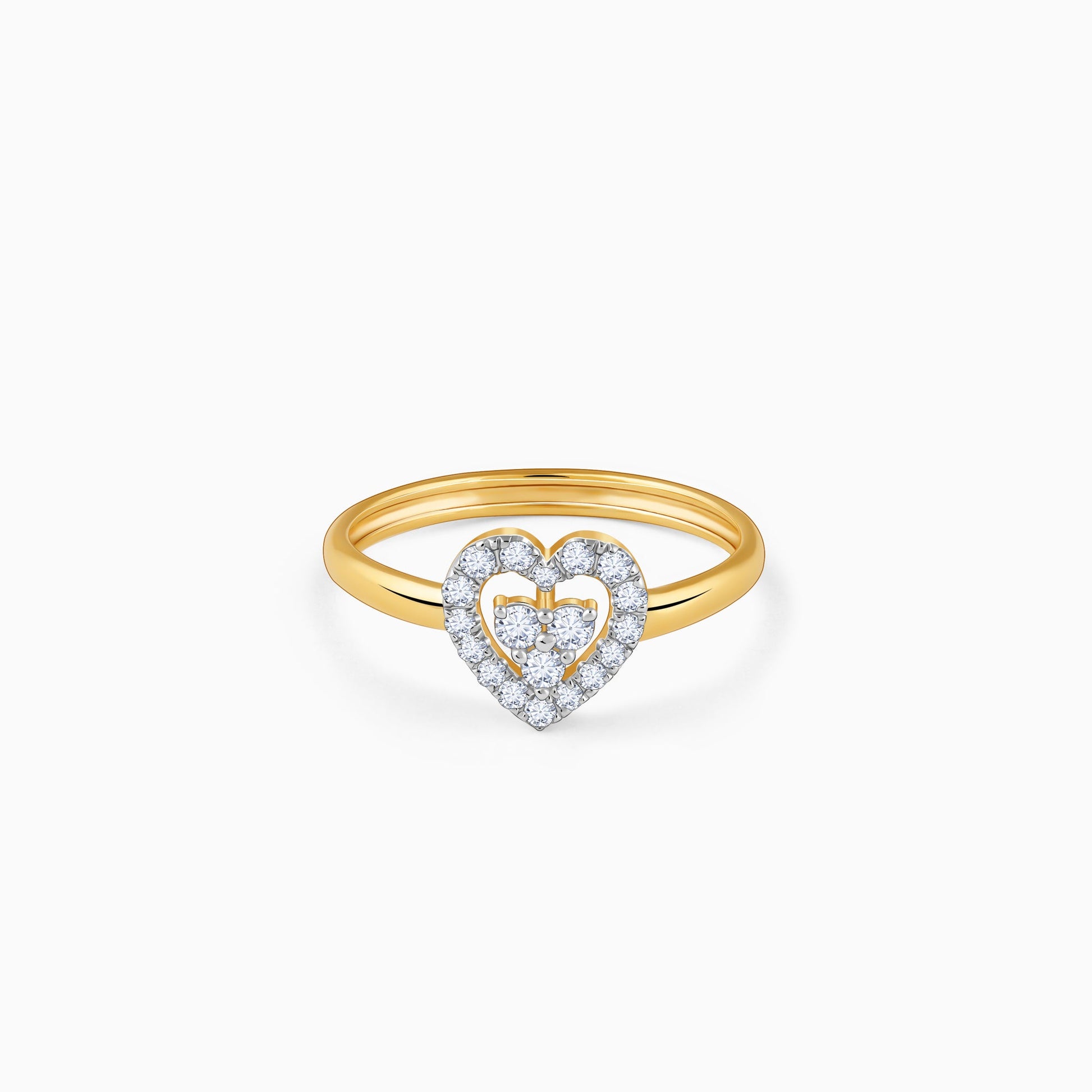 This pure gold ring for women features a heart-shaped centrepiece with a captivating two-tiered design. An inner cluster of lab grown diamonds is nestled within a larger, open-work heart shape, which is also completely encrusted with brilliant-cut lab grown diamonds.