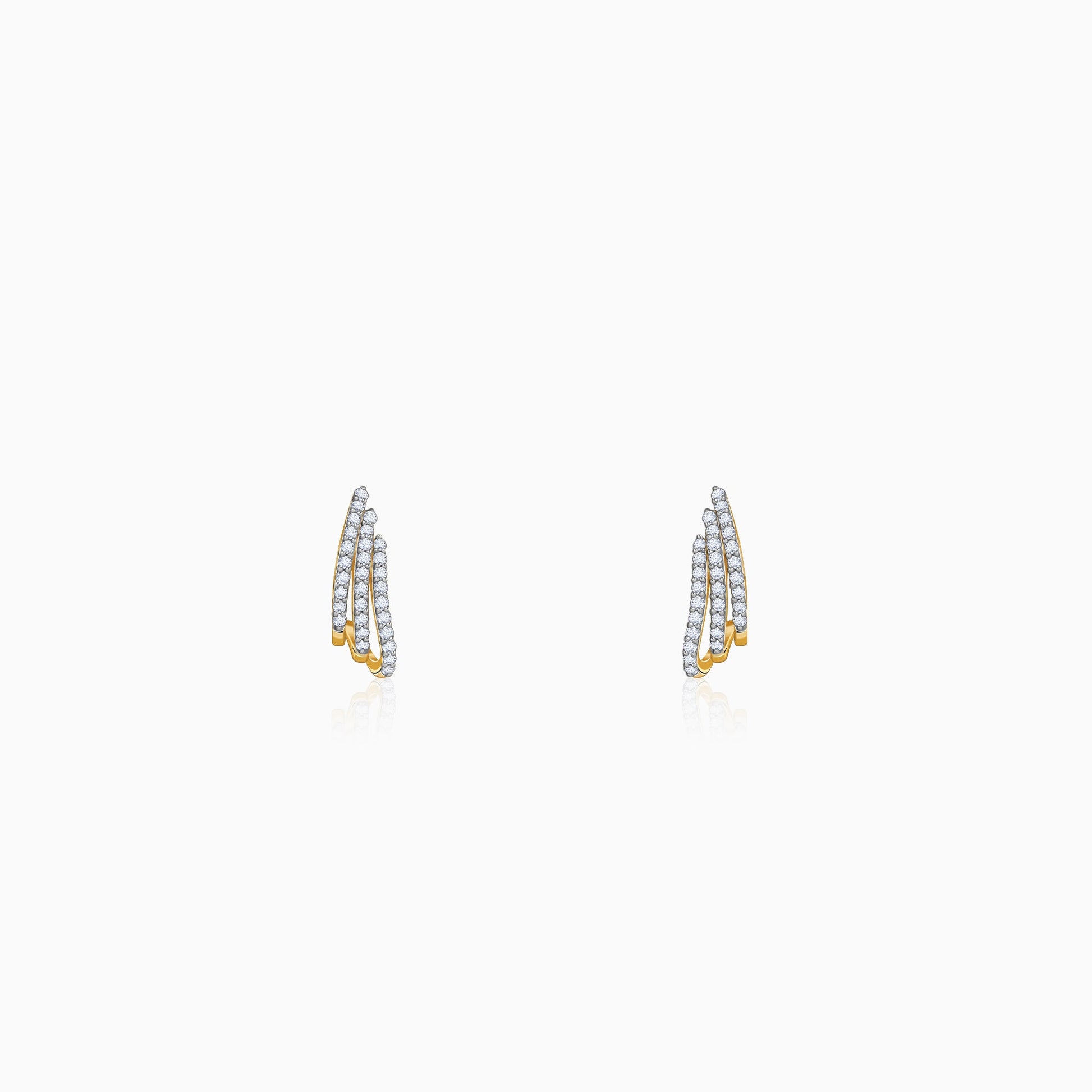 These pure gold diamond earrings for women feature three rows of elegantly studded lab grown diamonds, in a feather-like arrangement.