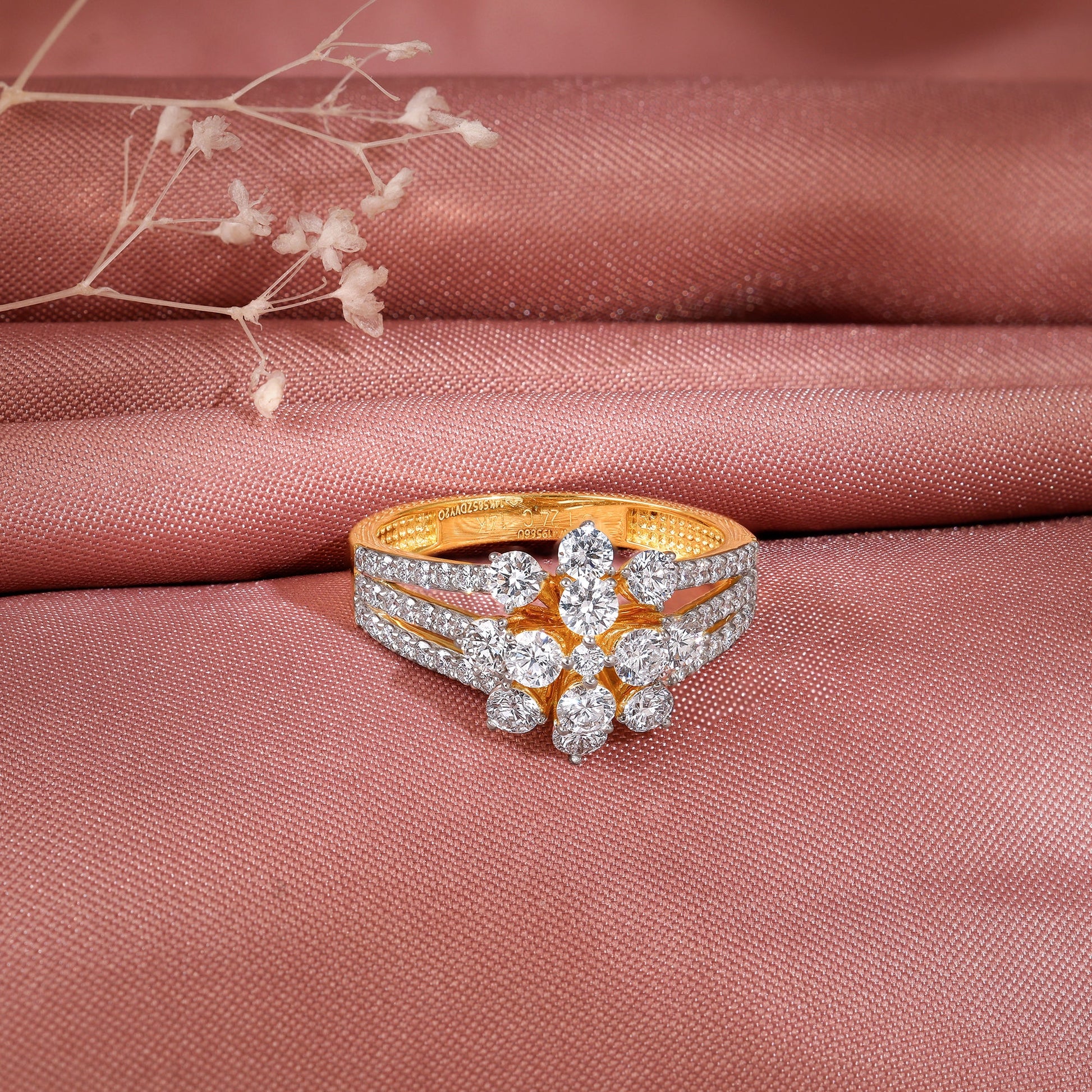 This gold ring for women features a bold split band encrusted with pavé lab grown diamonds, framing a round-cut floral cluster in a prong setting.