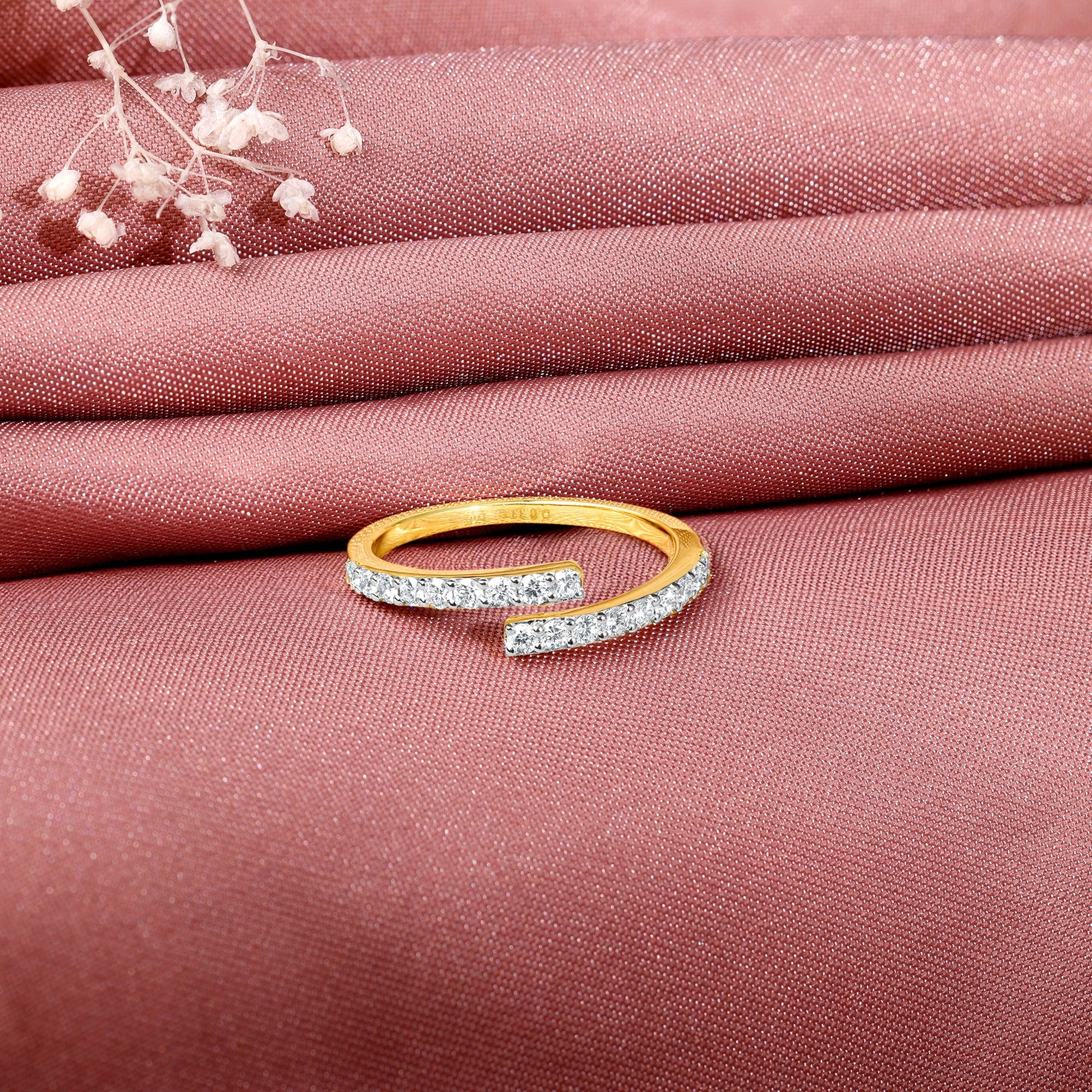 This open-front gold ring for women features twin arms encrusted with shimmering lab grown diamonds, gently curving toward each other without touching.