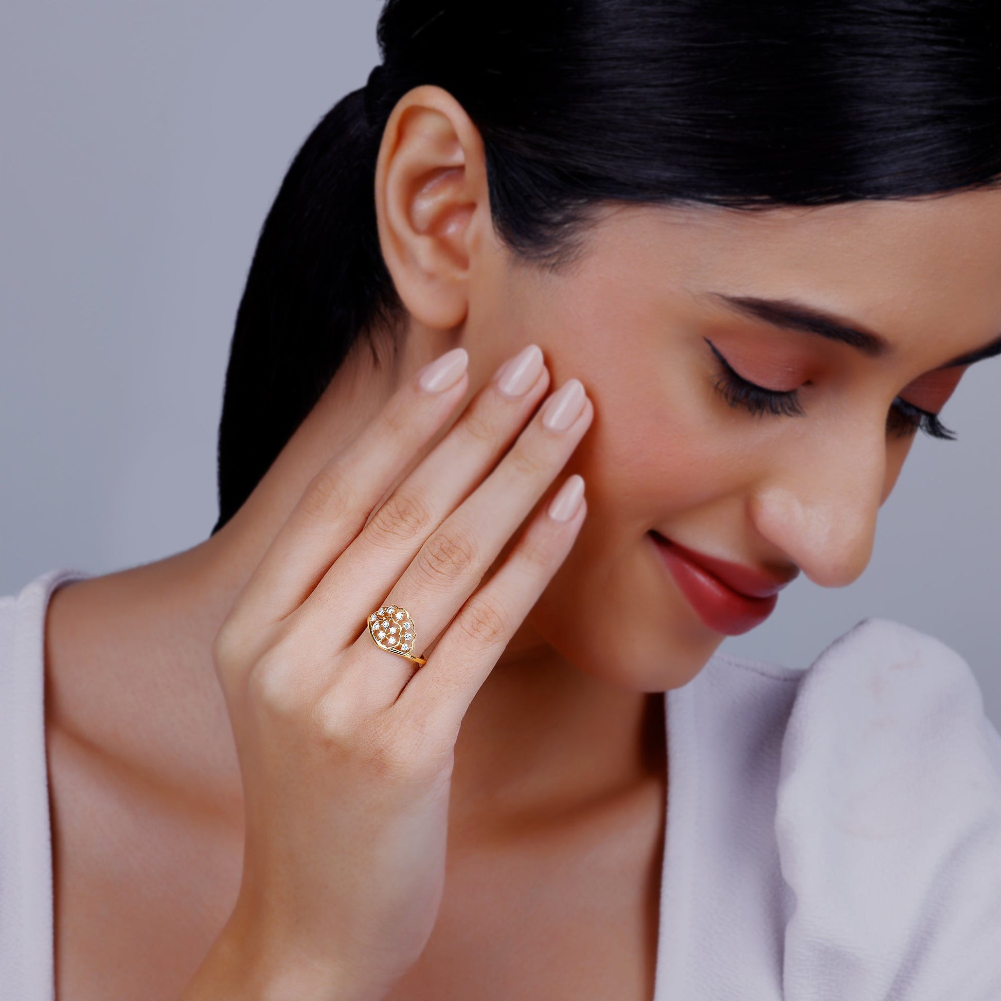 This pure gold ring features a fan-like design with a central opening, studded with lab-grown diamonds in a pave setting.