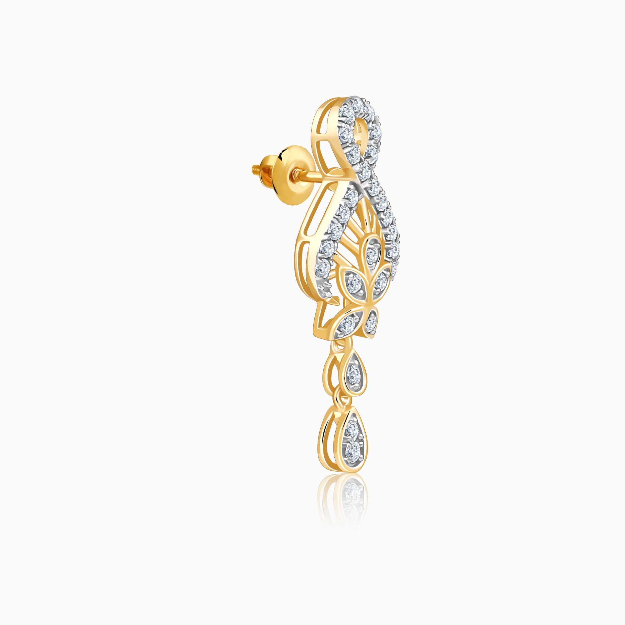 These womens pure gold earrings feature a stylised infinity motif lined with lab grown diamonds each. A butterfly-like motif sits at the base of one loop, with two teardrop motifs descending from it, also impeccably studded with lab diamonds.