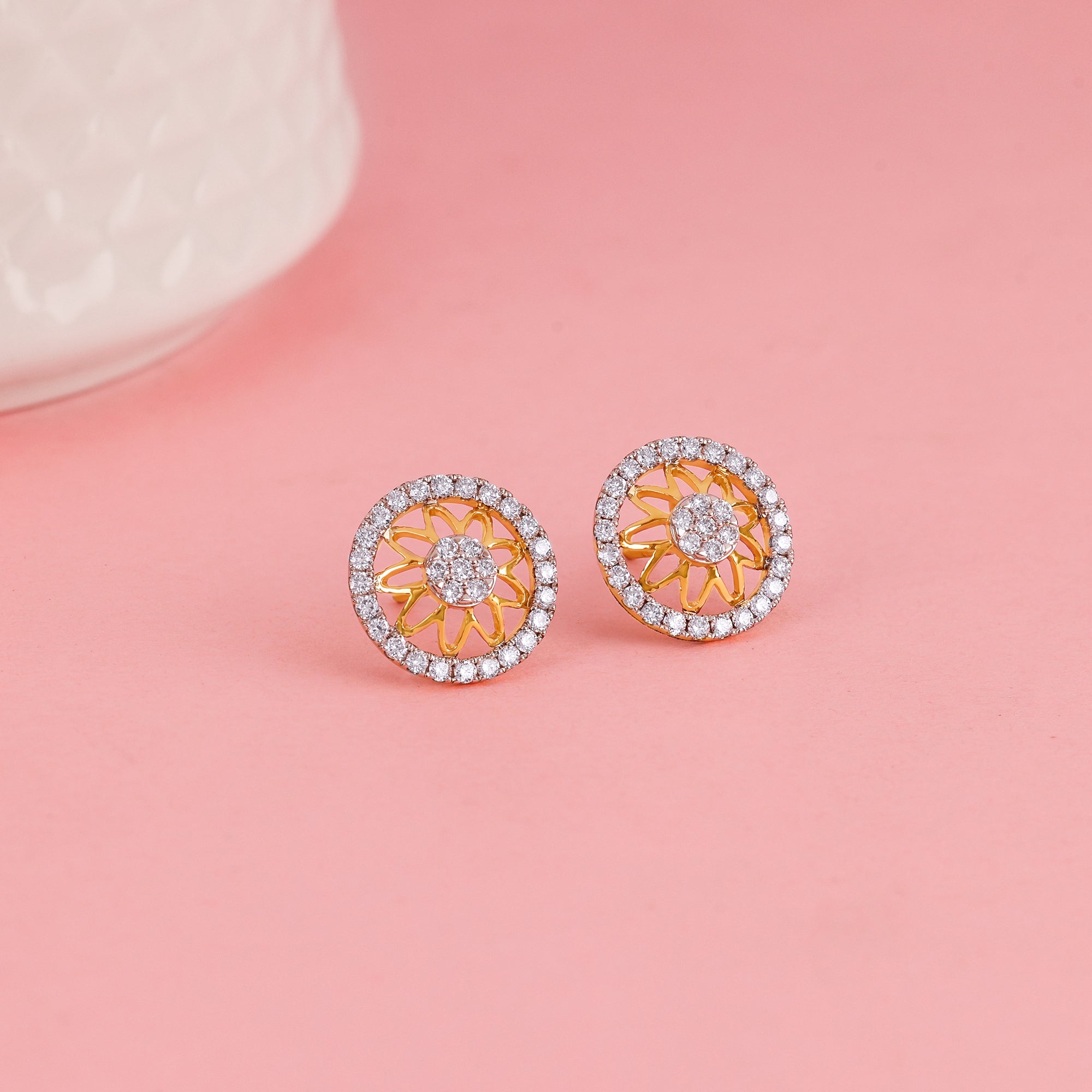 These pure gold earrings for women feature a linework of a floral motif within a lab grown diamond studded halo. A cluster of lab diamonds forms the core of the earrings.