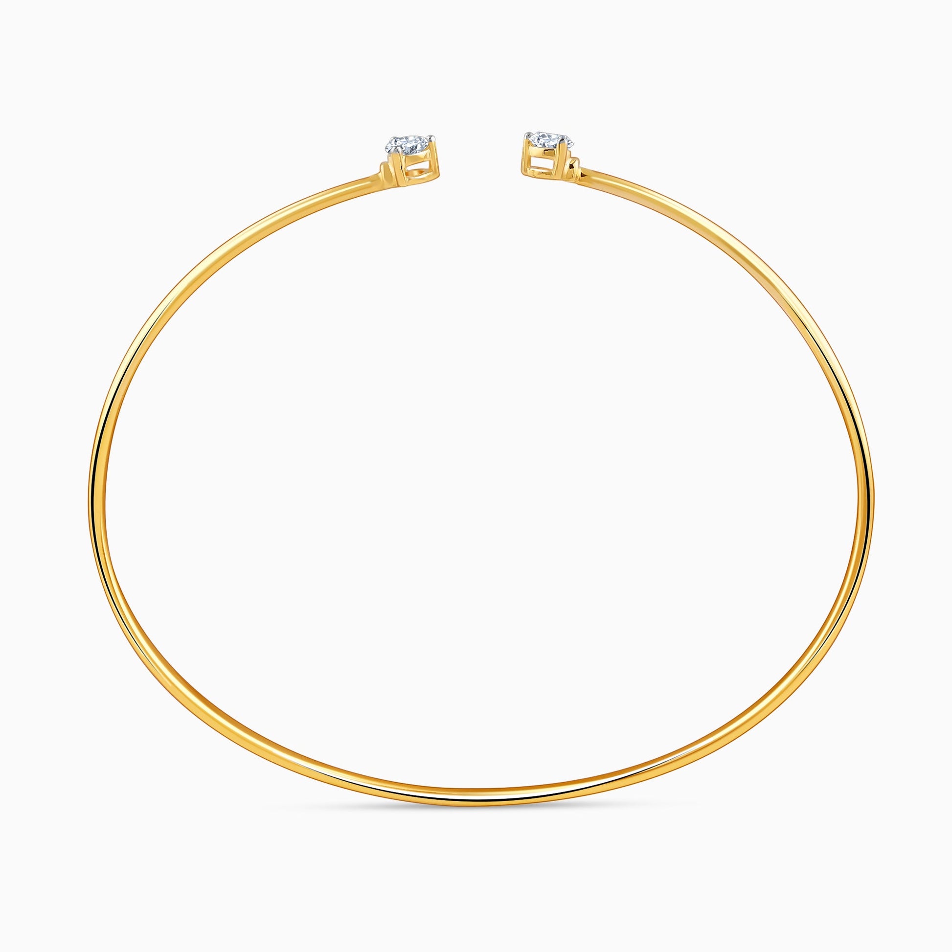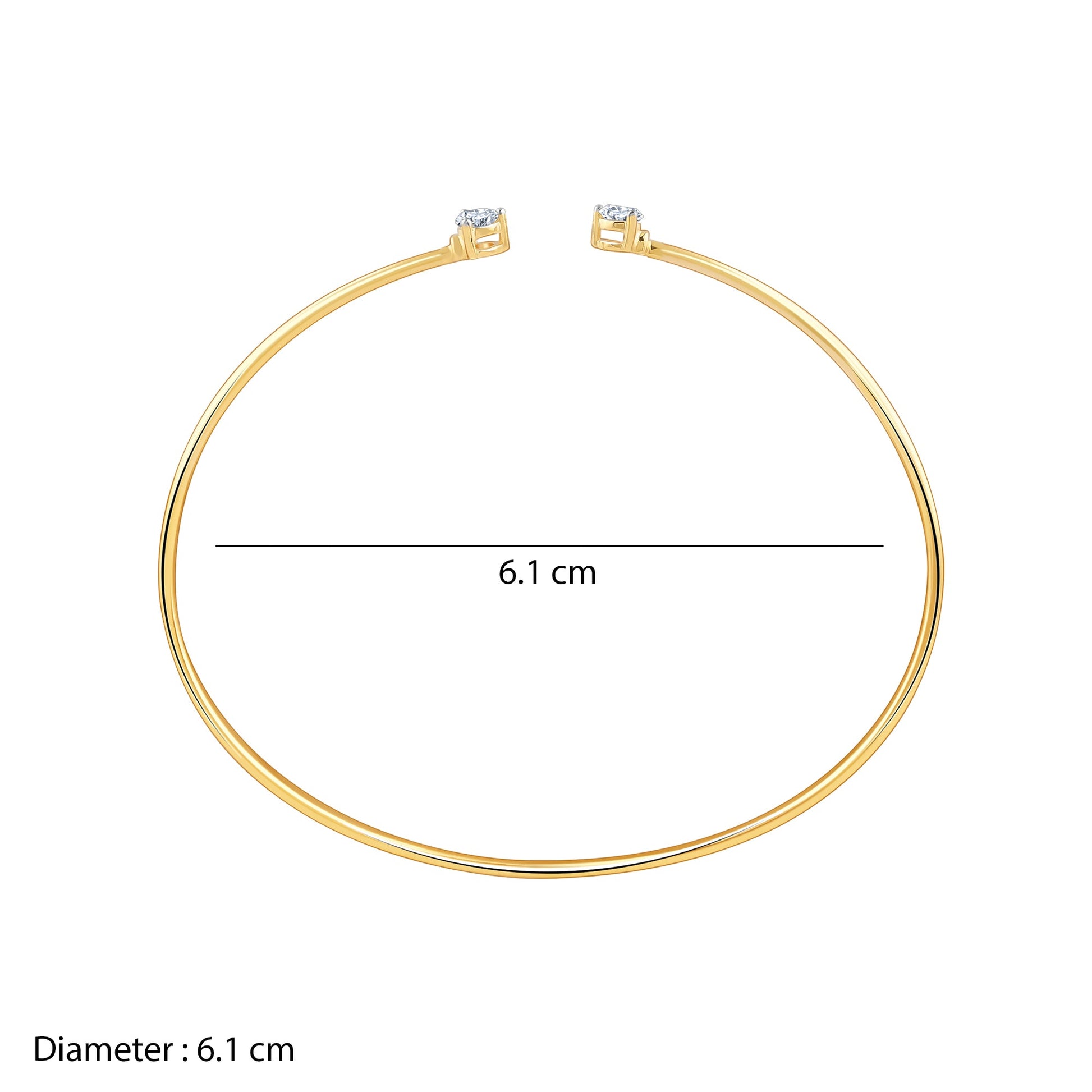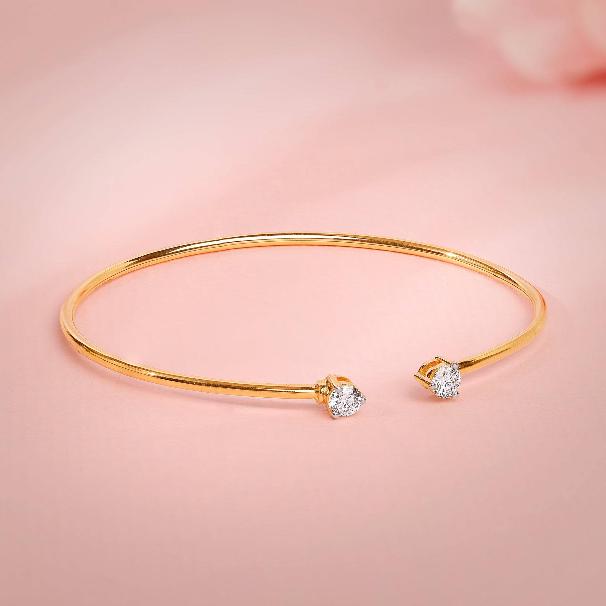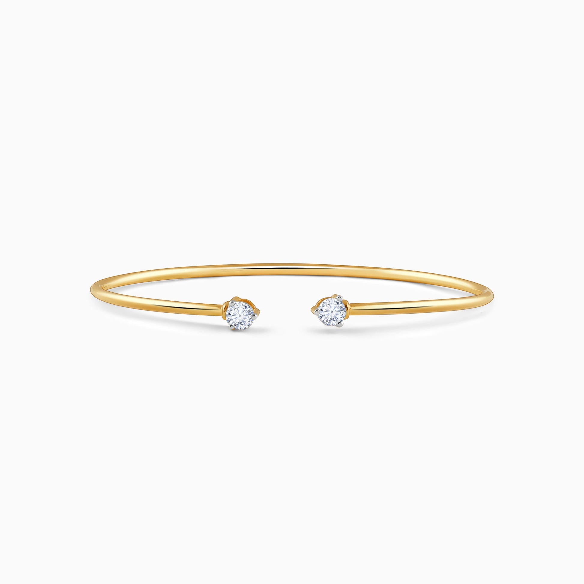This gold cuff bracelet for women features an open band with two twin solitaire lab grown diamonds at each end.