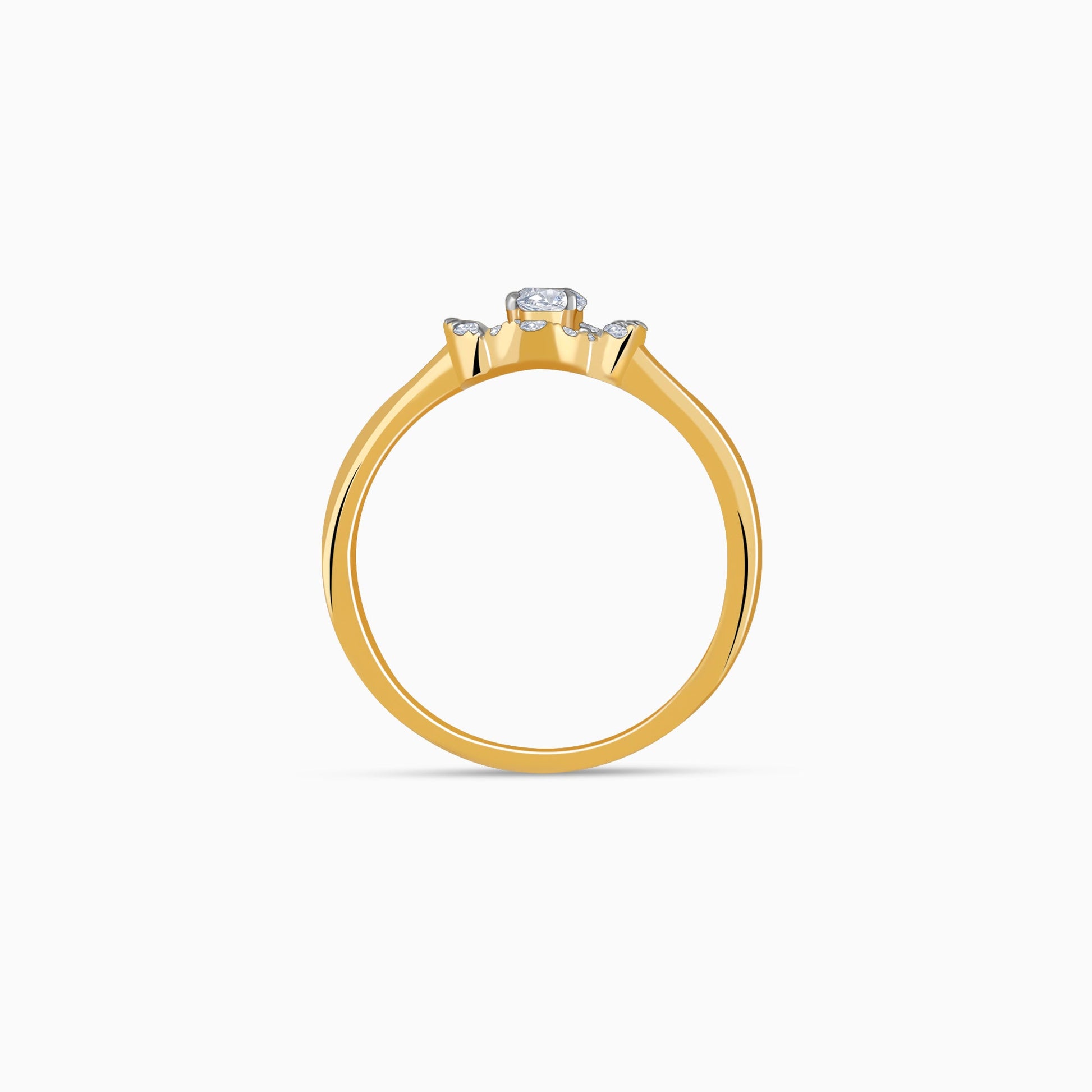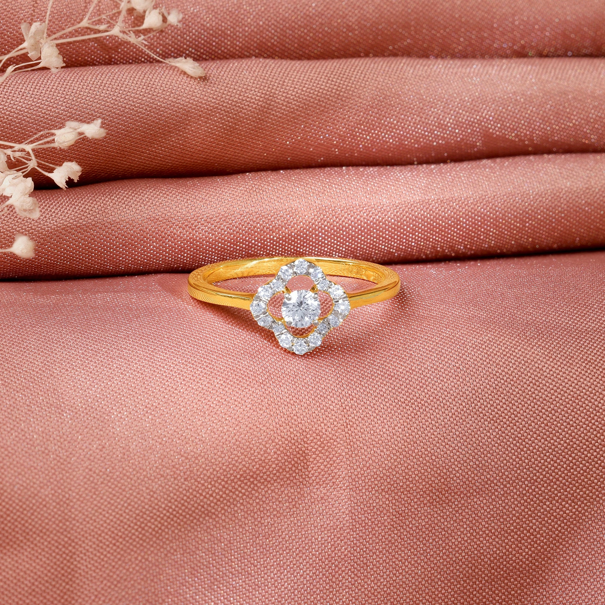 This pure gold ring for women features a dazzling central solitaire encircled by a quatrefoil frame of pavé-set lab grown diamonds. The sleek gold band adds balance, making it both modern and luxurious.
