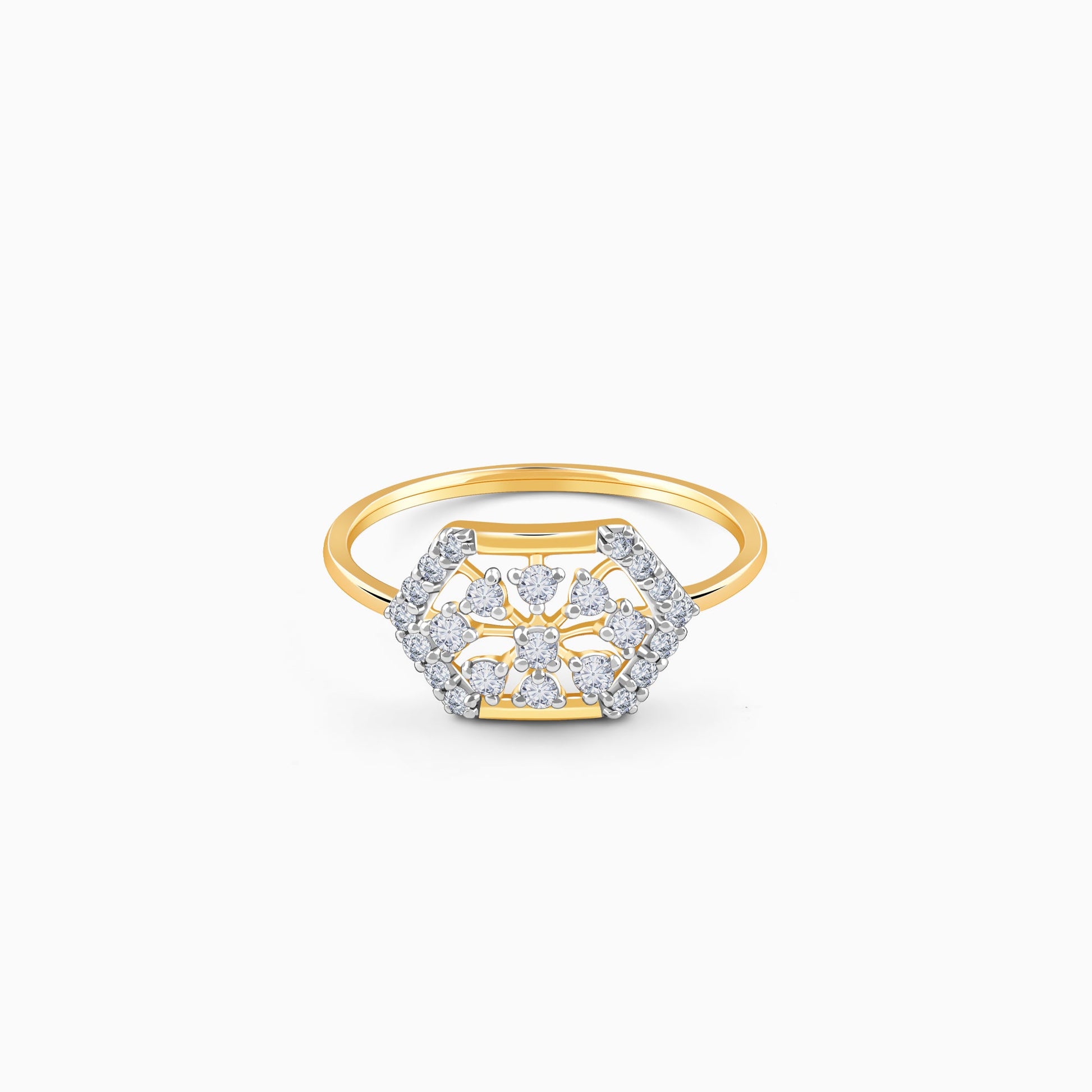 Set in a hexagonal gold & lab grown diamond studded frame, it nestles a floral motif at the centre, all perched on a sleek gold band.