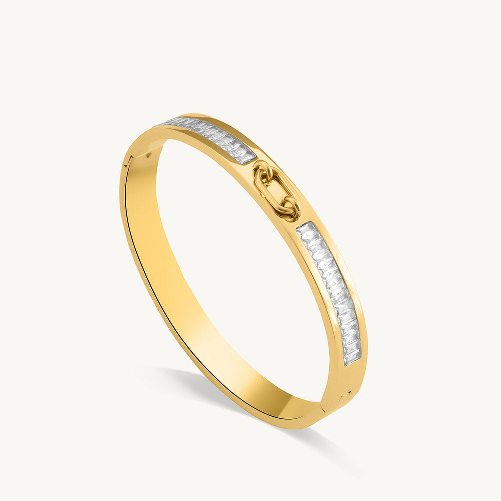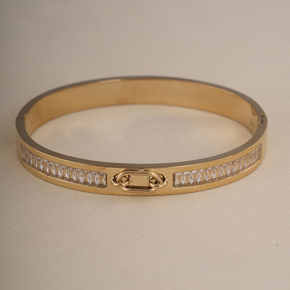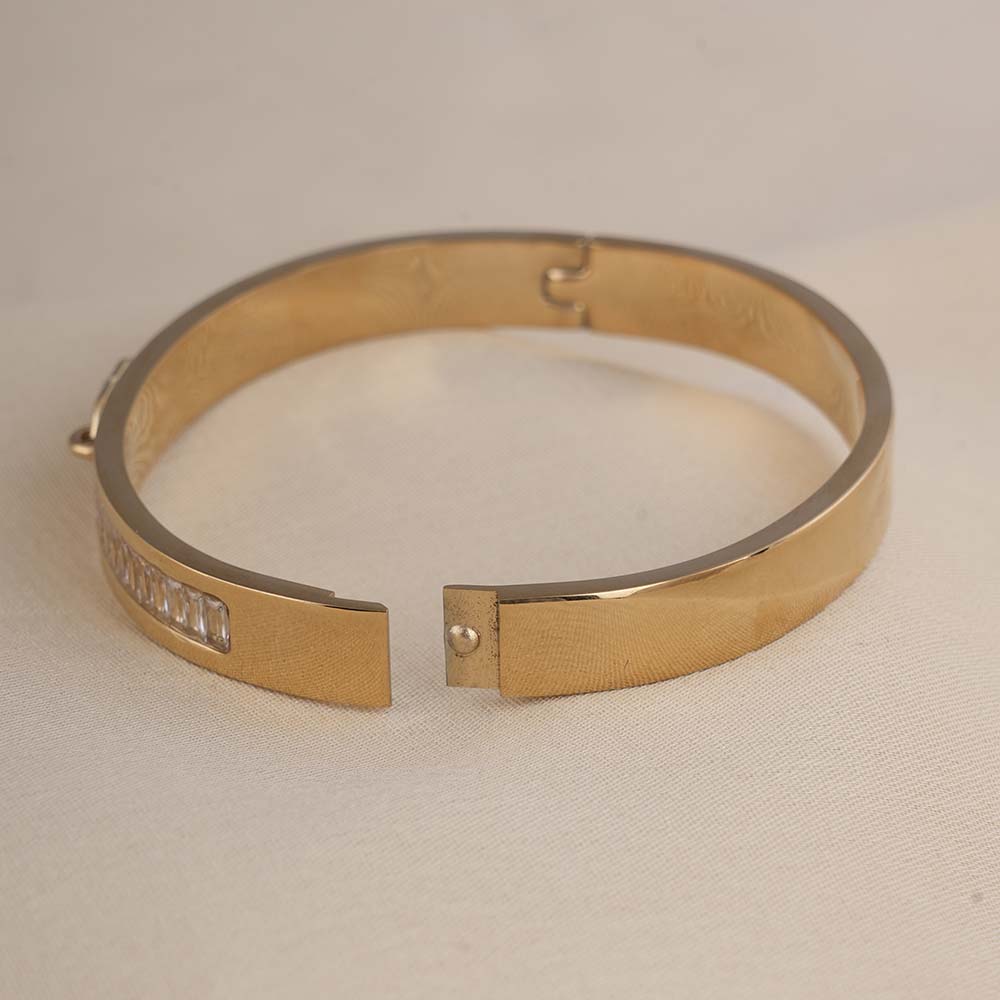 The Gold Hinged Bangle Bracelet is designed for effortless elegance and ease. With its smooth 18k gold tone finish and sparkling white synthetic stones, it adds just the right amount of shine to your wrist. The hinged clip-on closure ensures comfort and convenience, making it a perfect choice for daily wear as well as special occasions. A timeless piece that blends style and practicality, this bangle is a must-have addition to any jewellery collection.