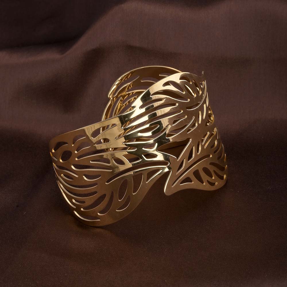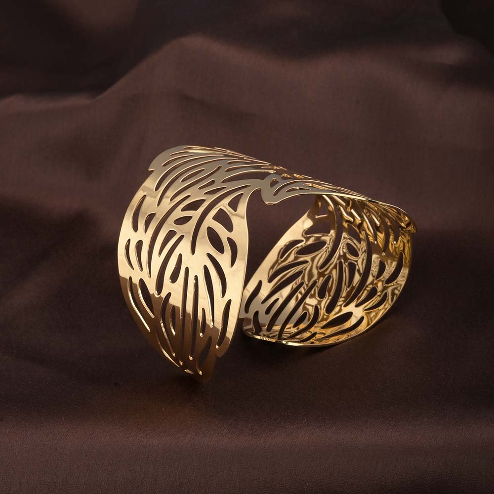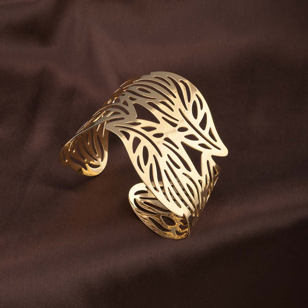 This bracelet showcases a detailed gold leaf design, reflecting nature’s beauty in an elegant form. Crafted with precision, it combines durability and sophistication, while its radiant finish ensures long-lasting shine. Lightweight and unique, it’s a statement piece that brings natural artistry to your wrist.