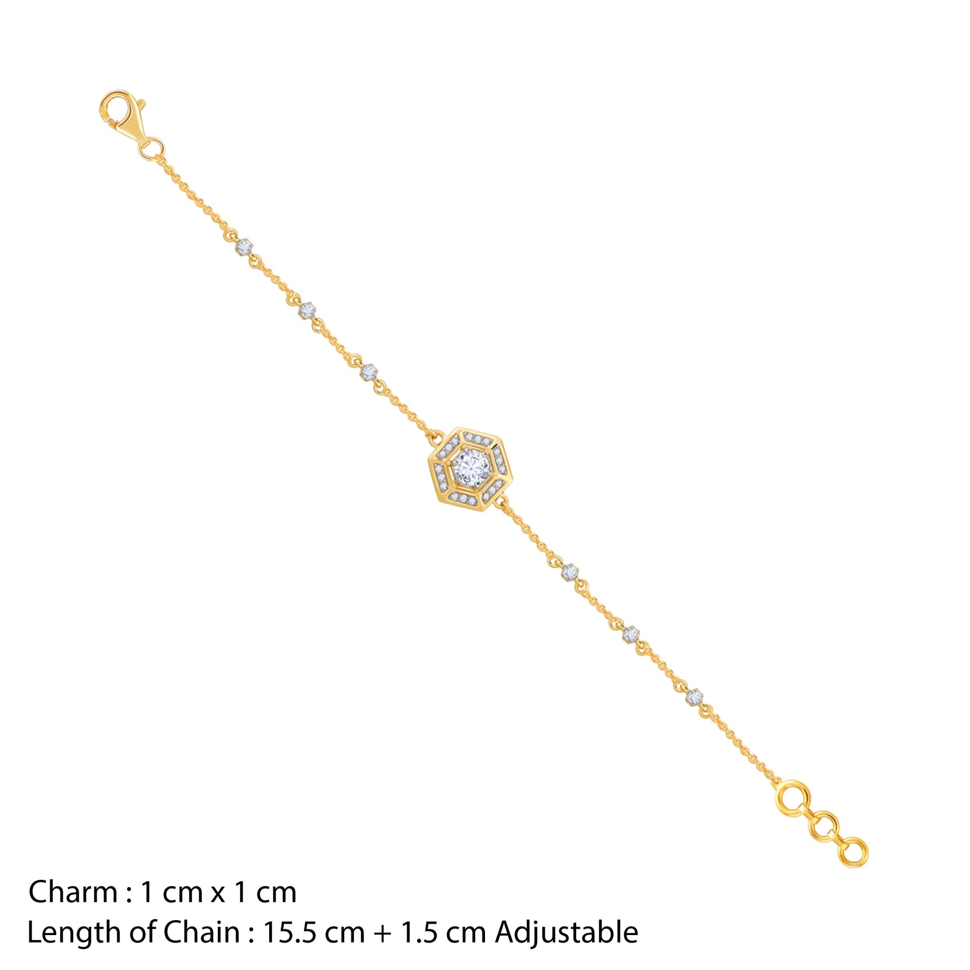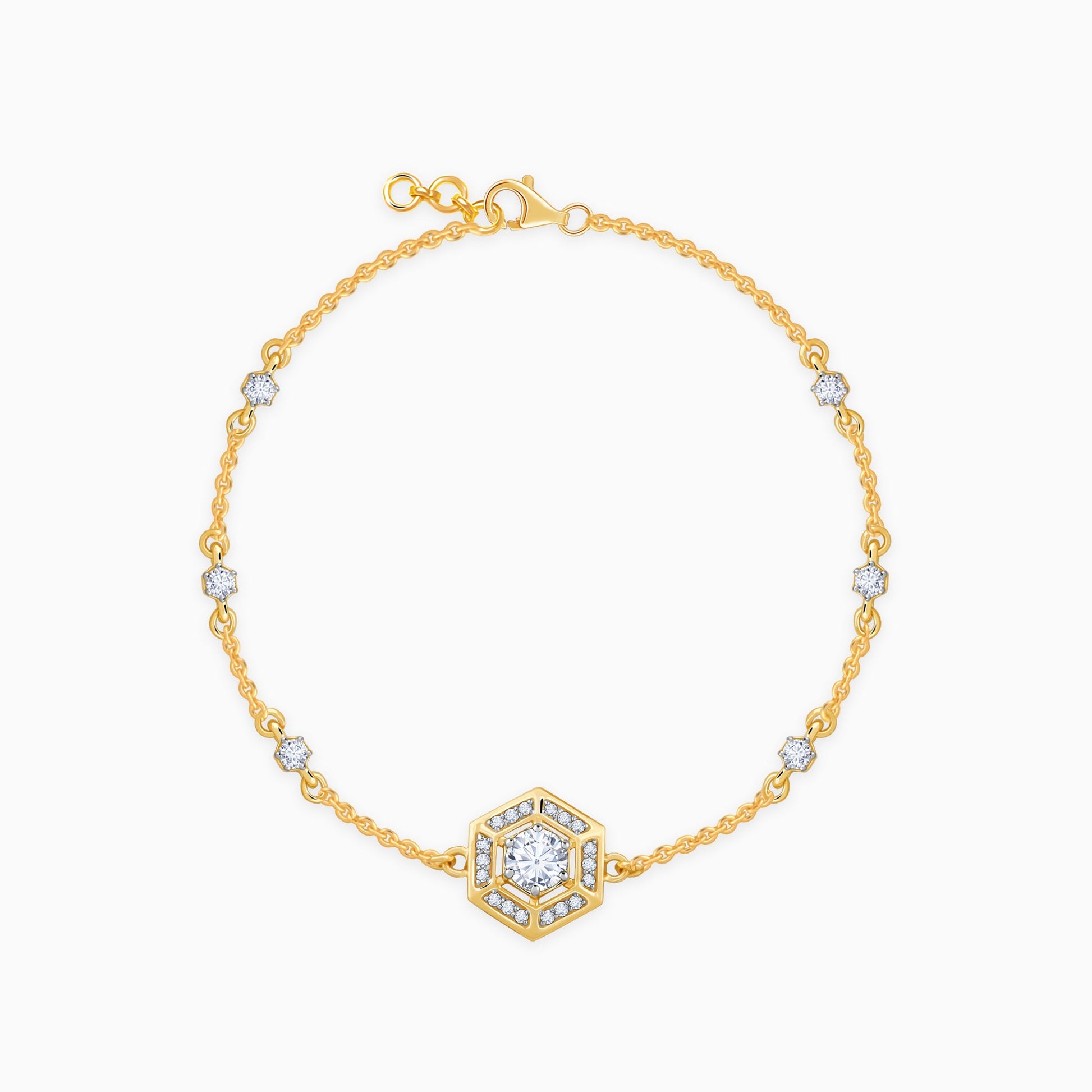 This pure gold bracelet features a hexagonal-shaped diamond setting surrounded by smaller diamonds, set against a delicate gold chain.