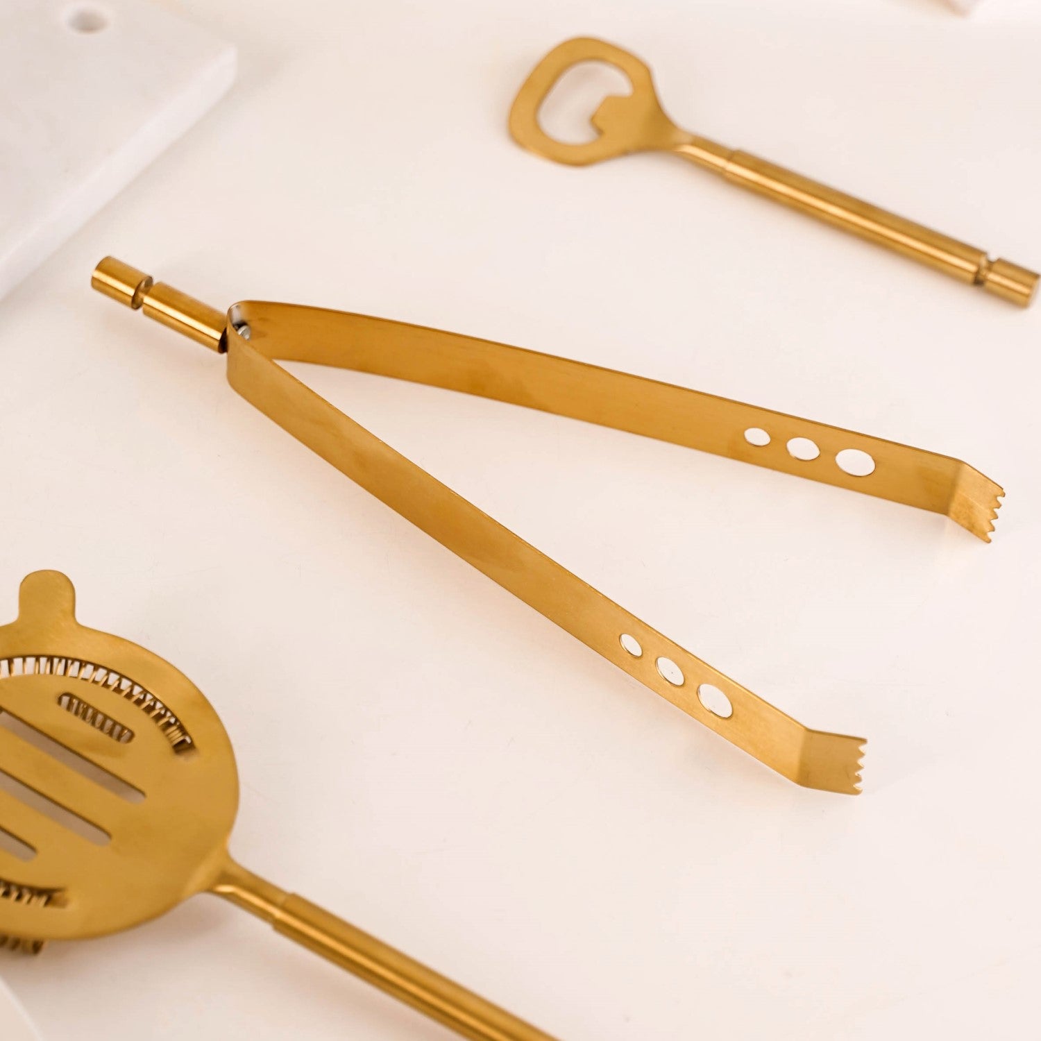 Utility: This set covers essential bar functions with four thoughtfully selected tools designed to make mixology effortless. The ice tongs allow for precise handling of ice cubes, minimising contact and ensuring hygiene. The strainer is ideal for separating liquids and solids when pouring cocktails, creating a smooth beverage. The bottle opener quickly opens various types of caps, making it convenient for serving. The pronged cheese knife completes the set, offering the perfect slice or cut of cheese for cocktail garnishing or pairing with drinks.