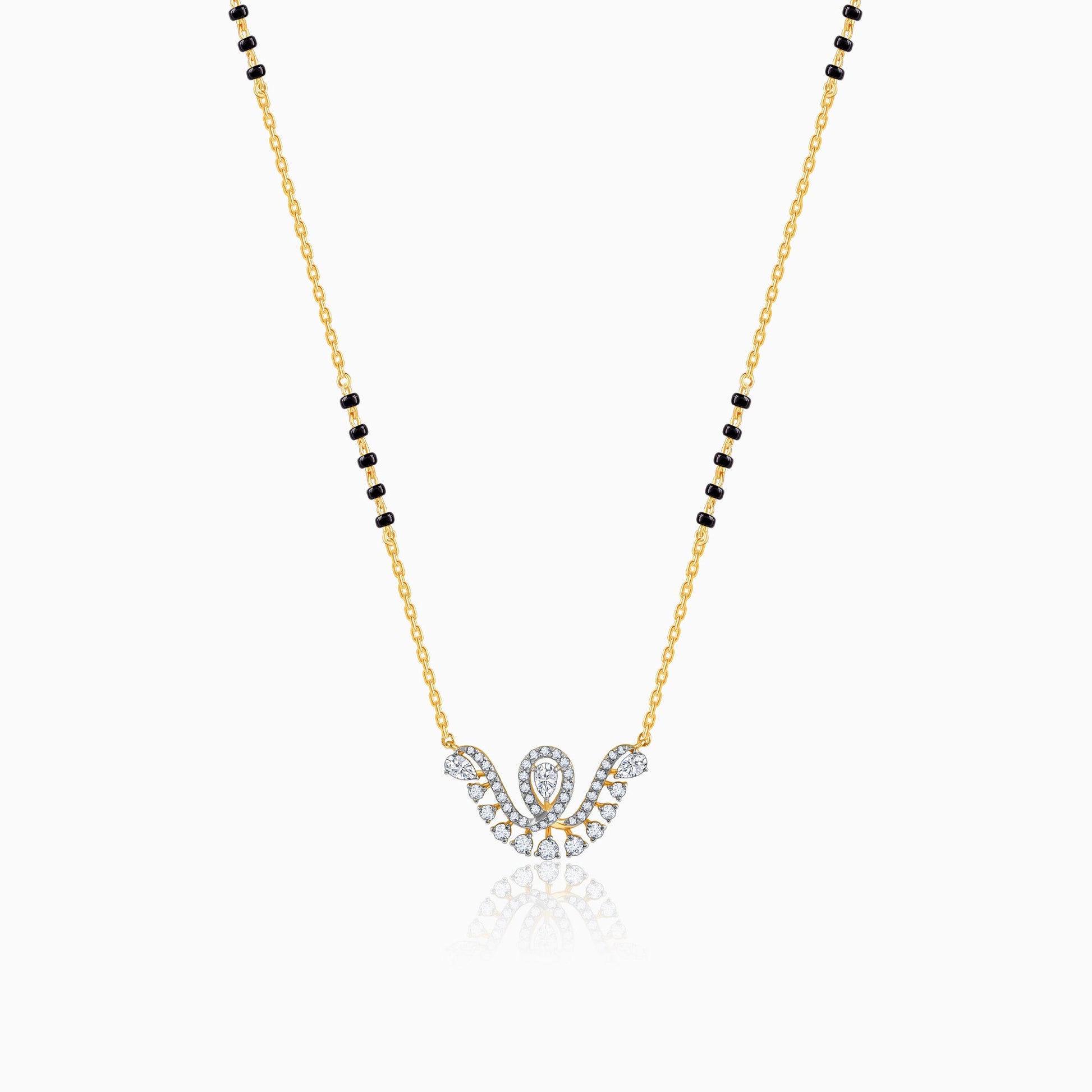 This pure gold mangalsutra for women features a gold chain set with black beads and a unique design studded with sparkling lab grown diamonds.