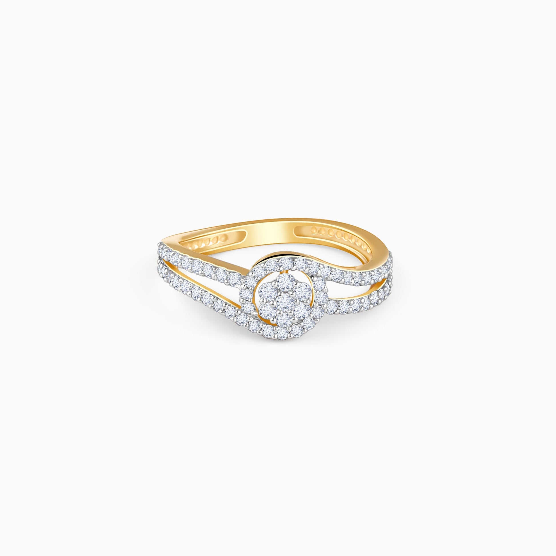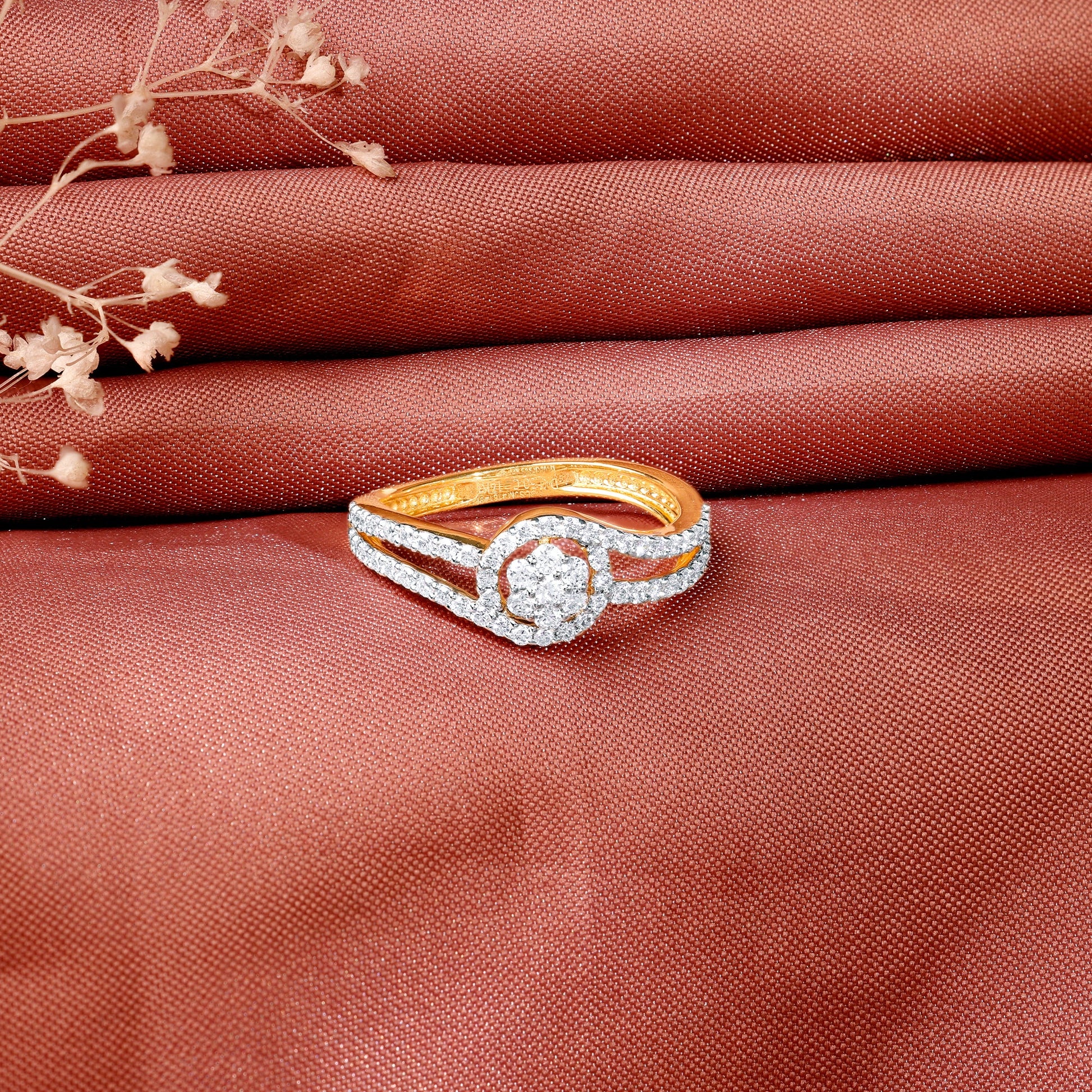 This pure gold ring for women features a split shank lined with lab grown diamonds, gracefully framing a central floral cluster. The round-cut lab diamonds form a layered blossom, encircled by a halo that adds up to its sparkle.