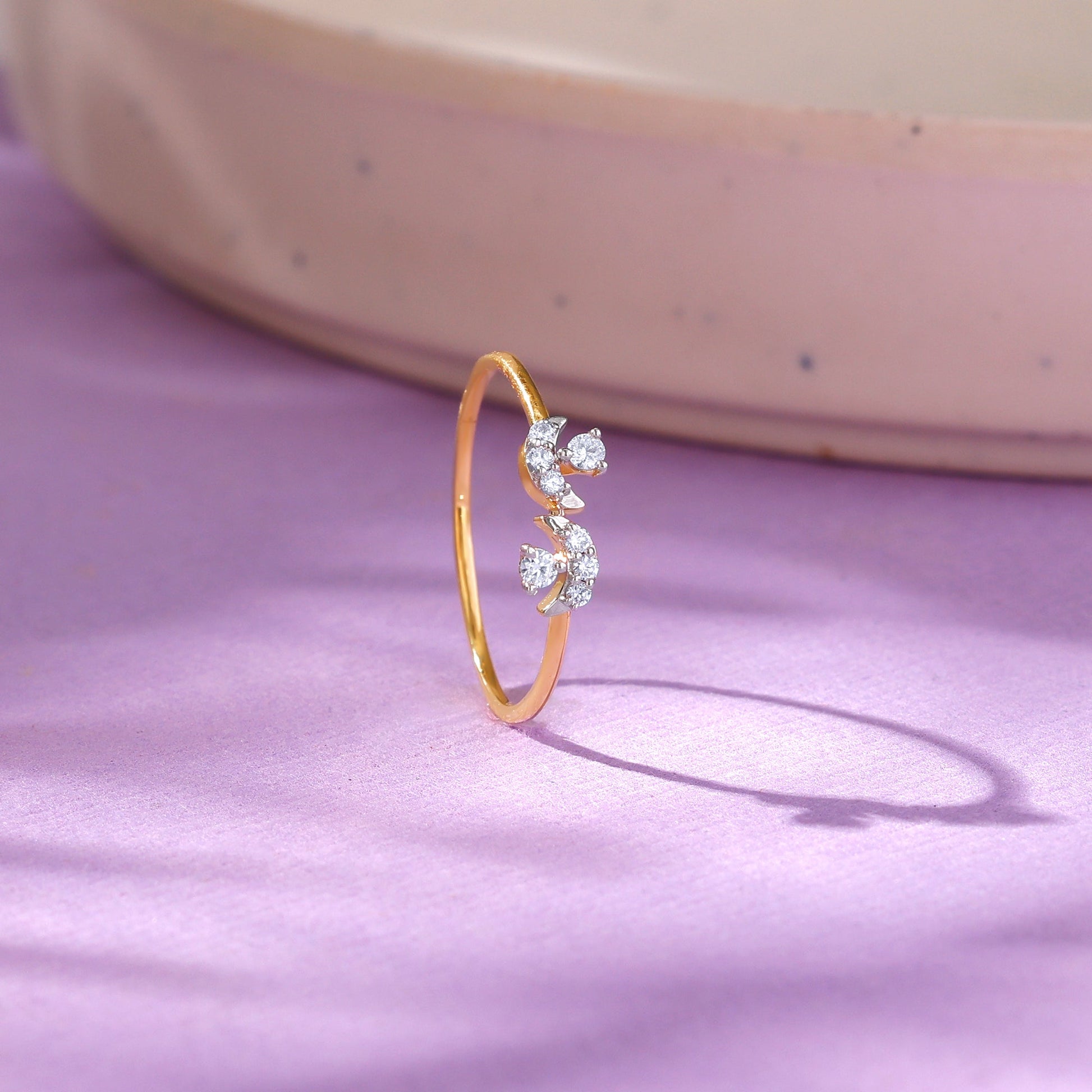 This gold ring features a moon design connected to its water image design, both nestling lab-grown diamonds.