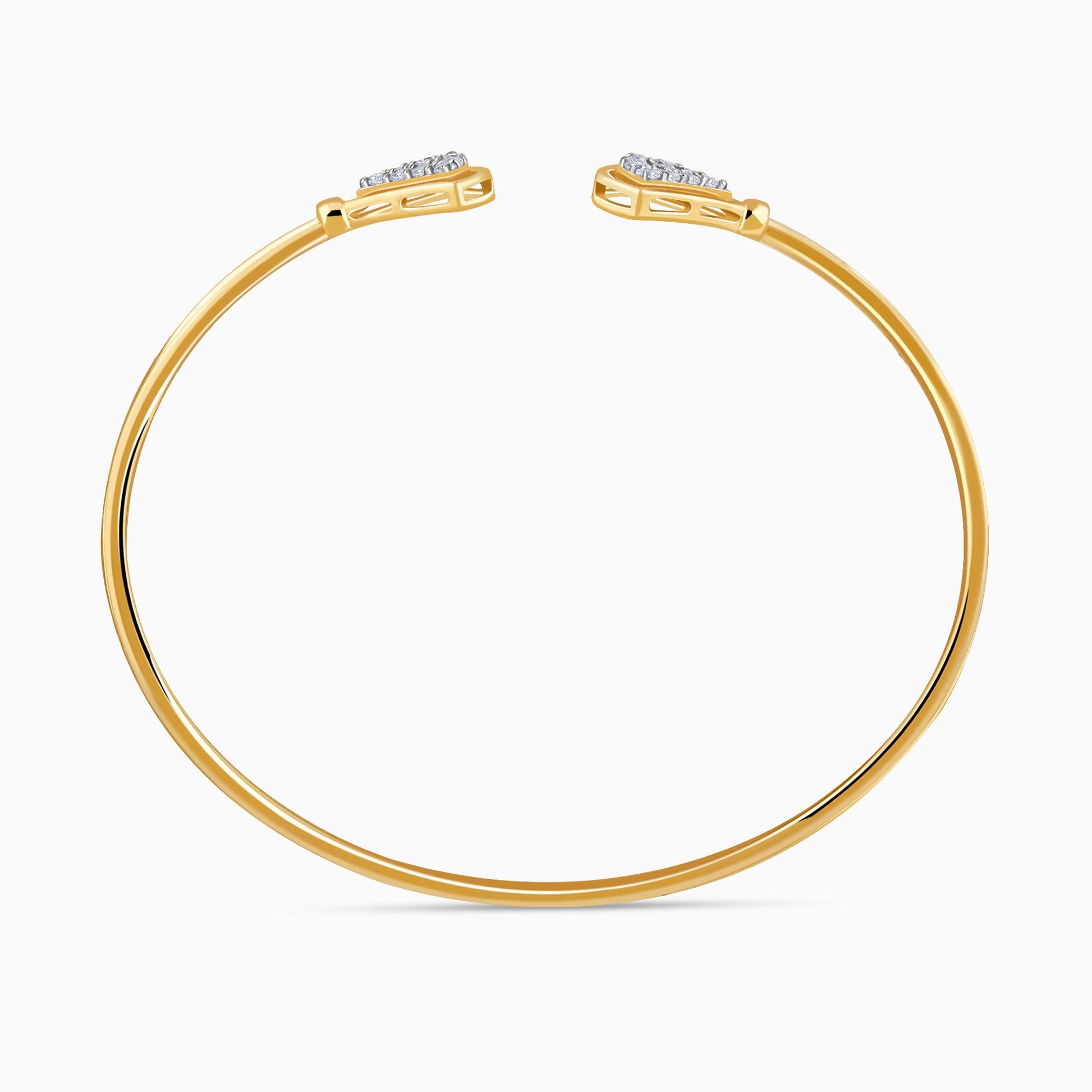This gold cuff bracelet for women features a bold open band with twin abstract fan-shaped ends. Each of the design is each paved with shimmering lab grown diamonds.
