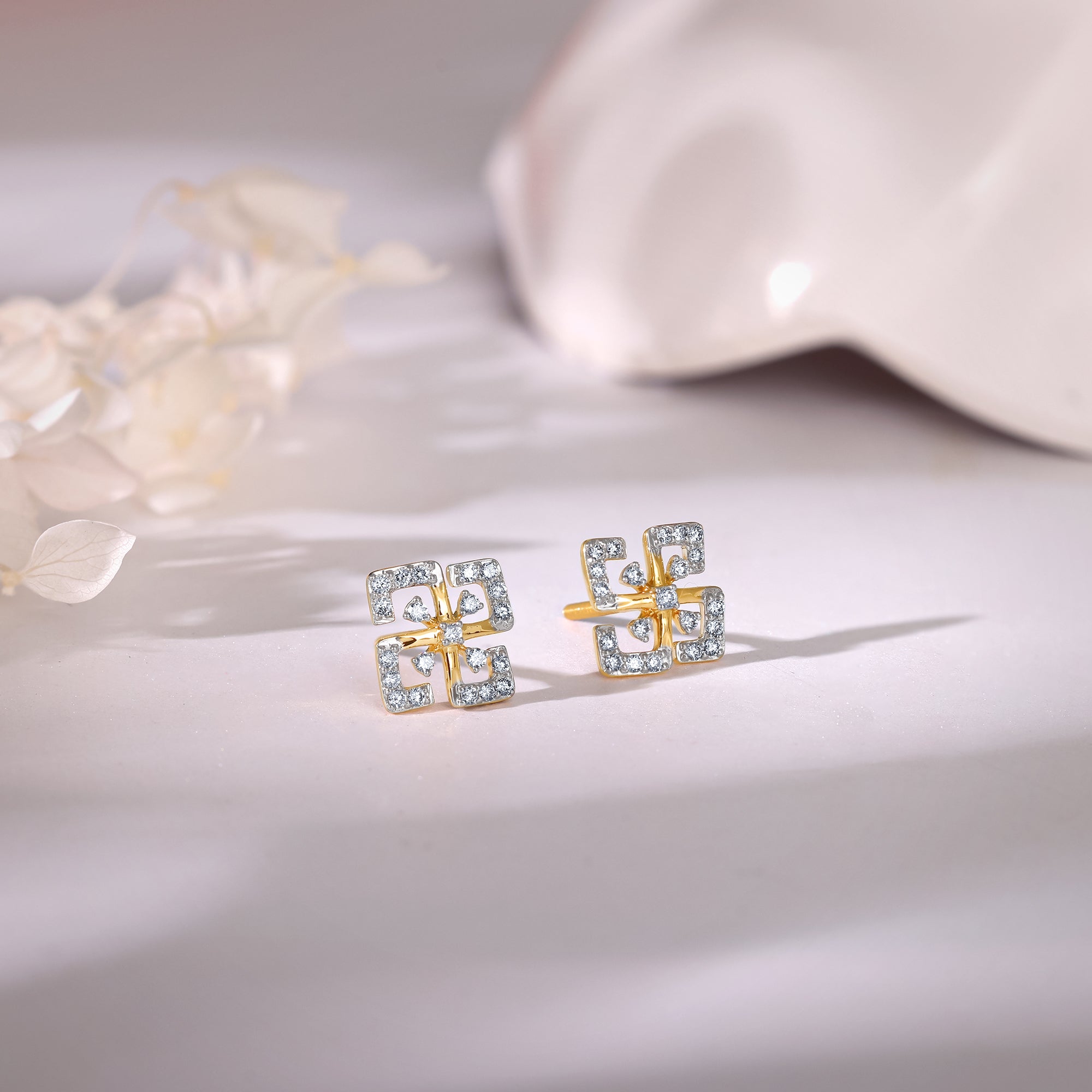 These gold earrings feature a square-shaped floral motif, studded with lab-grown diamonds.