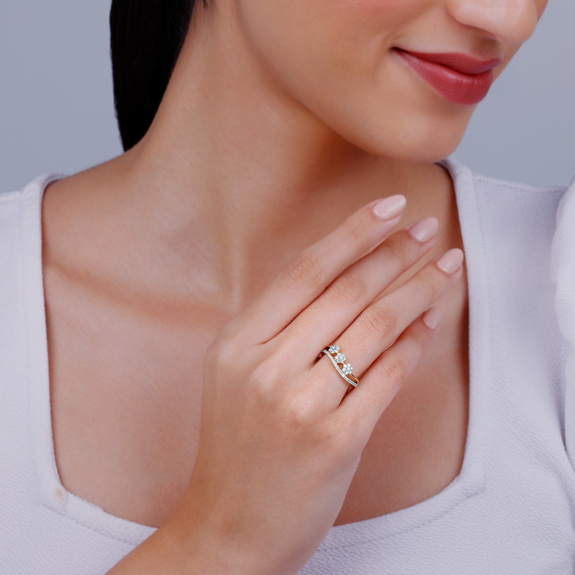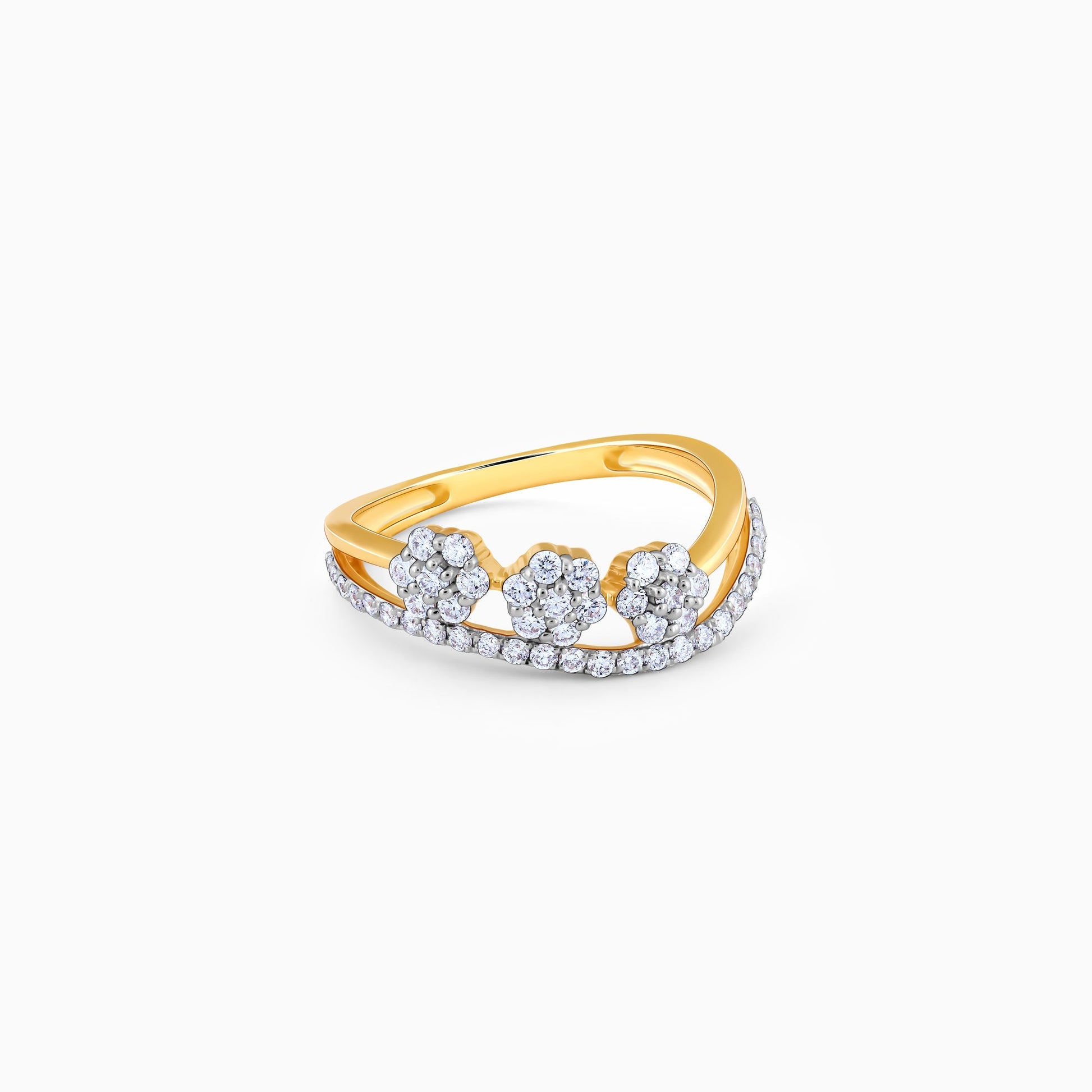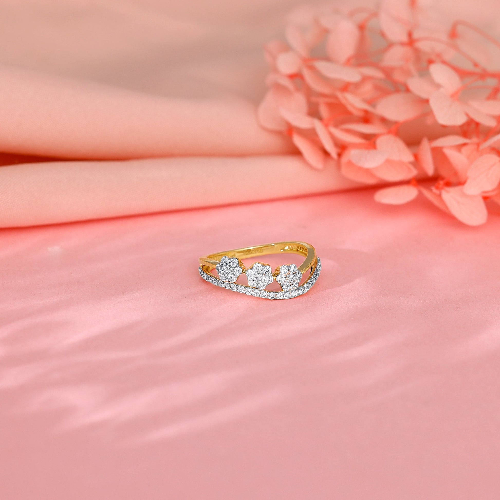 This ring features three floral motifs studded with lab diamonds and underlined with another row of diamond sparkle. The gold band follows an asymmetrical design.