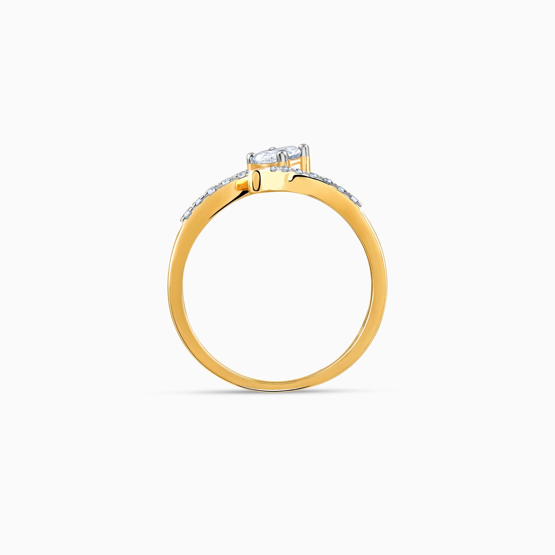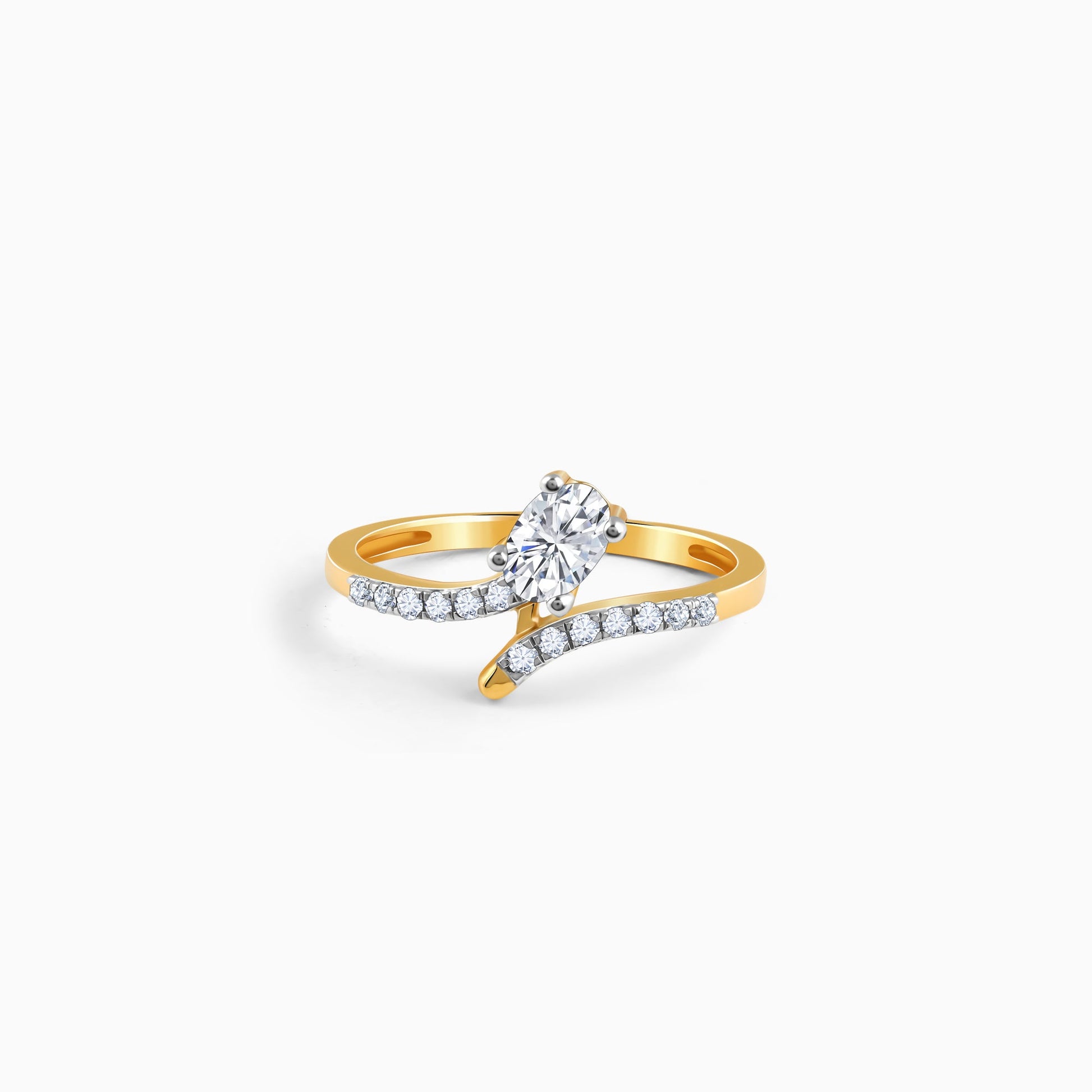 This pure gold ring for women features an oval cut solitaire diamond on a bypass band, partially studded with lab grown diamonds in a pave setting.