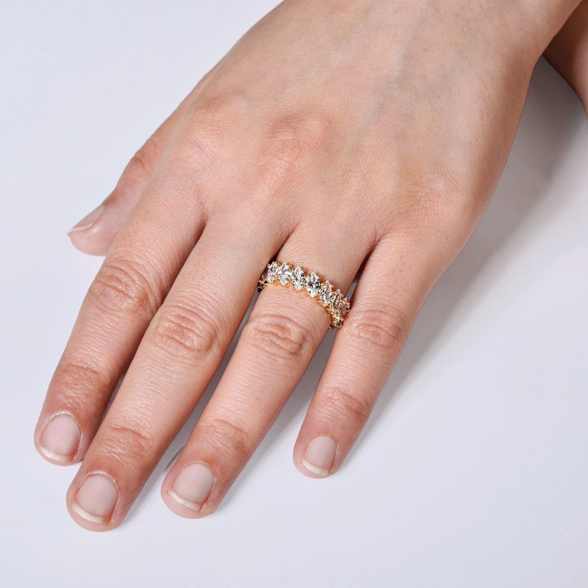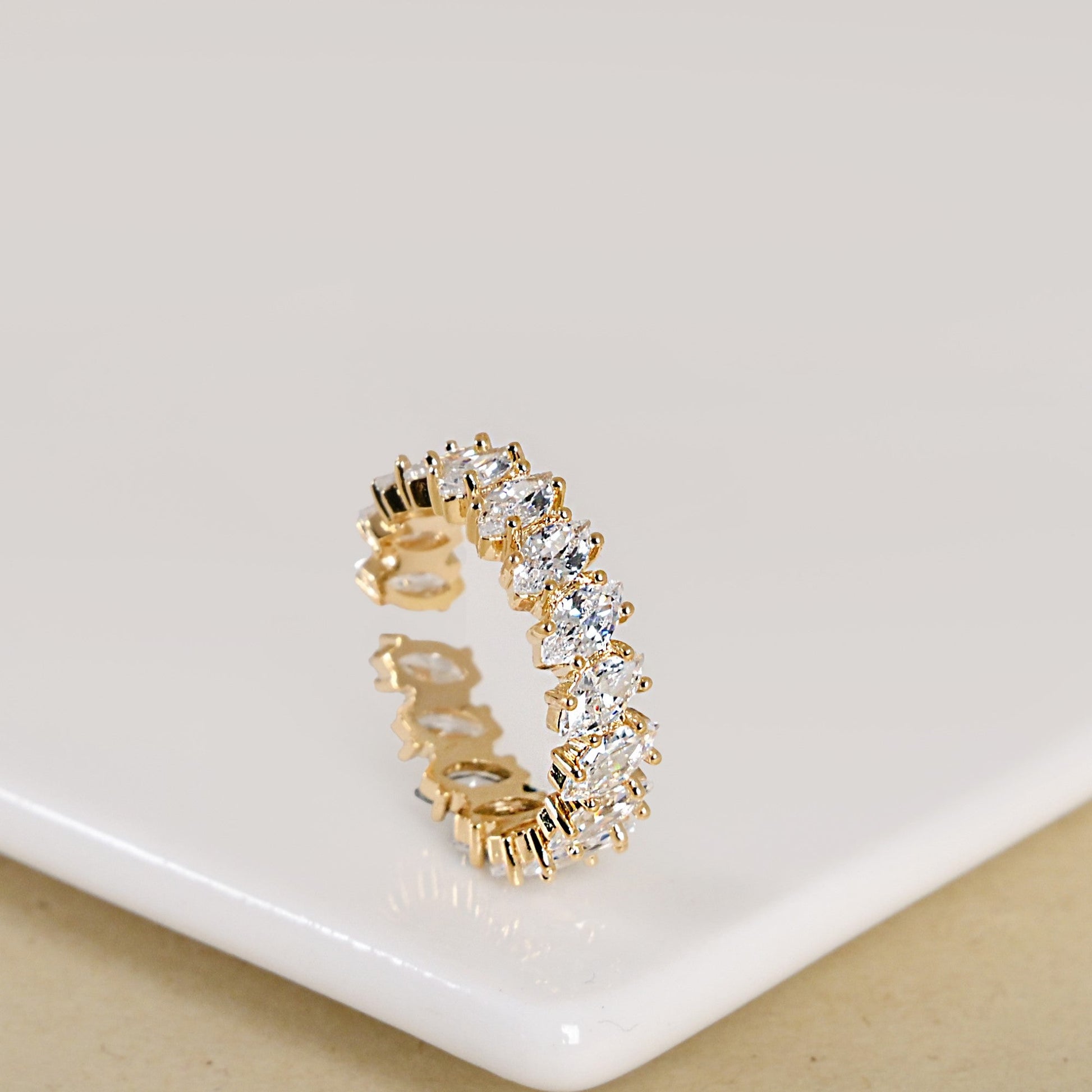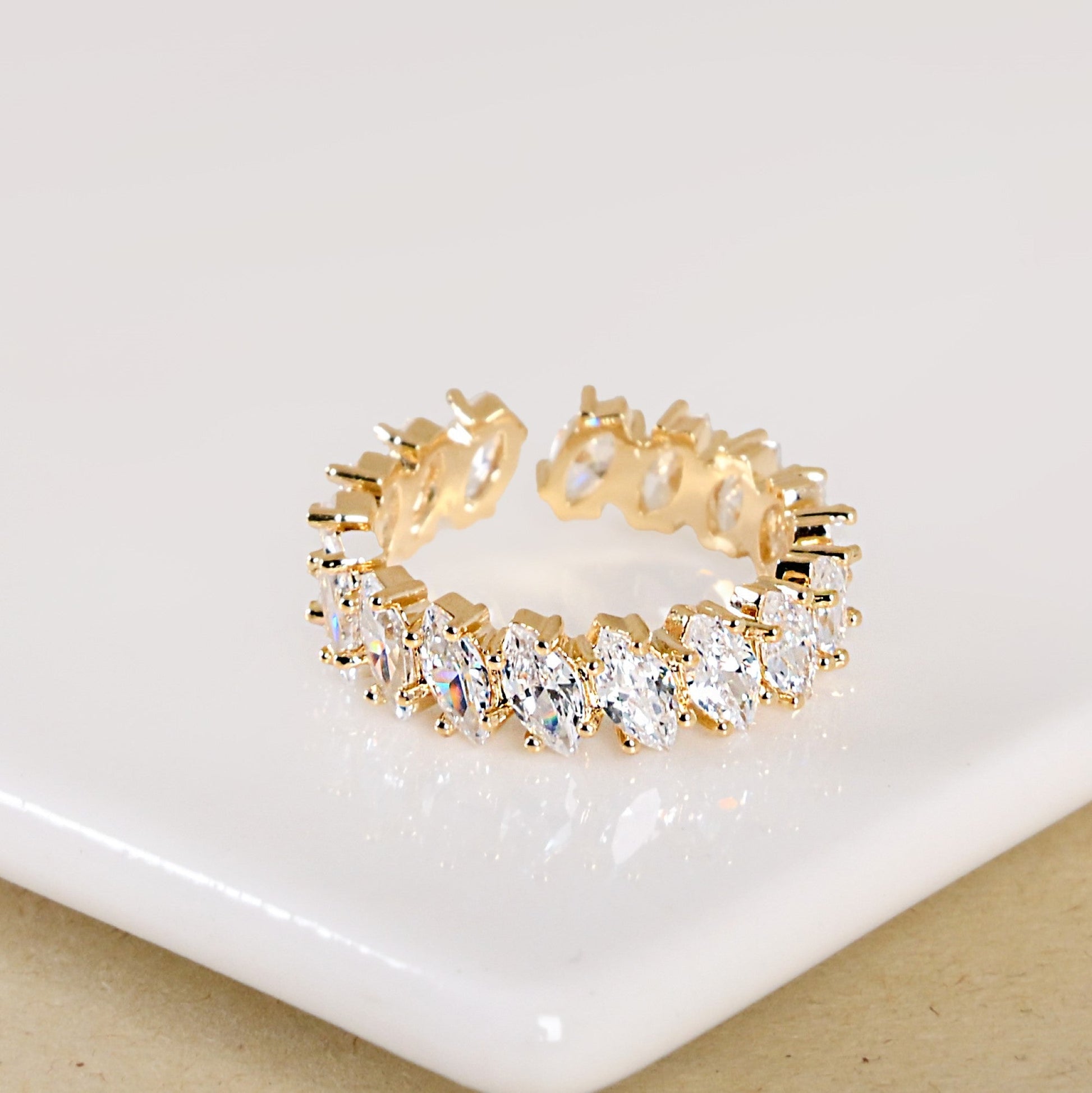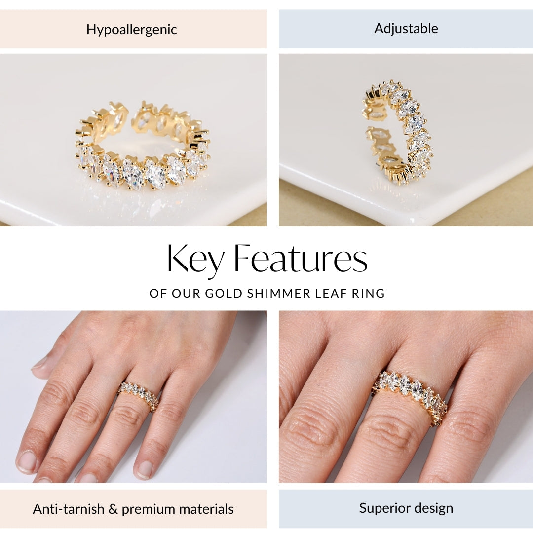Like sunlight dancing on golden leaves, this ring is pure enchantment. Set on a warm gold-toned base, its shimmering stones are arranged in an intricate leaf-like pattern, bringing nature’s beauty to your fingertips. The slightly slanted placement of each stone creates a soft, flowing effect—almost as if the design is swaying with your every move. Delicate yet dazzling, timeless yet full of life—this is the kind of piece that feels like a little bit of magic, no matter how you wear it.