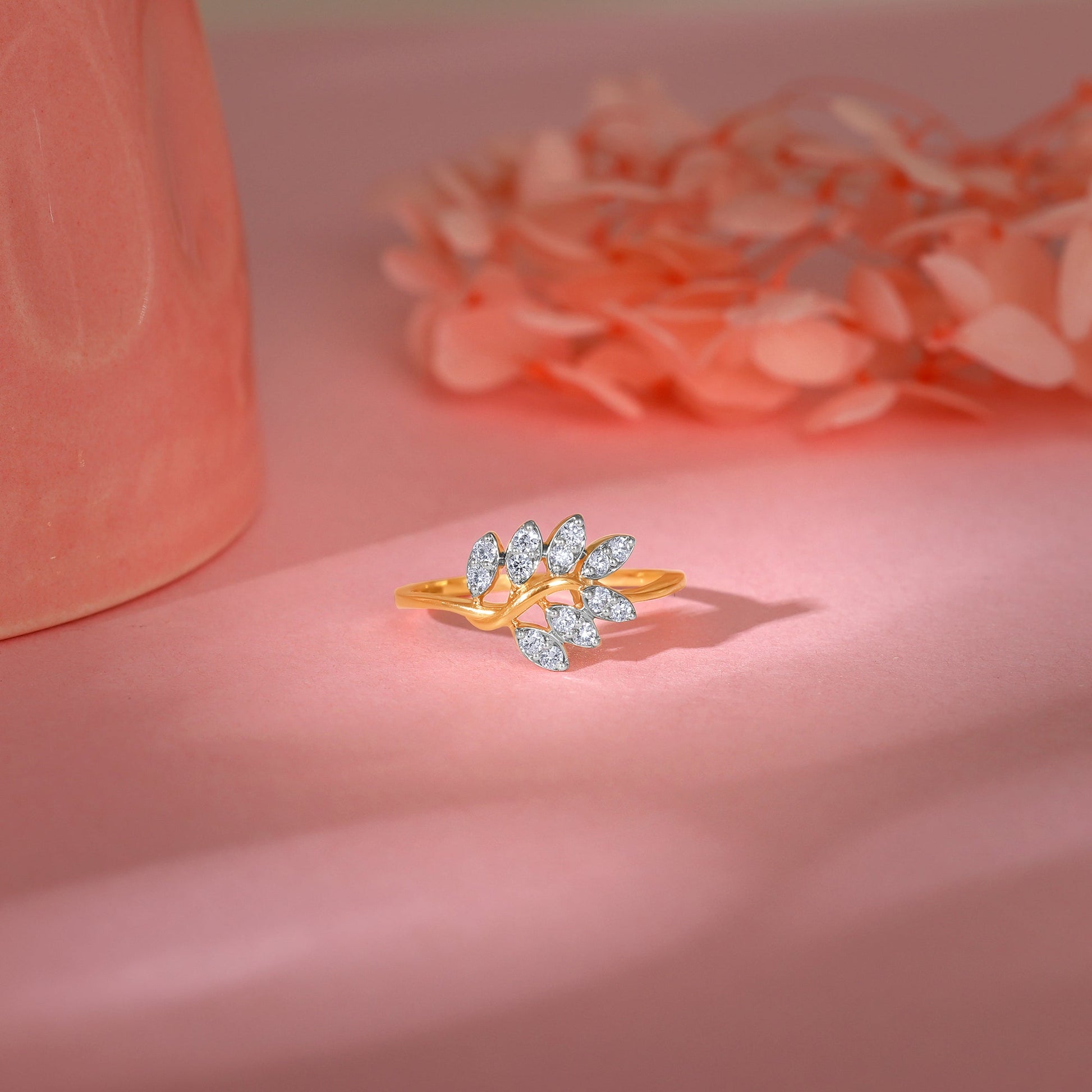 This beautiful ring has a minimal gold band with a leafy branch-like motif, studded with lab-grown diamonds.