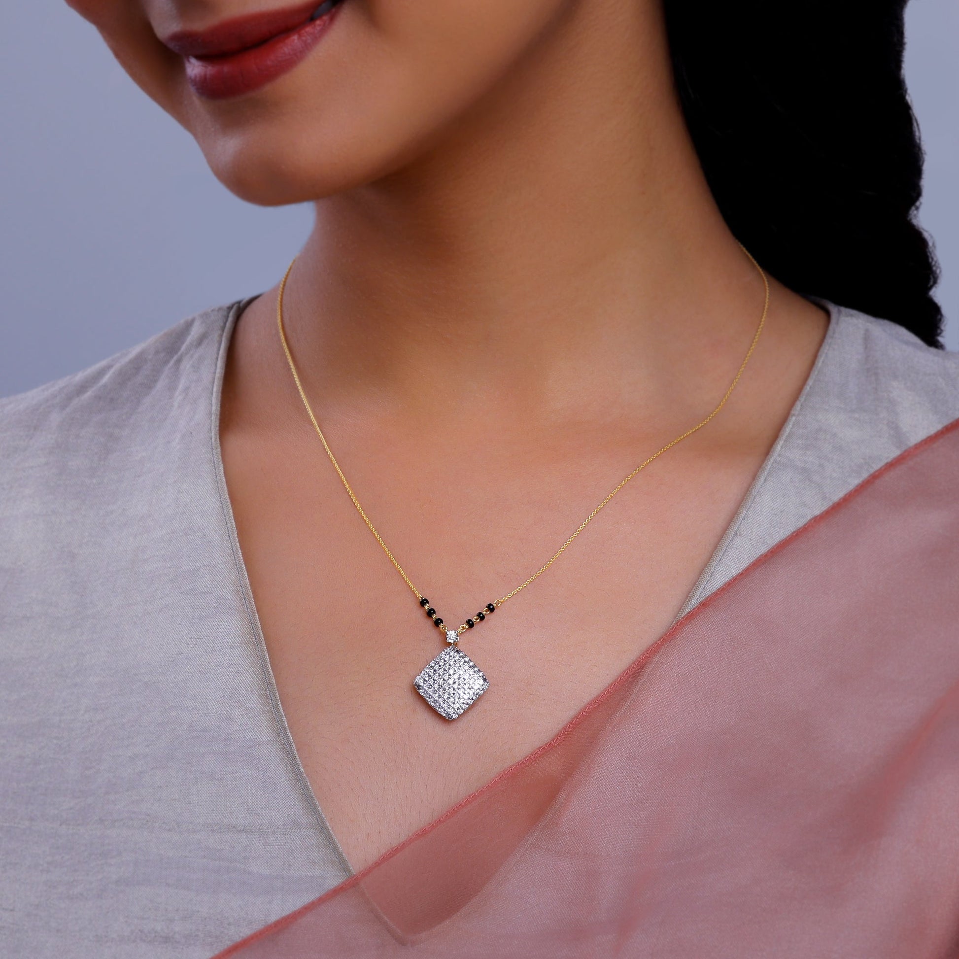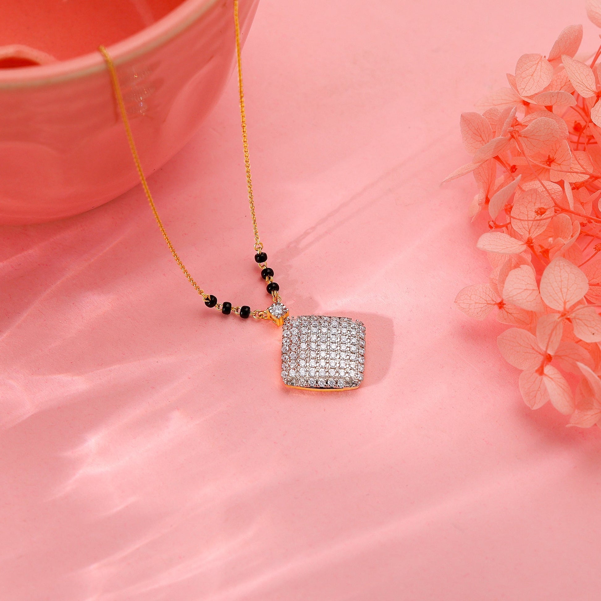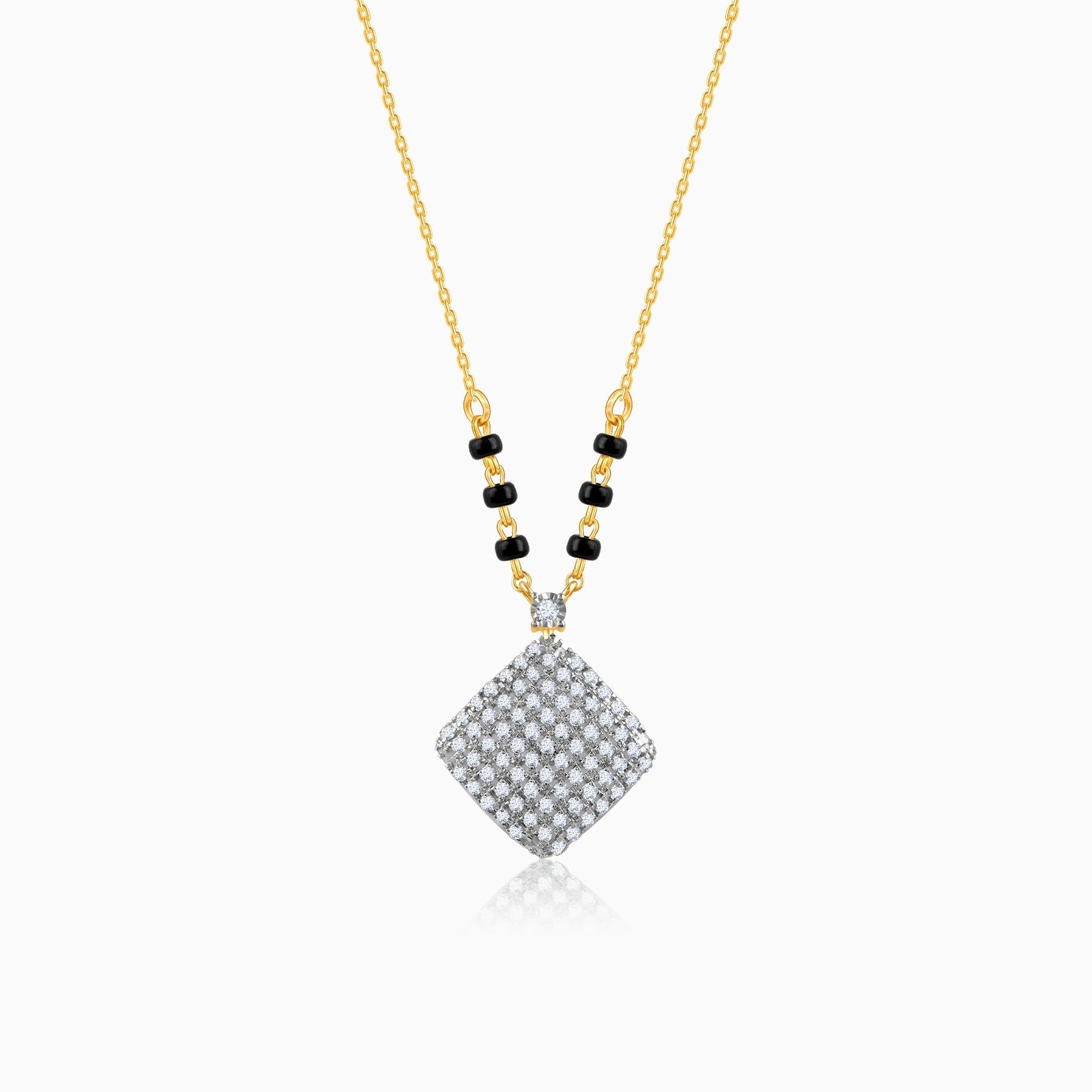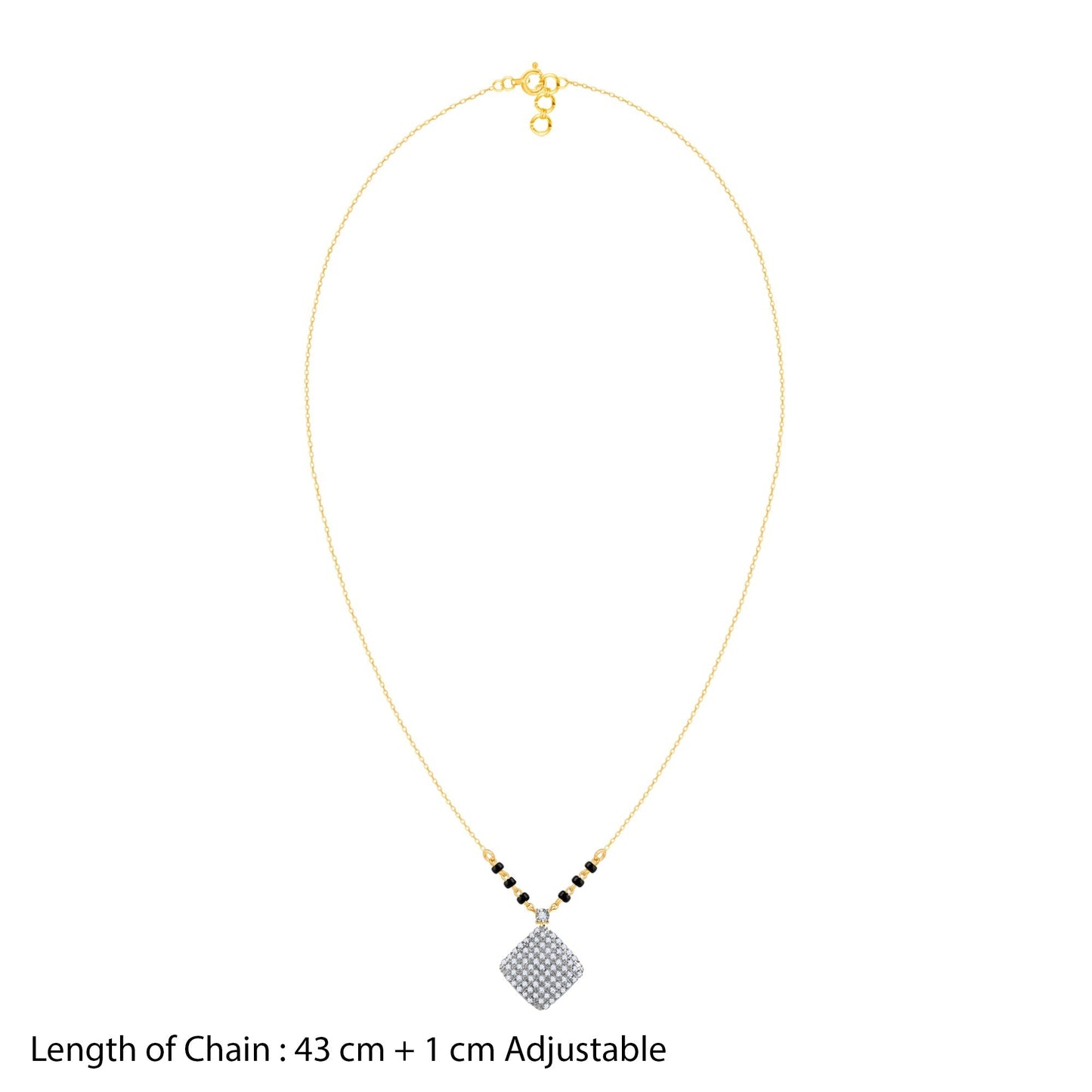 This gold mangalsutra has a rhombus pendant studded with lab-grown diamonds. The gold chain has three black beads on either side.